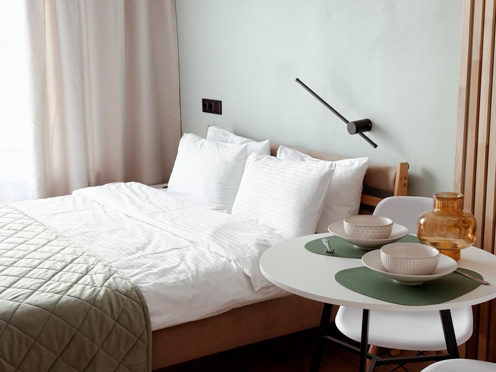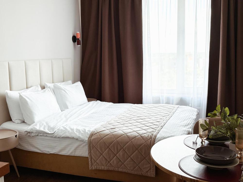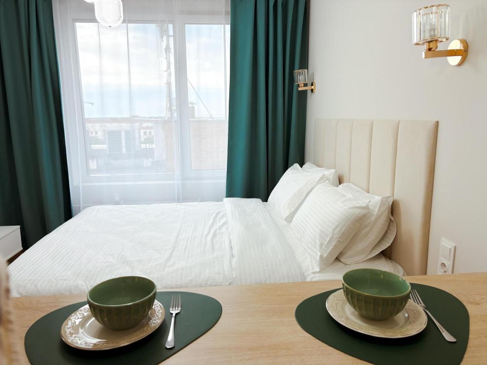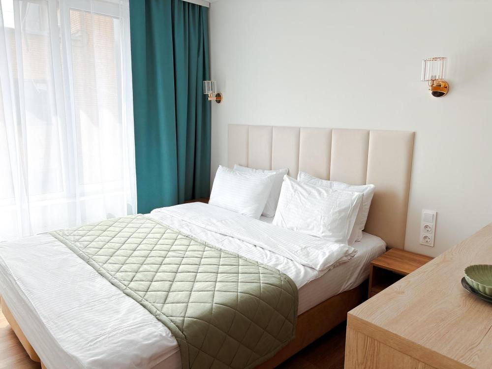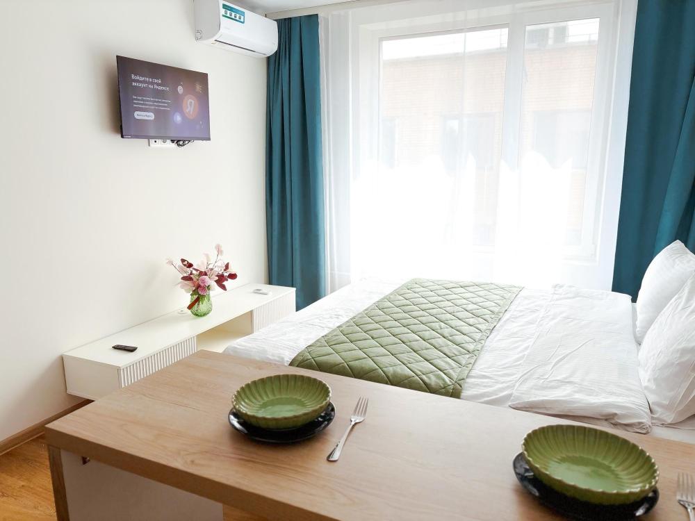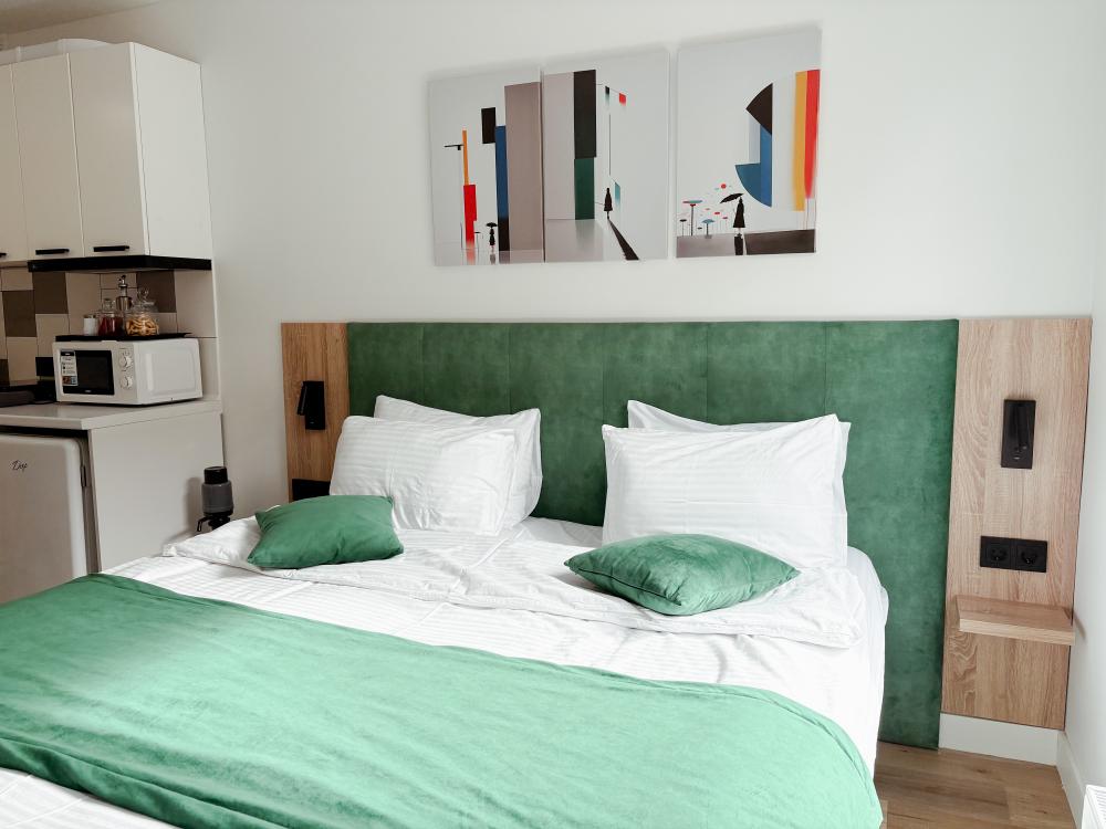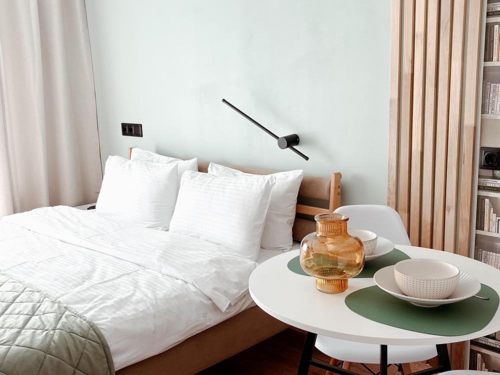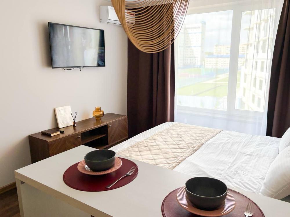 Уютные апартаменты студия. В апартаментах возможно как размещение с двуспальной кроватью, так и размещение с раздельными кроватями. Качественный текстиль, интернет и телевидение (ULTRA HD), стиральная машина, кондиционер, шторы настоящий блэкаут. Апартаменты полностью укомплектованы, чтобы гости могли получить максимальный комфорт. В апартаментах есть: утюг и гладильная доска, электрический чайник, холодильник, кондиционер, полотенца для тела, лица, гигиенический душ, гель для душа, качественный шампунь и кондиционер для волос, а также куча приятных мелочей как ватные диски, предметы гигиены и прочее.