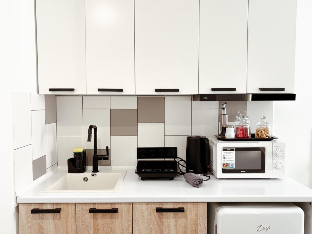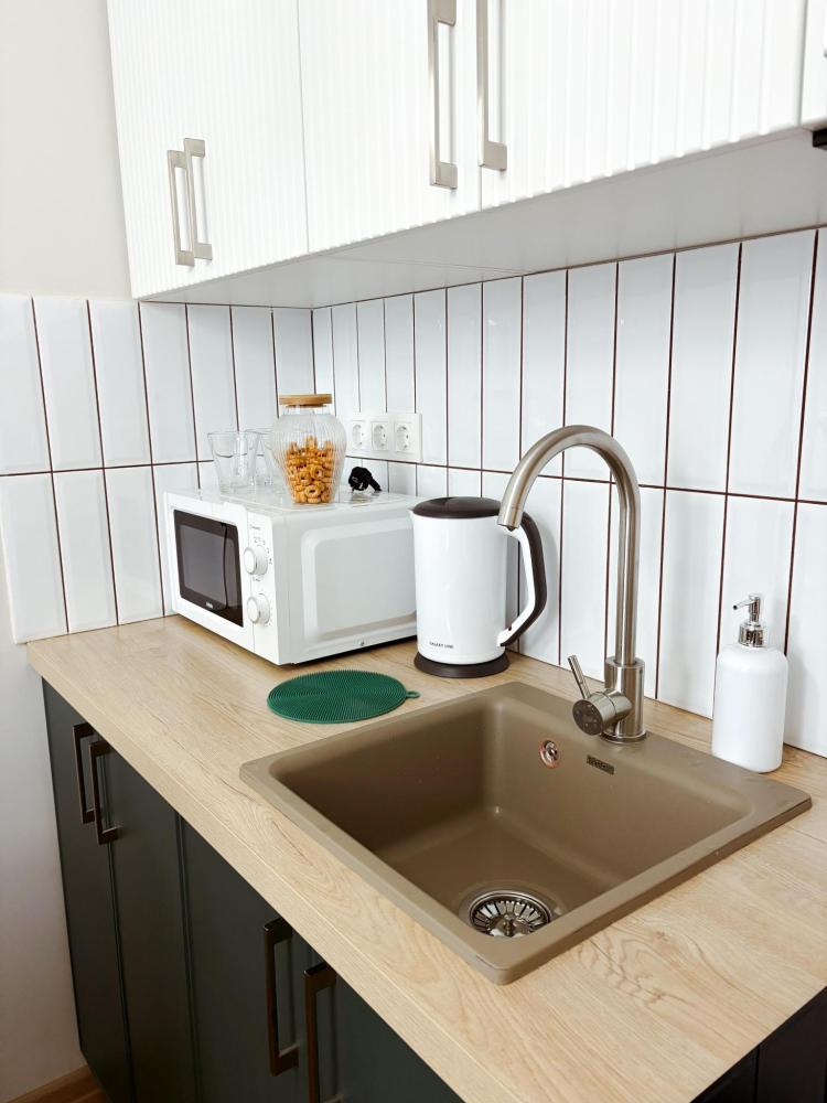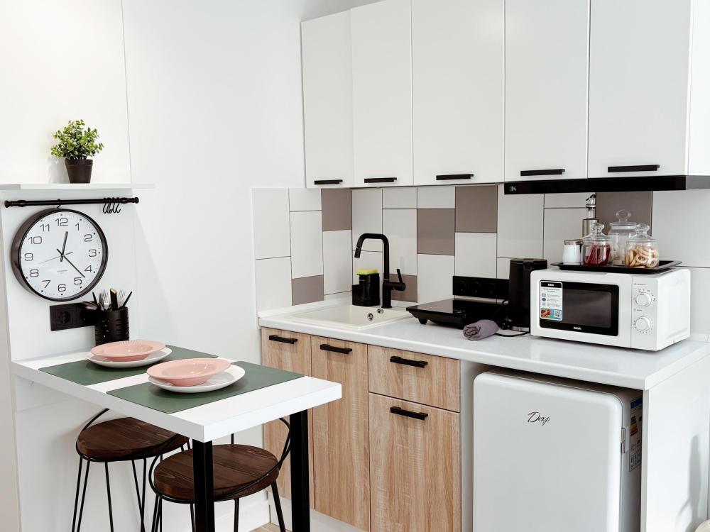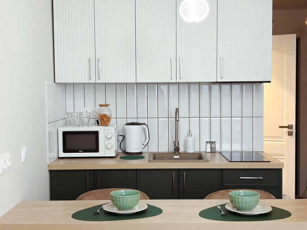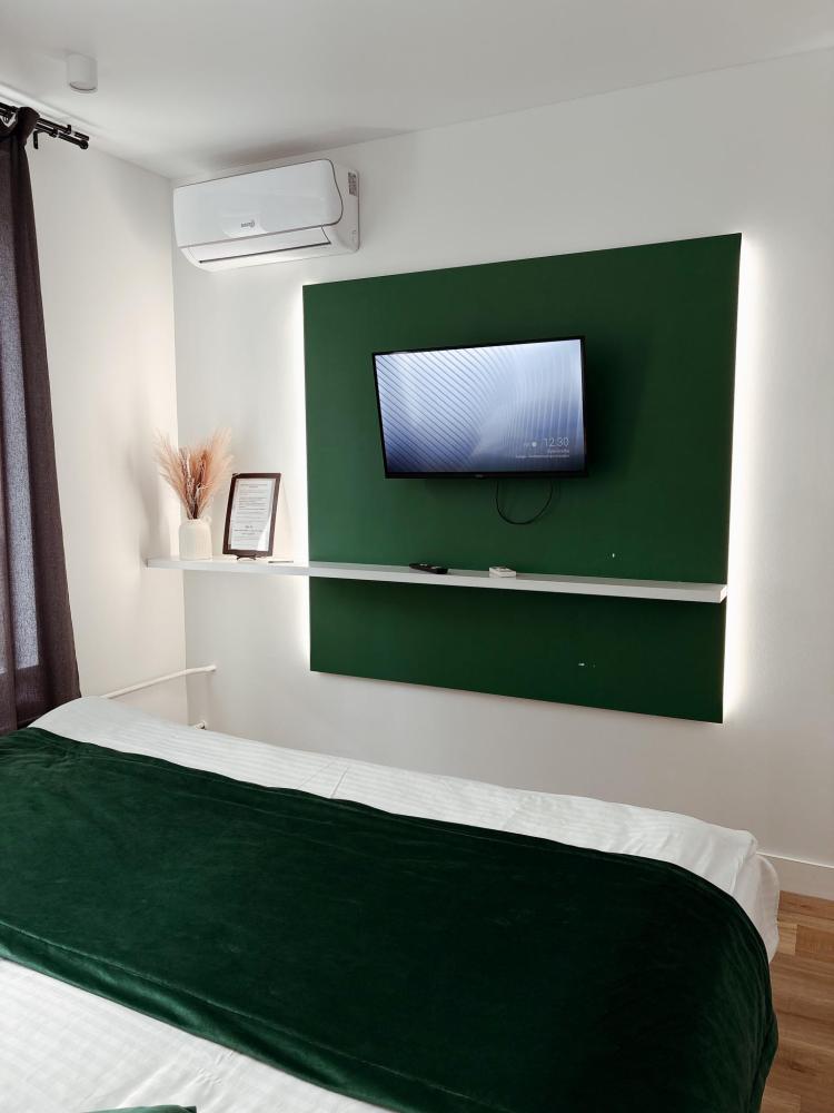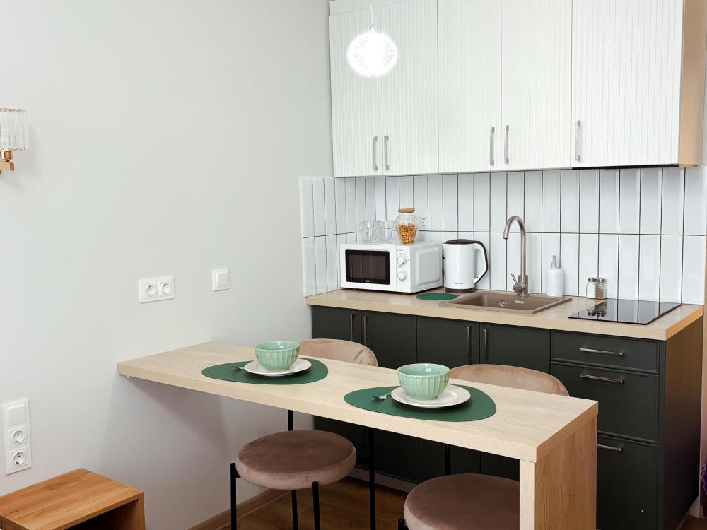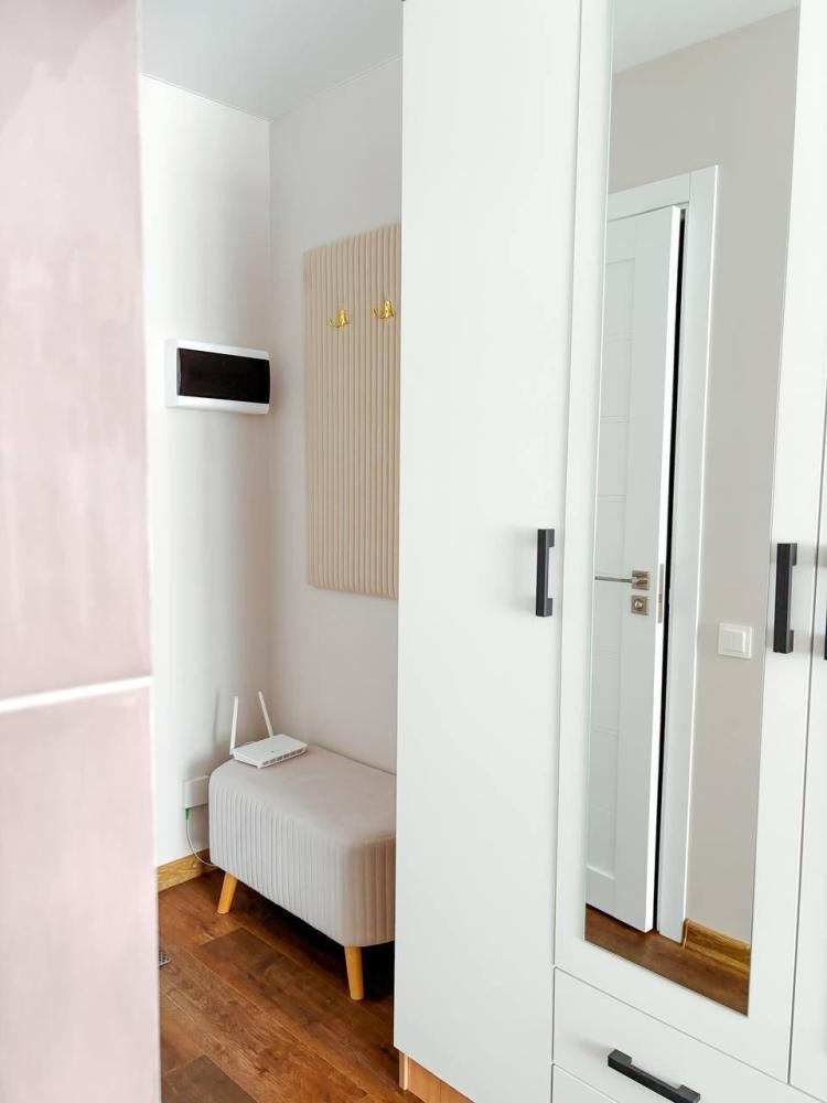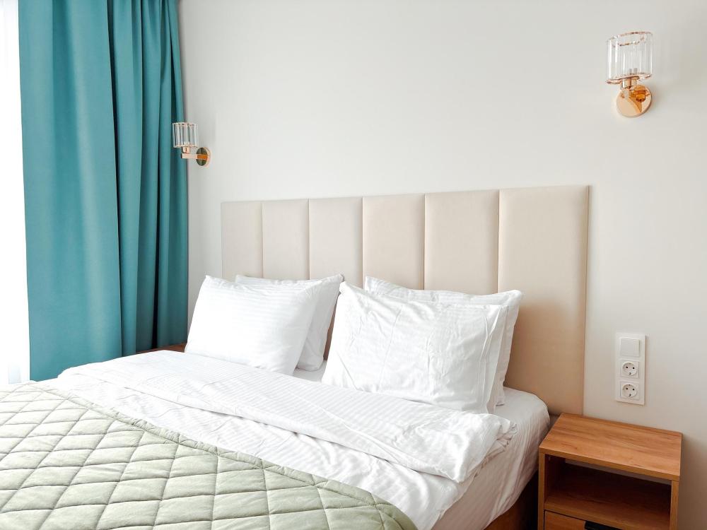 Уютные апартаменты студия. В апартаментах возможно как размещение с двуспальной кроватью, так и размещение с раздельными кроватями. Качественный текстиль, интернет и телевидение (ULTRA HD), стиральная машина, кондиционер, шторы настоящий блэкаут. Апартаменты полностью укомплектованы, чтобы гости могли получить максимальный комфорт. В апартаментах есть: утюг и гладильная доска, электрический чайник, холодильник, кондиционер, полотенца для тела, лица, гигиенический душ, гель для душа, качественный шампунь и кондиционер для волос, а также куча приятных мелочей как ватные диски, предметы гигиены и прочее.