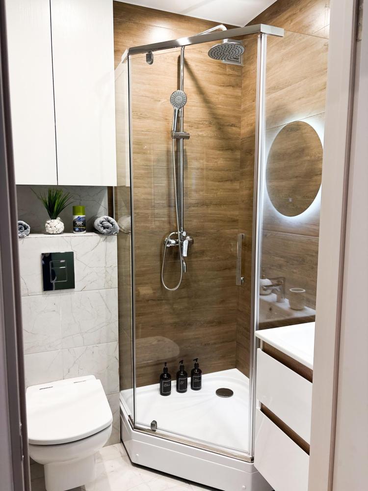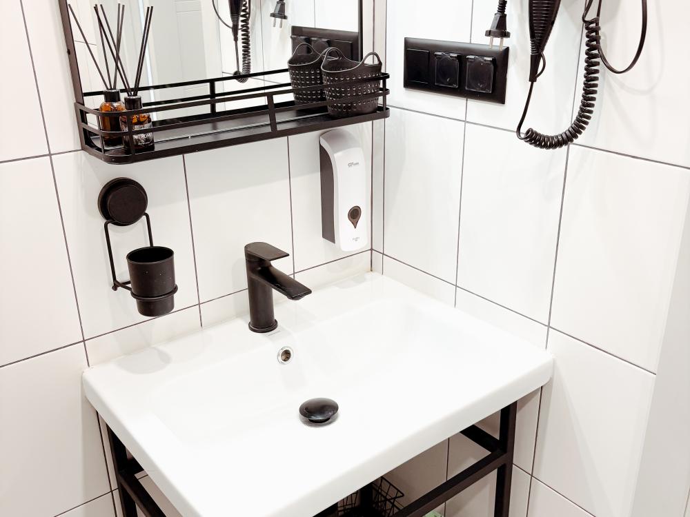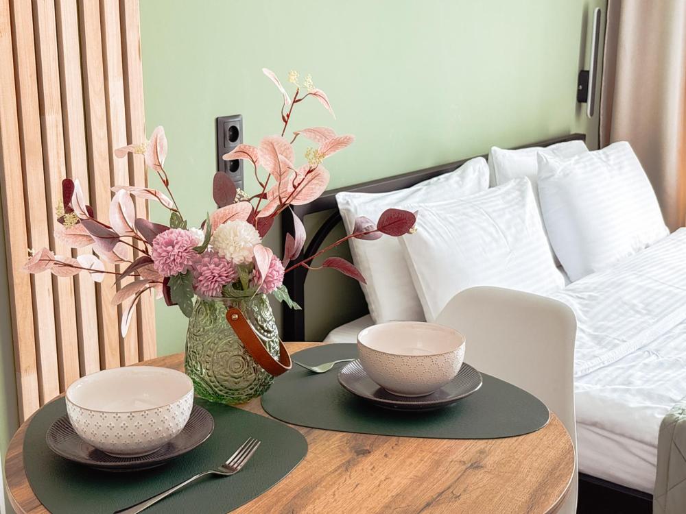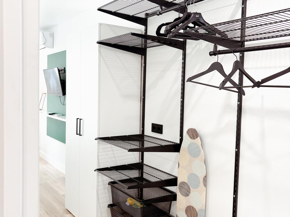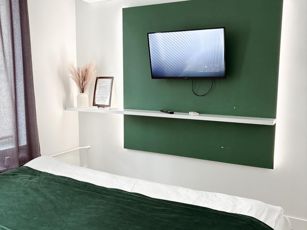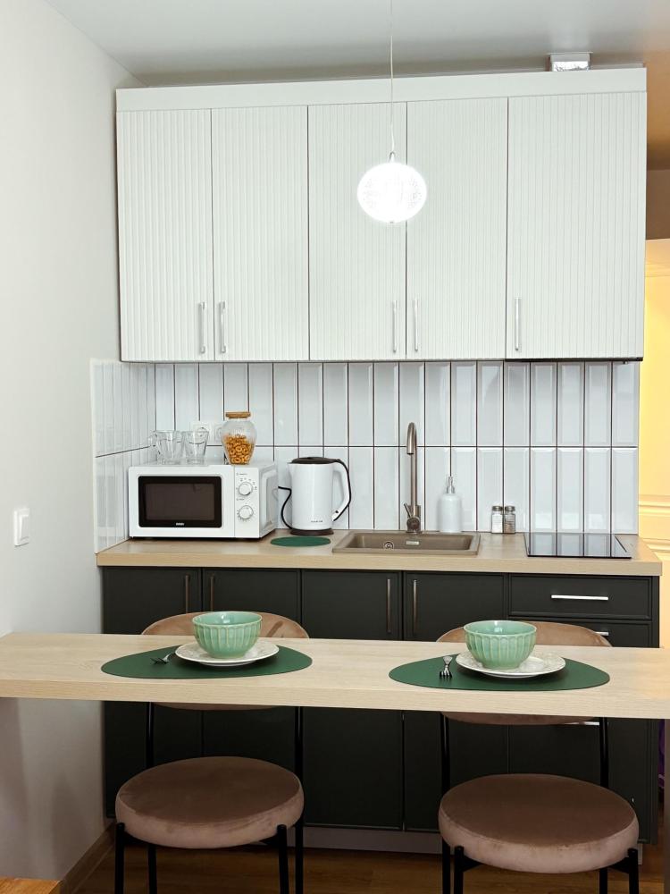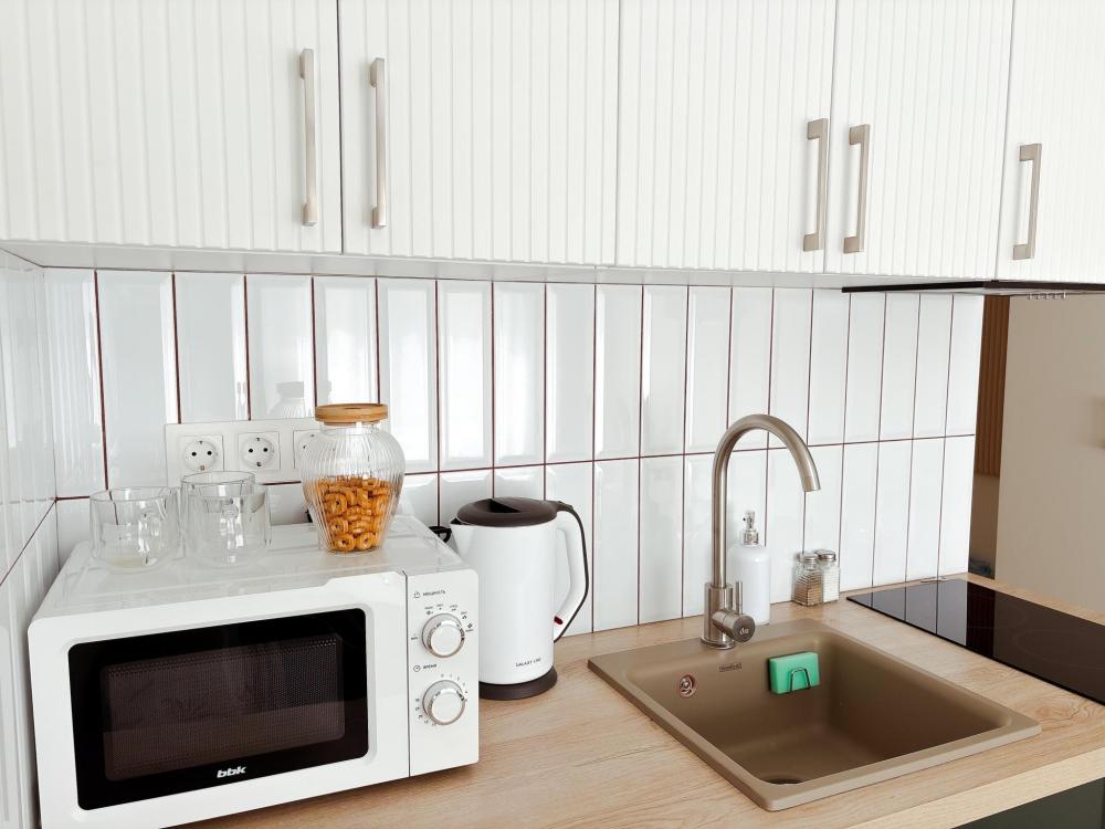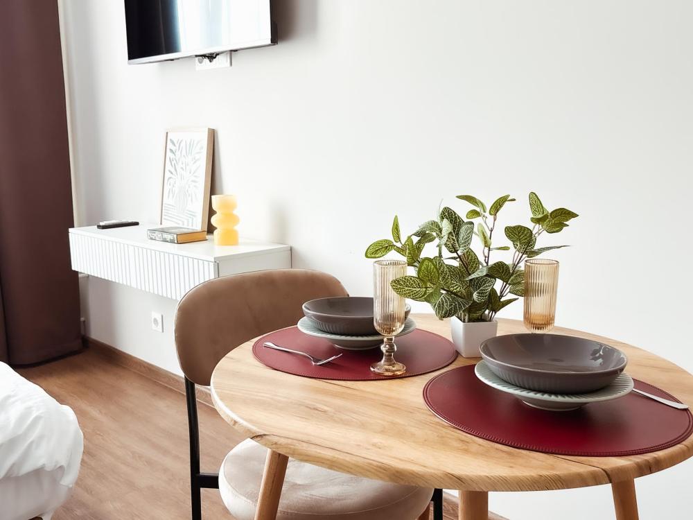 Уютные апартаменты студия. В апартаментах возможно как размещение с двуспальной кроватью, так и размещение с раздельными кроватями. Качественный текстиль, интернет и телевидение (ULTRA HD), стиральная машина, кондиционер, шторы настоящий блэкаут. Апартаменты полностью укомплектованы, чтобы гости могли получить максимальный комфорт. В апартаментах есть: утюг и гладильная доска, электрический чайник, холодильник, кондиционер, полотенца для тела, лица, гигиенический душ, гель для душа, качественный шампунь и кондиционер для волос, а также куча приятных мелочей как ватные диски, предметы гигиены и прочее.