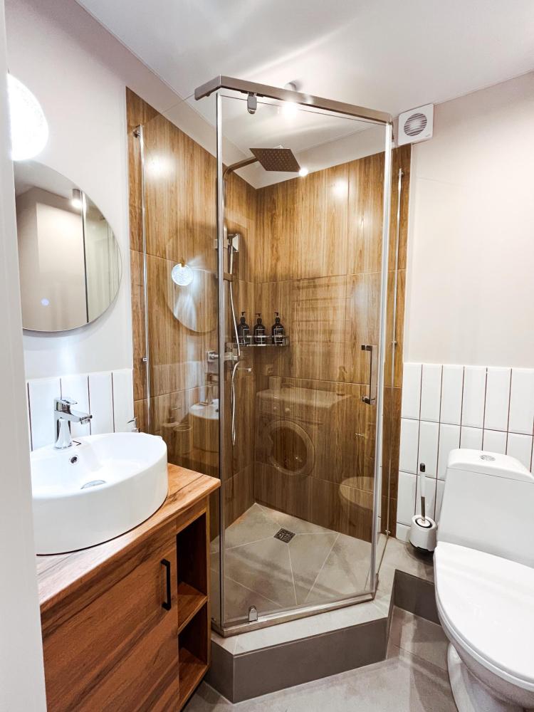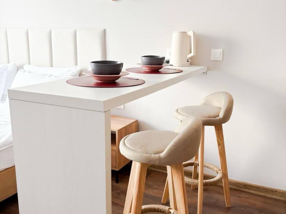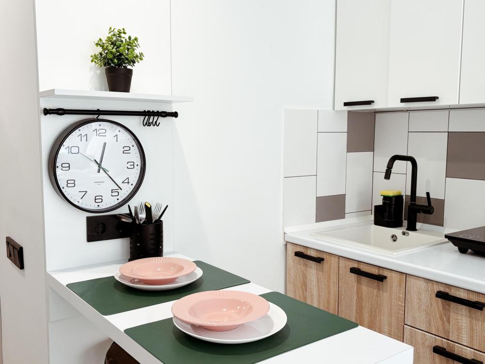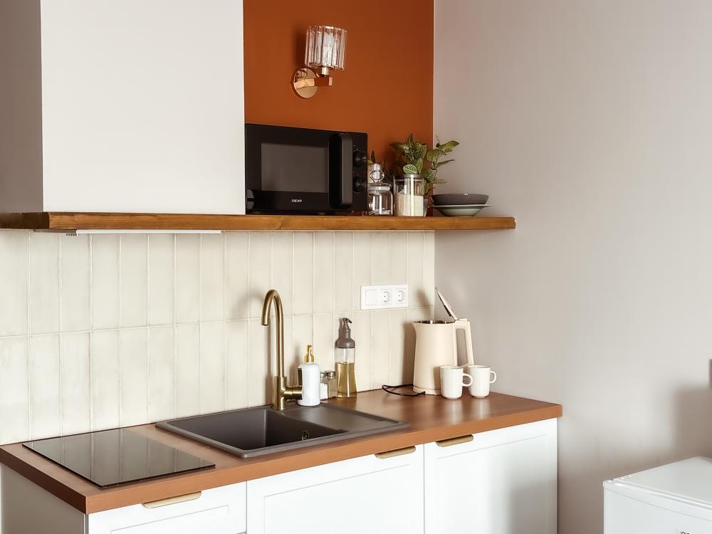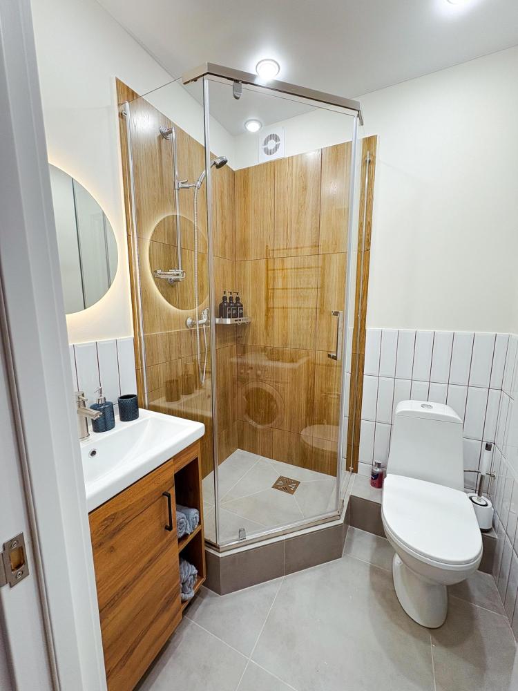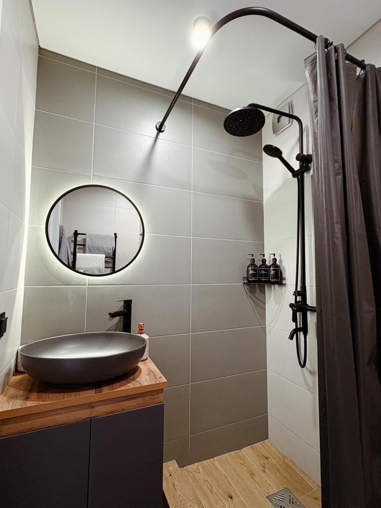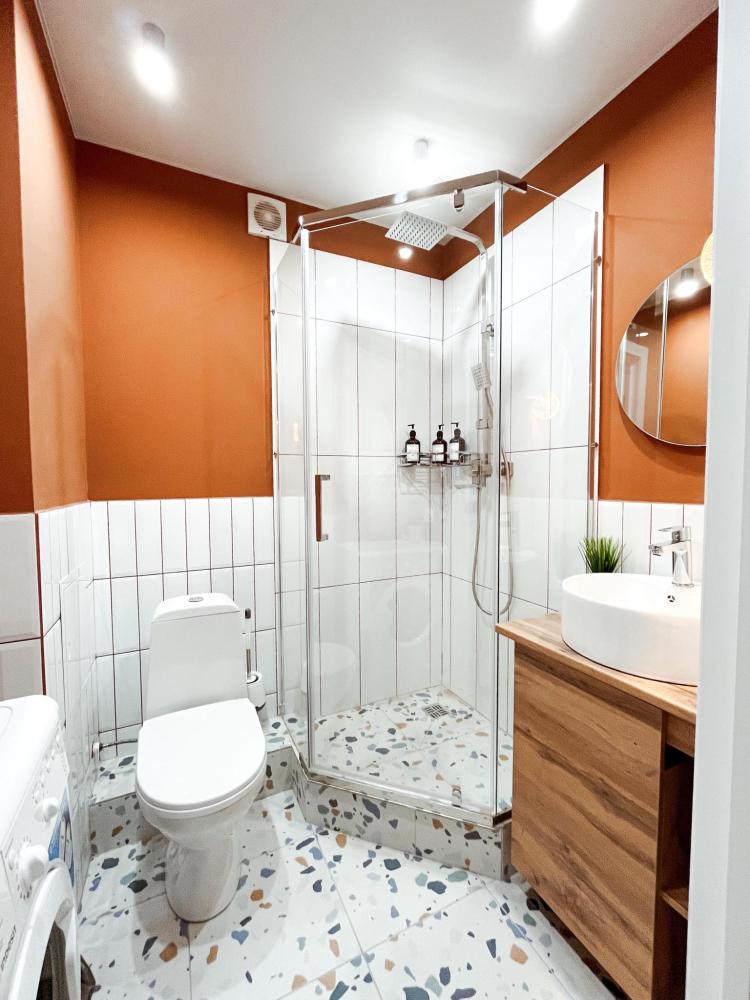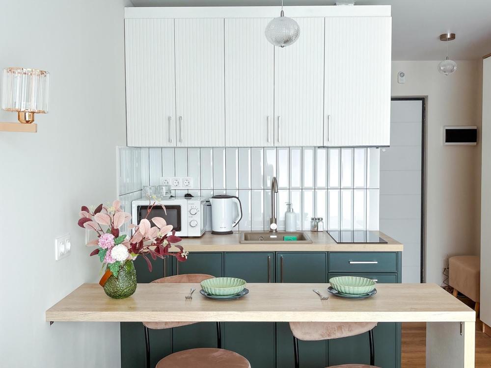 Уютные апартаменты студия. В апартаментах возможно как размещение с двуспальной кроватью, так и размещение с раздельными кроватями. Качественный текстиль, интернет и телевидение (ULTRA HD), стиральная машина, кондиционер, шторы настоящий блэкаут. Апартаменты полностью укомплектованы, чтобы гости могли получить максимальный комфорт. В апартаментах есть: утюг и гладильная доска, электрический чайник, холодильник, кондиционер, полотенца для тела, лица, гигиенический душ, гель для душа, качественный шампунь и кондиционер для волос, а также куча приятных мелочей как ватные диски, предметы гигиены и прочее.