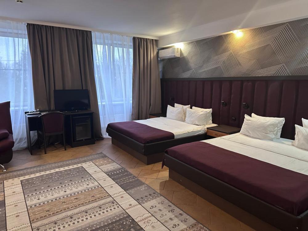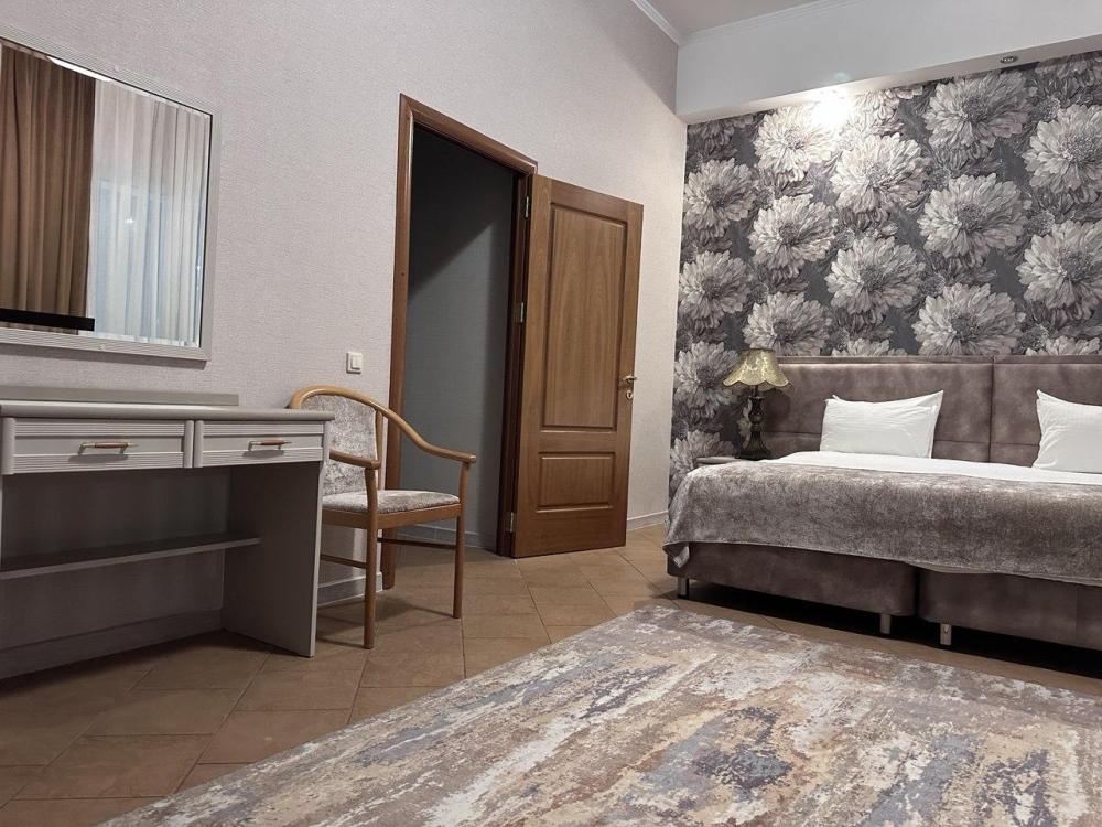 Семейный люкс с двумя комнатами, кроватью King Size (180×200) и диваном площадью 45 м² — этот светлый, просторный номер с двумя комнатами, предназначен для комфортного размещения семьи или компании. Номер оборудован всем необходимым: двуспальной кроватью и диваном, также возможно предоставление дополнительных мест. Каждый номер оснащен кондиционером, телевизором, мини-холодильником, чайником и чайными принадлежностями, кроватью с ортопедическим матрасом, диваном. Санузел оснащен ванной или душевой кабиной, туалетом, раковиной, а также полным комплектом полотенец и необходимыми косметическими принадлежностями: жидкое мыло, шампунь, гель для душа, зубной набор. Уборка номеров проводится ежедневно. Для удобства гостей предоставляются халаты и тапочки. Номер для некурящих. В случае, если Вы забыли дома предметы личной гигиены, обратитесь, пожалуйста, на стойку регистрации, и Администратор с радостью предоставит Вам такие косметические принадлежности как зубной набор, расческа, набор для бритья, шапочка для душа, швейный набор. Номера располагаются на 2, 3, 4 этажах комплекса. Лестница без лифта.