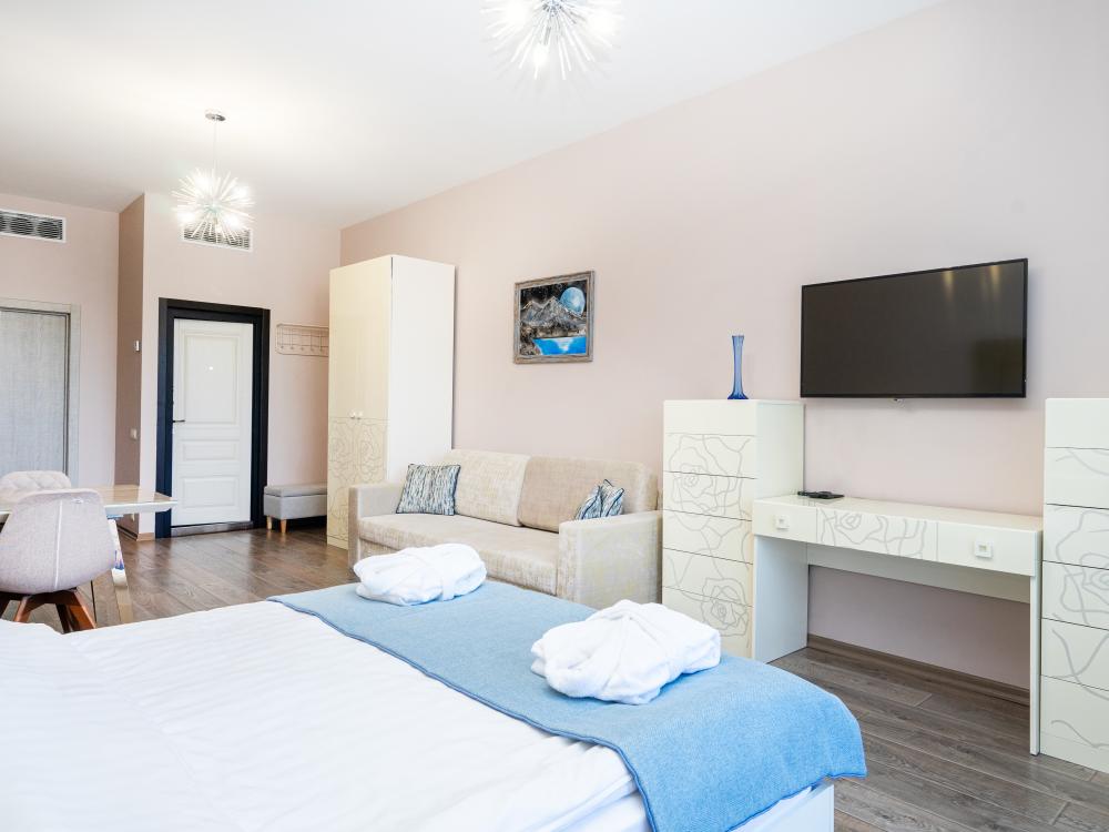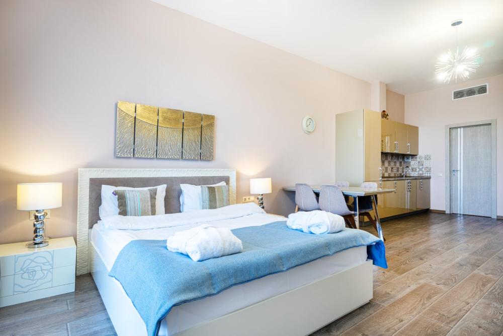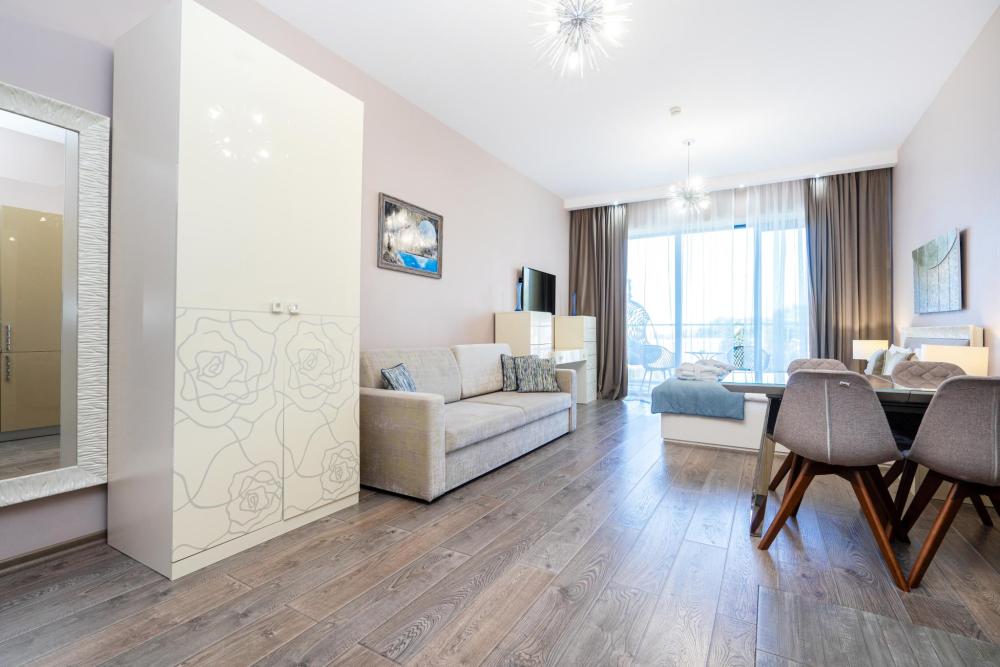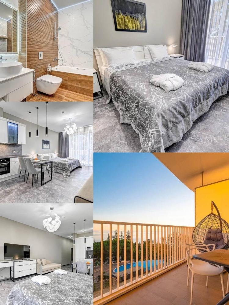 Стильные апартаменты в элитным ЖК Сочи - Actor Galaxy, который находится на первой береговой линии. Апартамент полностью оборудован всем необходимым: хороший фен, Wi-fi, средства личной гигиены, полотенца, тапочки. Для приготовления пищи в апартаменте есть все необходимое (посуда, техника). Все белье проходит качественную химическую чистку. Для гостей есть приватный пляж с небольшим количеством людей, бесплатное пляжное оборудование (лежаки, зонты). Гостям можно посещать открытый бассейн, который находится на территории ЖК, а зимой крытый бассейн с морской водой. На территории есть охраняемая парковка.