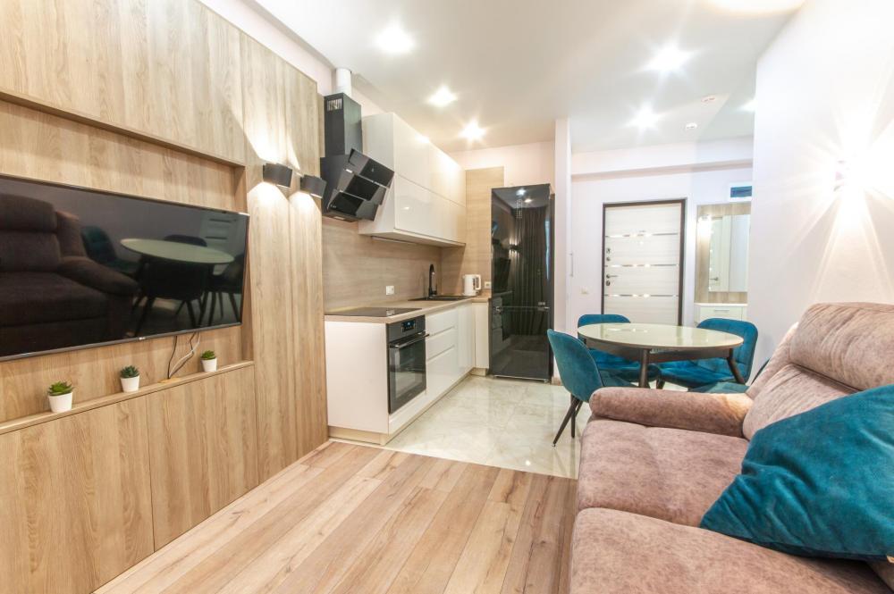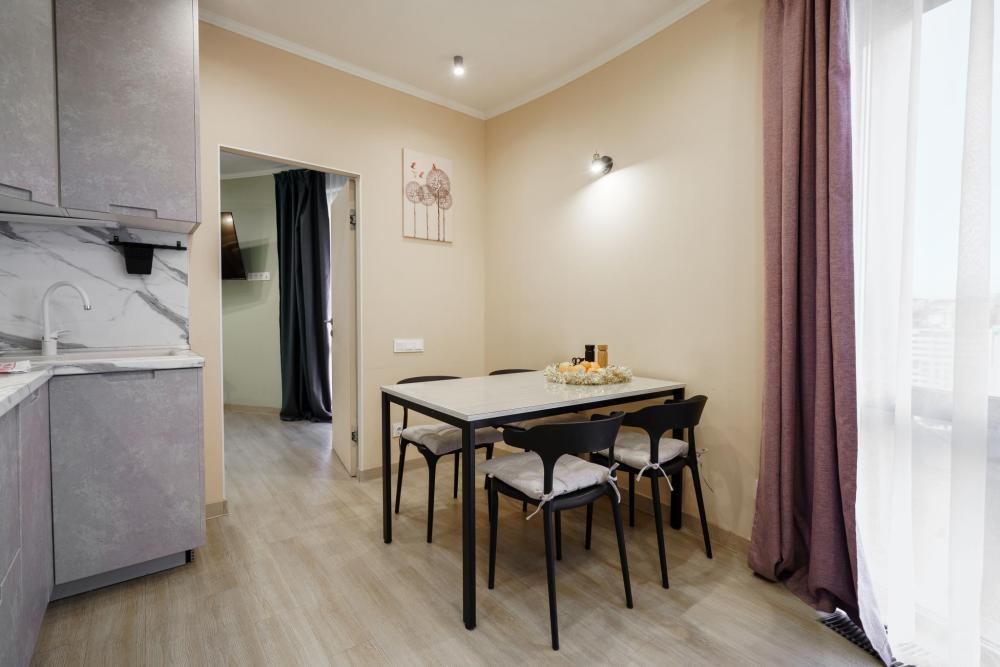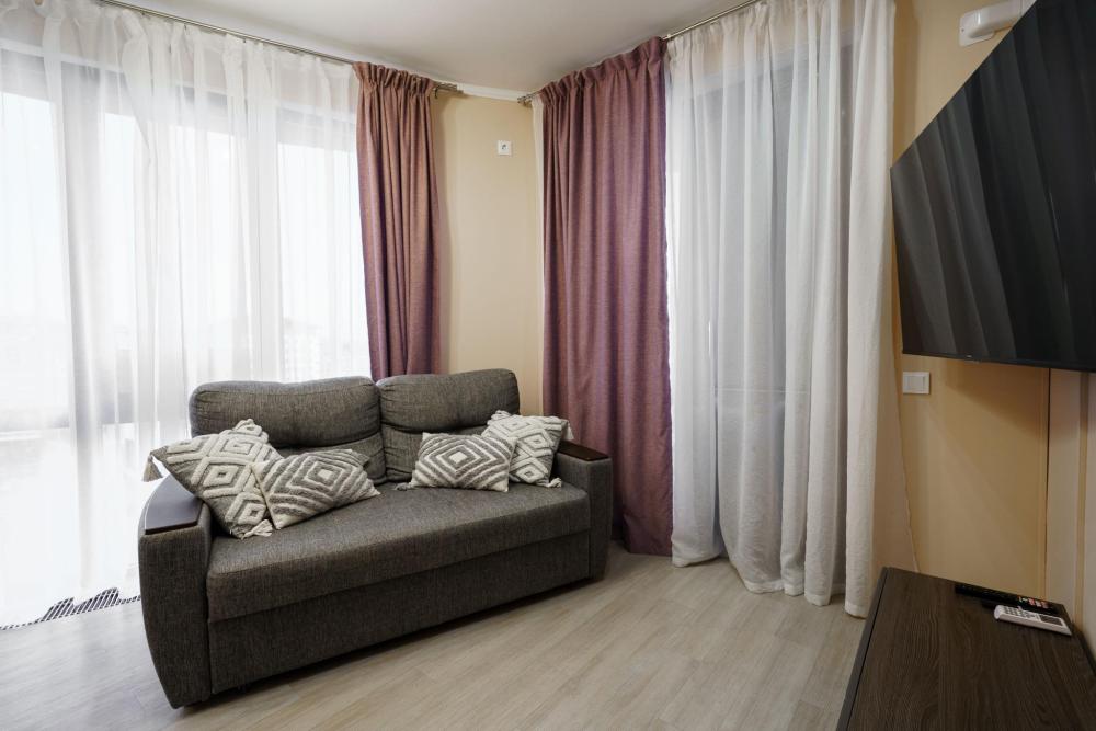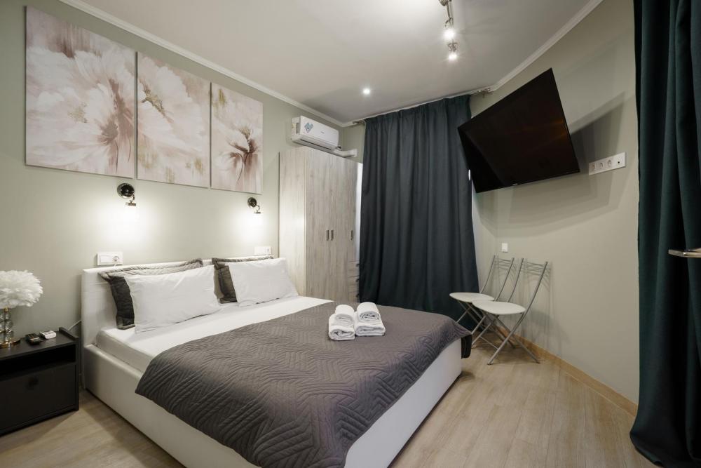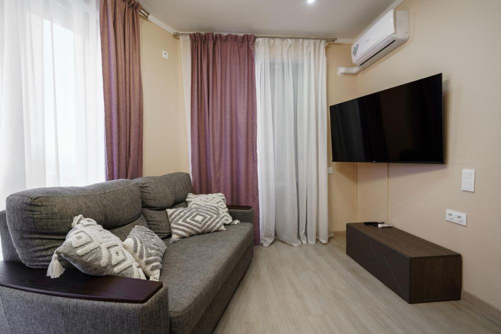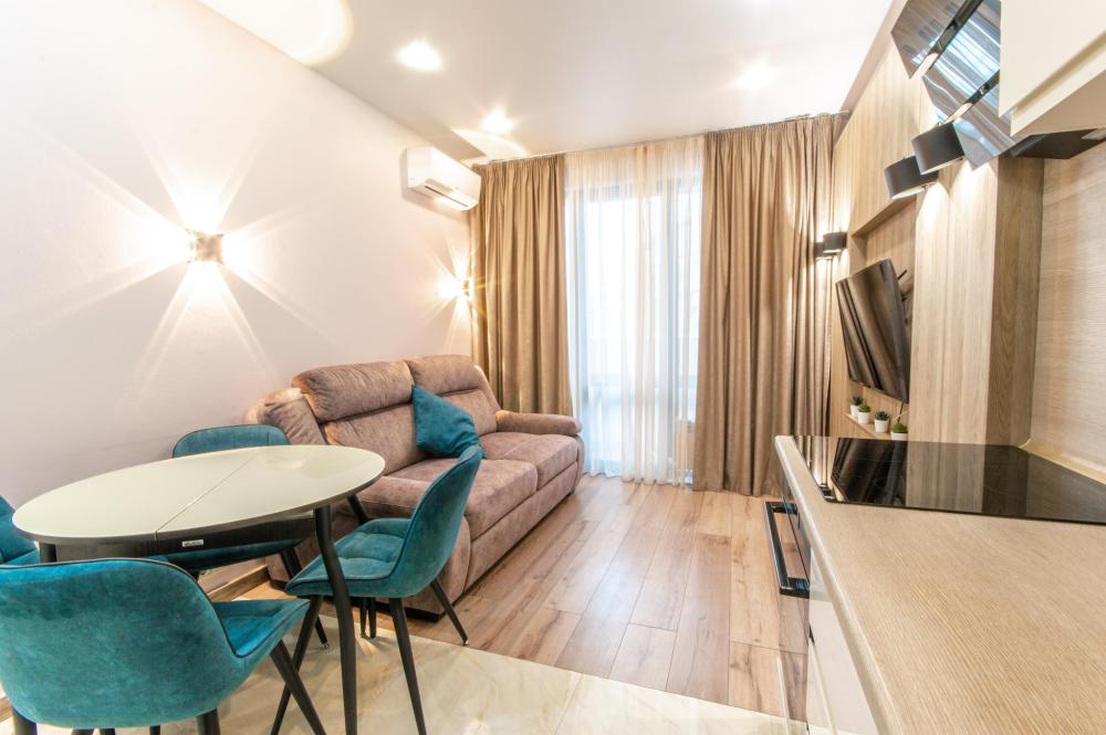 1-комнатные апартаменты улучшенные Квартира оборудована всем необходимым для комфортного проживания: двуспальная кровать, диван, кухонная зона, собственная ванная комната и туалет.