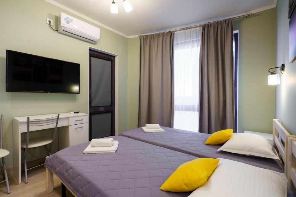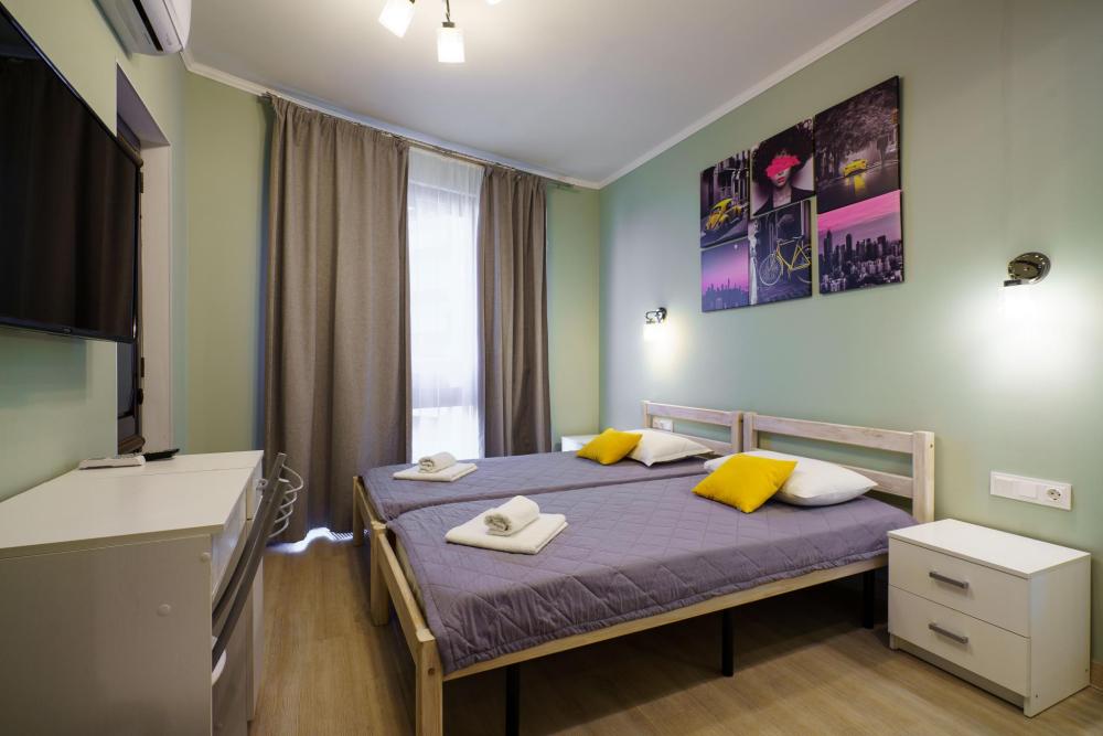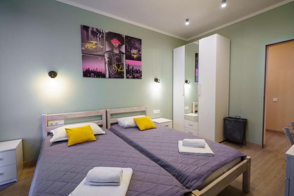 2-комнатные апартаменты стандарт Квартира оборудована всем необходимым для комфортного проживания: двуспальная кровать, односпальные кровати, диван, кухонная зона, собственная ванная комната и туалет.