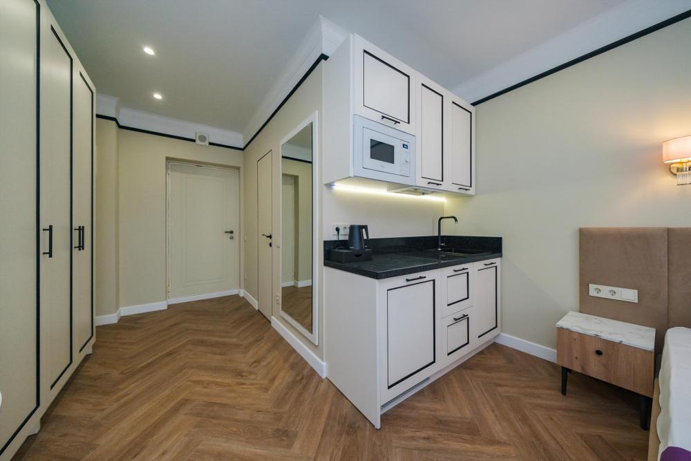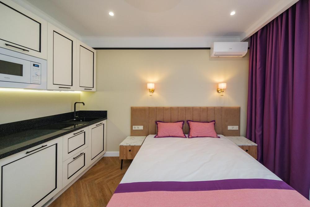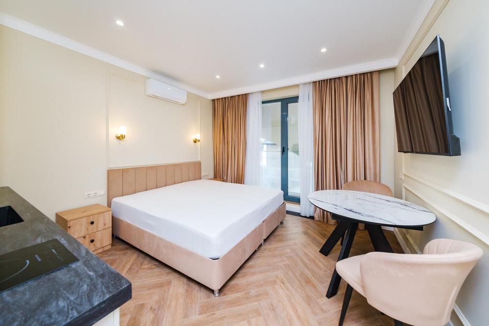 Апартаменты находятся во втором корпусе гостиничного комплекса Marine Garden. Основные характеристики: - кровать размера 180х200, из которой можно сделать 2 раздельные кровати; -дополнительное место (за доплату) - душ; - вид на море; - балкон. Высокоскоростной доступ к интернету по wi-fi Телефон LED телевизор Современная система контроля климата Фен