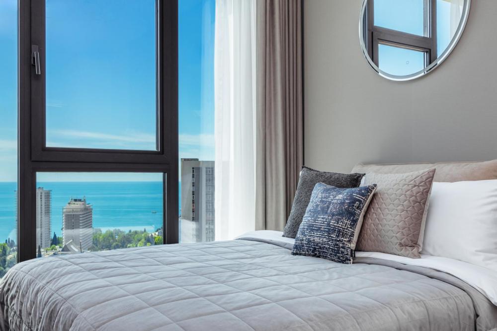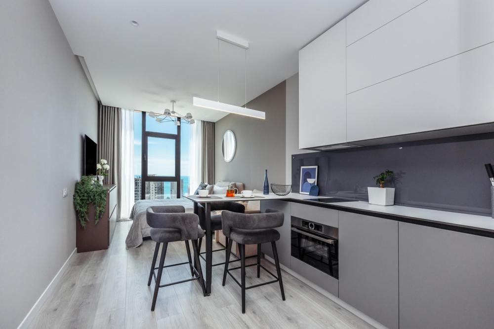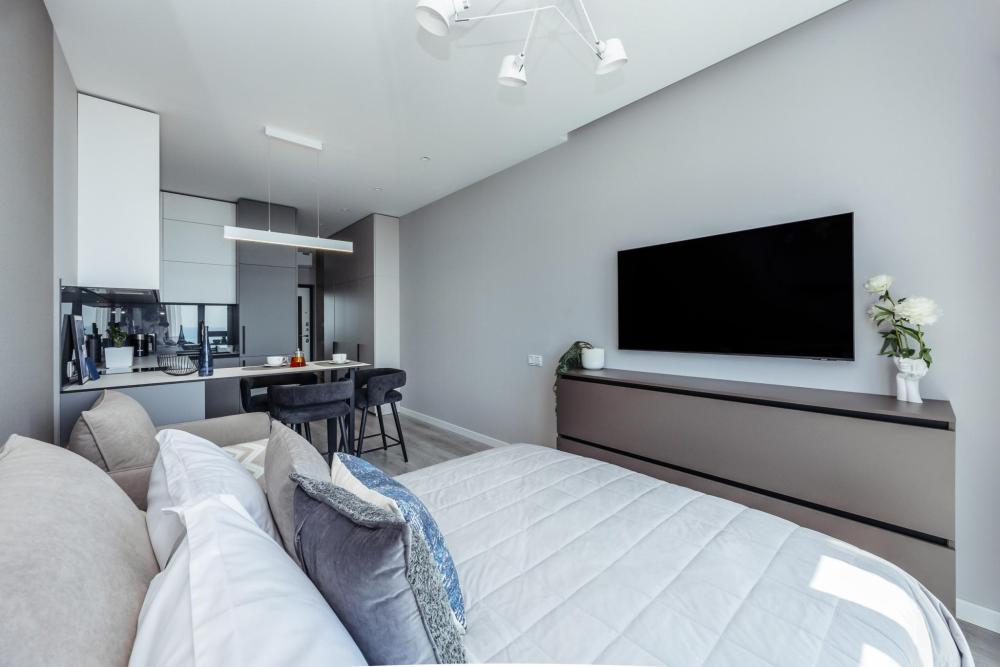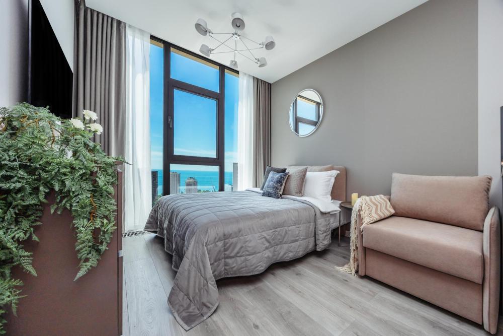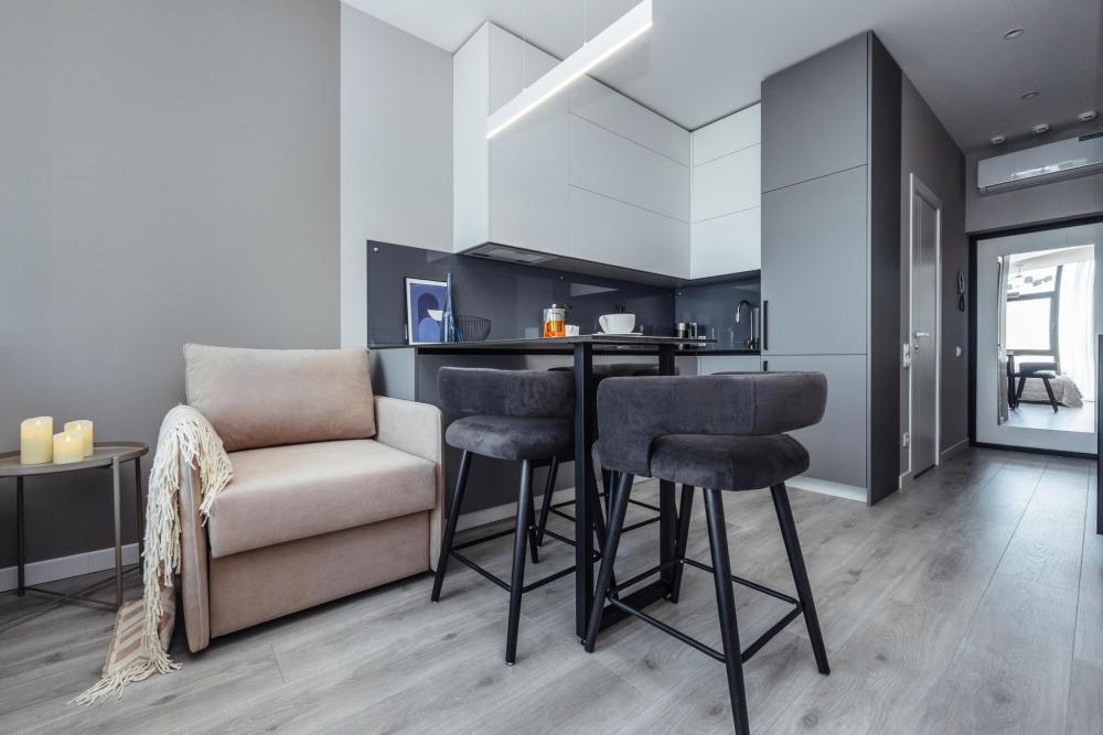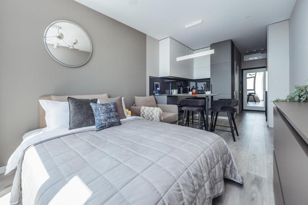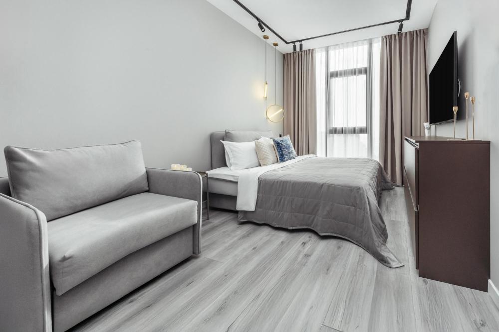 В апартаментах каждый элемент продуман для комфорта гостей: современная стильная мебель и отделка класса люкс; полностью оборудованная кухня с варочной поверхностью, вместительным холодильником, духовым шкафом с функцией микроволновки, посудомоечной машиной и всей необходимой кухонной утварью; уютная спальная зона с удобным диваном-кроватью и белоснежным бельём для сладкого сна; дополнительное комфортное спальное место для третьего гостя; беспроводной интернет для работы и развлечений, телевизор со смарт-ТВ; кондиционер, теплые полы в ванной; в ванной комнате душевая система, свежие полотенца, гигиенические средства, фен, гладильная доска, стиральная машина, средства для стирки, сейф.