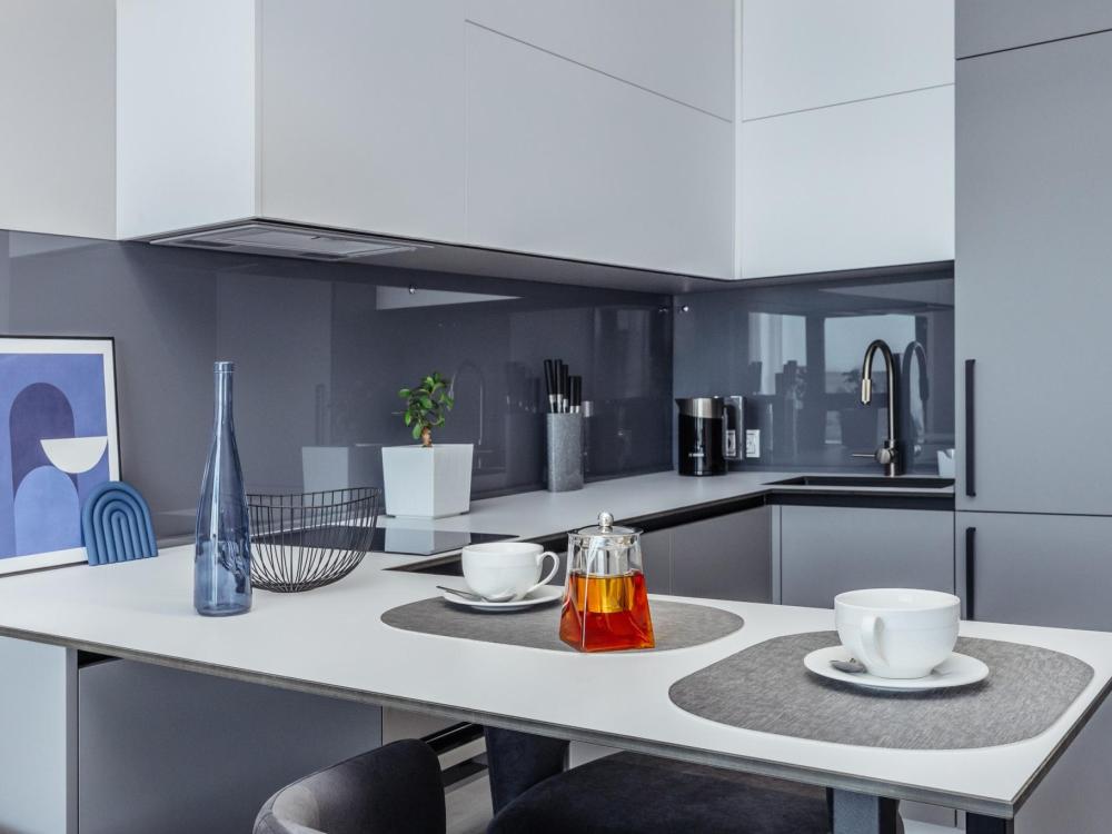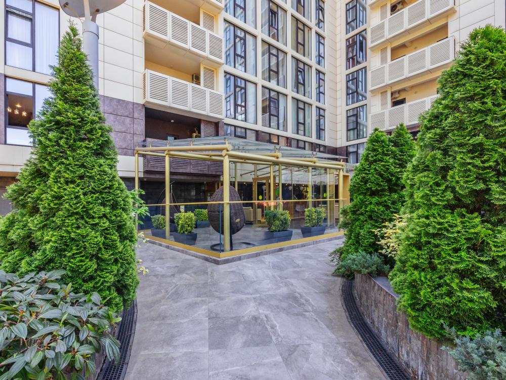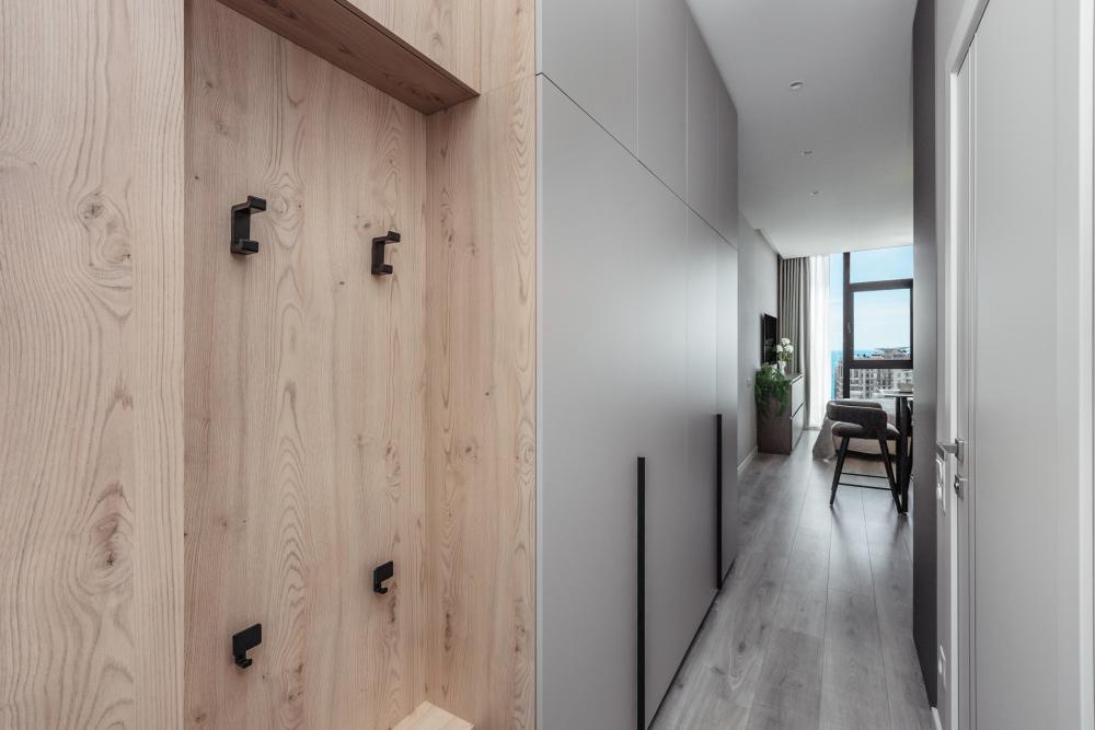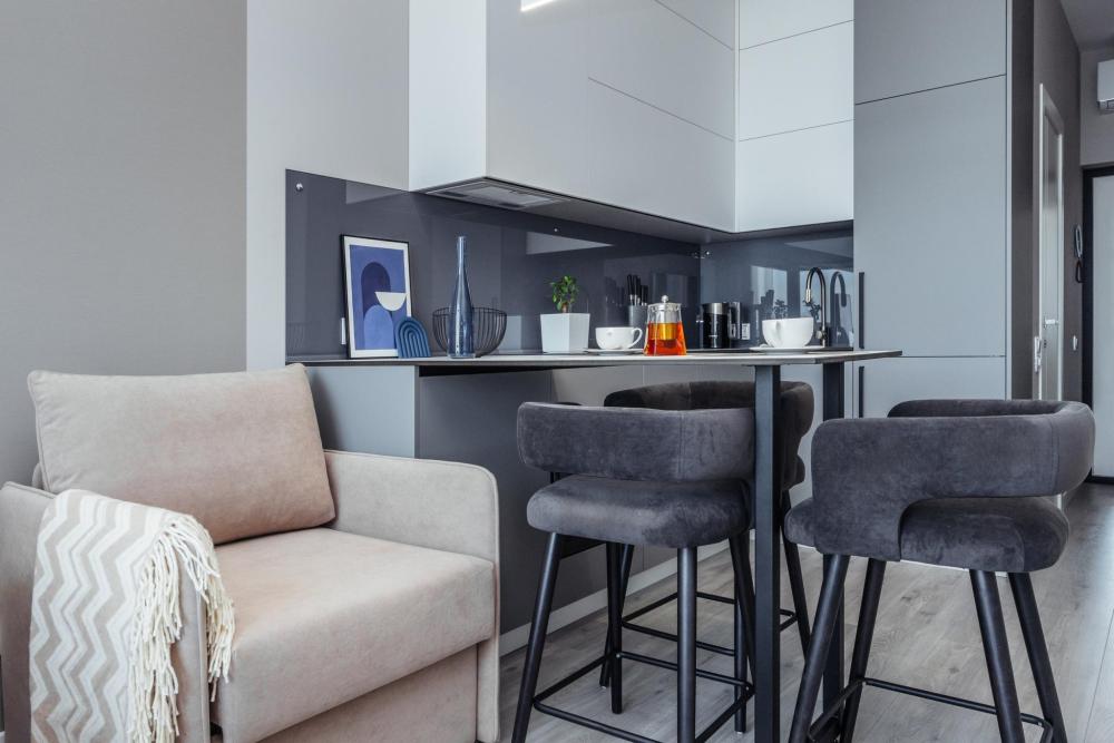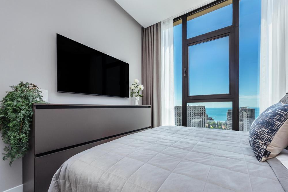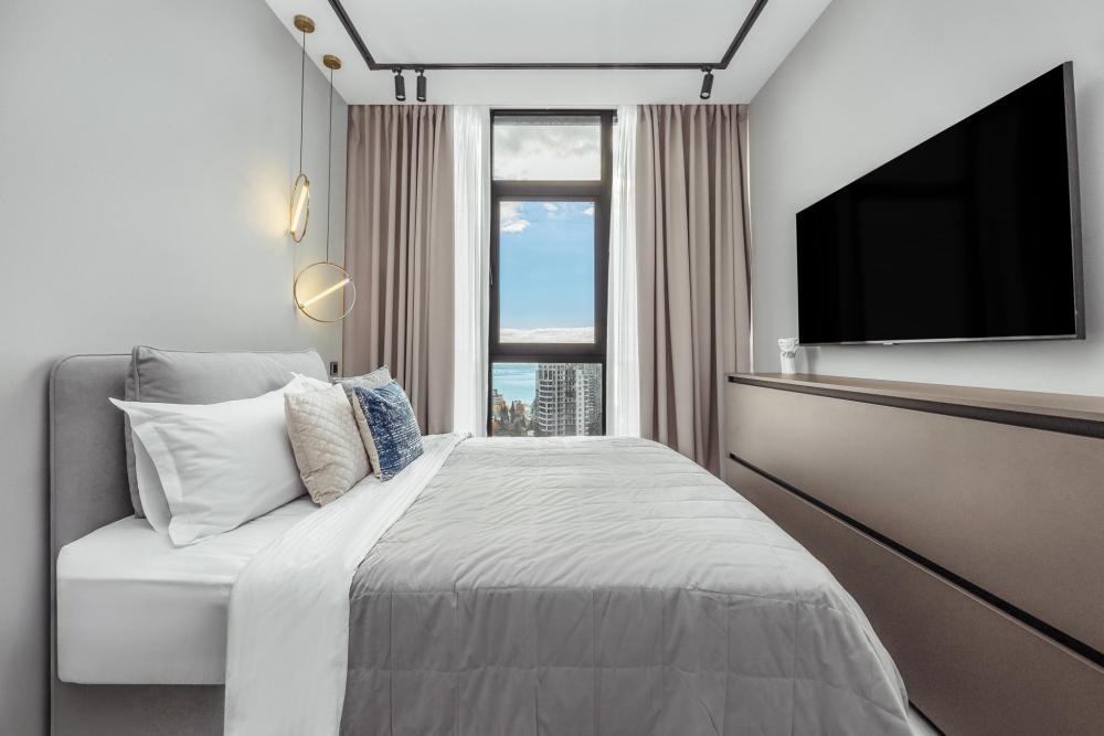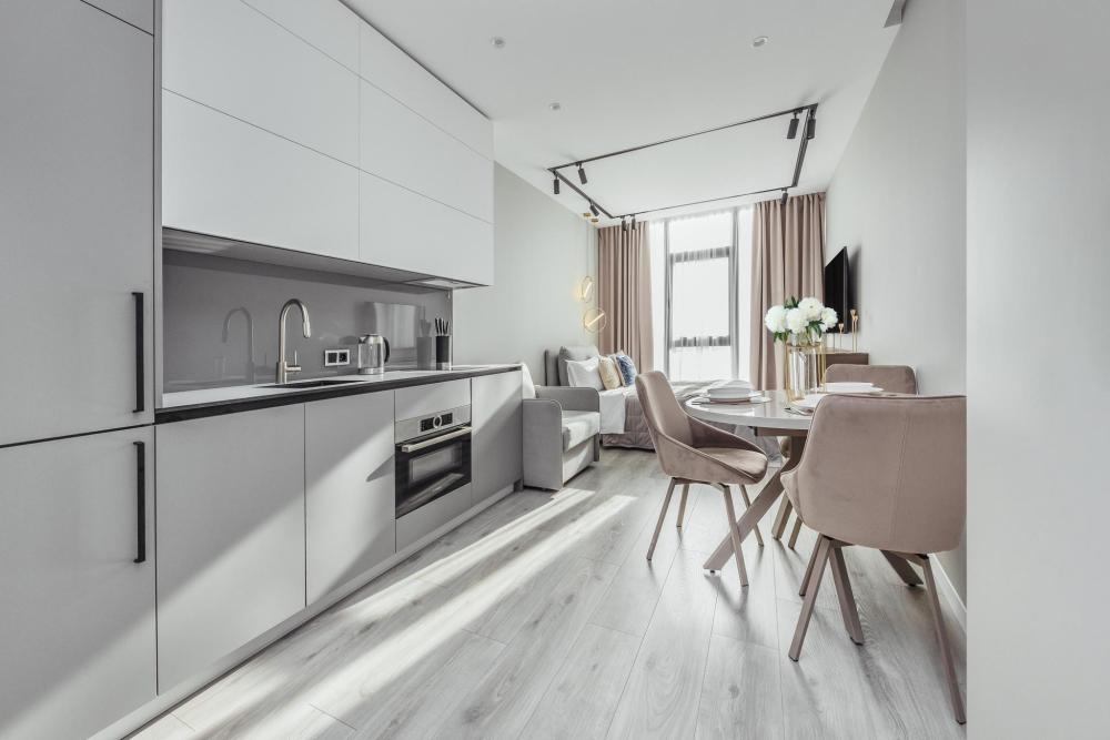 В апартаментах каждый элемент продуман для комфорта гостей: современная стильная мебель и отделка класса люкс; полностью оборудованная кухня с варочной поверхностью, вместительным холодильником, духовым шкафом с функцией микроволновки, посудомоечной машиной и всей необходимой кухонной утварью; уютная спальная зона с удобным диваном-кроватью и белоснежным бельём для сладкого сна; дополнительное комфортное спальное место для третьего гостя; беспроводной интернет для работы и развлечений, телевизор со смарт-ТВ; кондиционер, теплые полы в ванной; в ванной комнате душевая система, свежие полотенца, гигиенические средства, фен, гладильная доска, стиральная машина, средства для стирки, сейф.