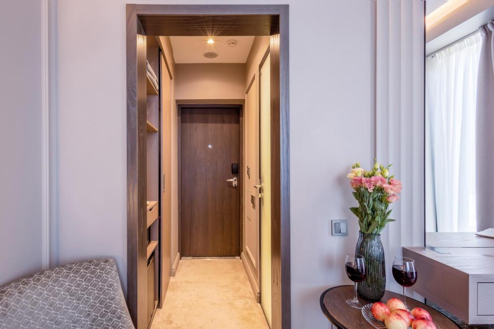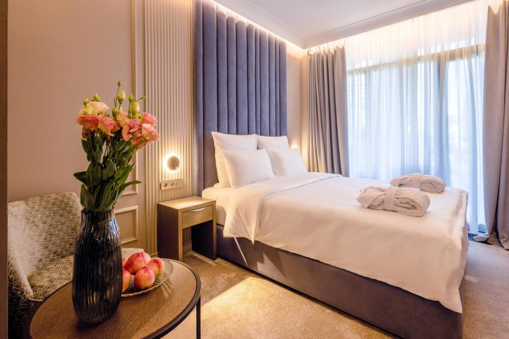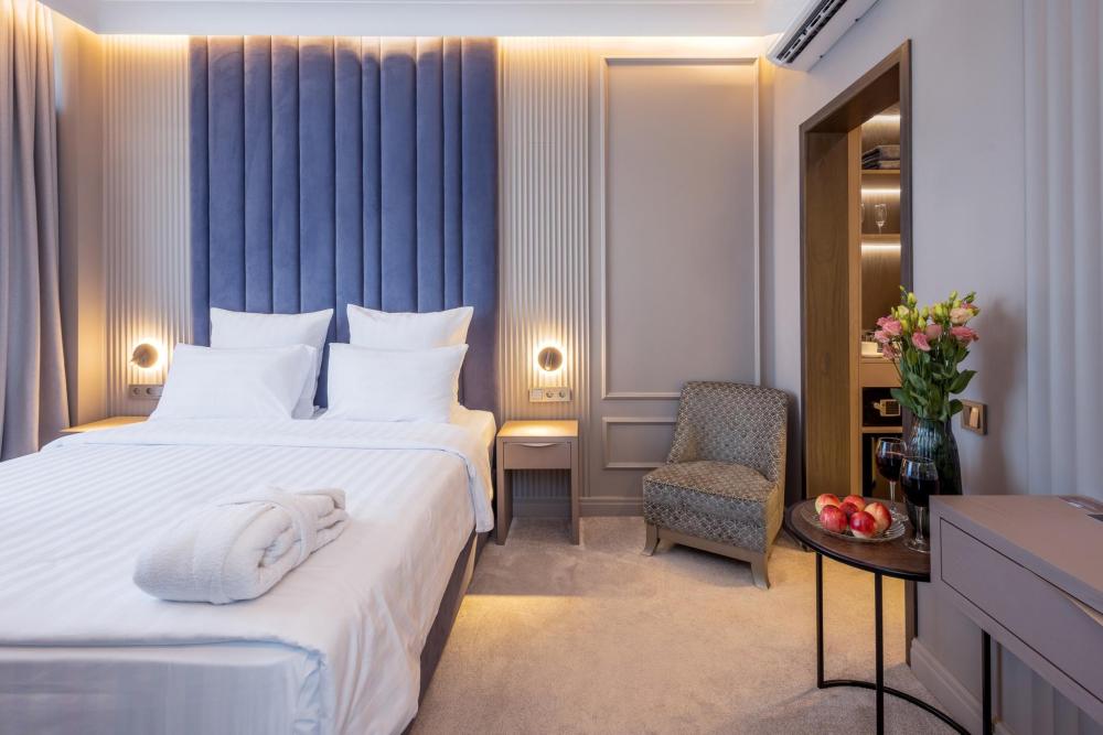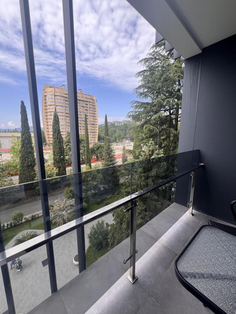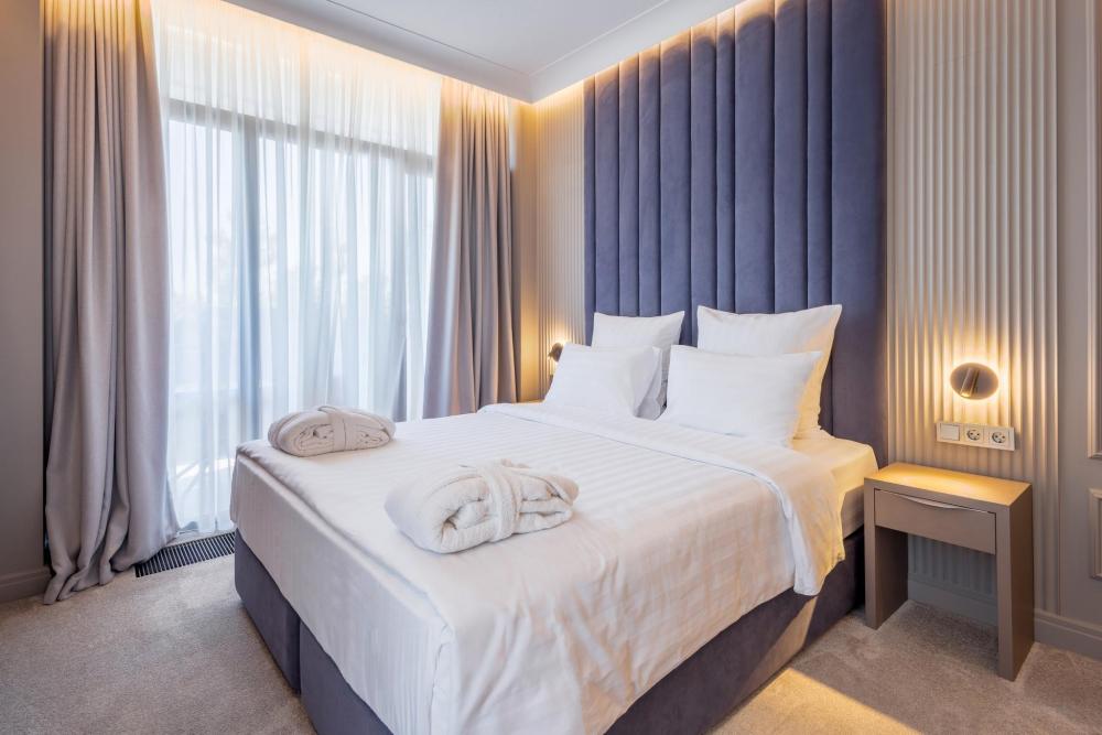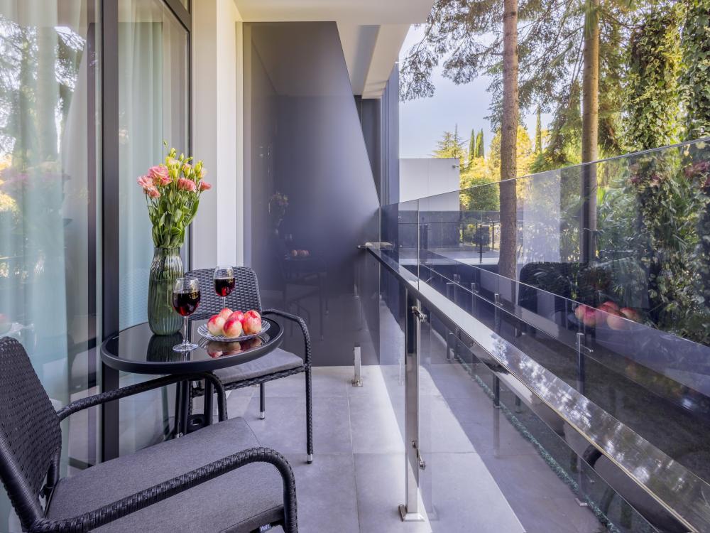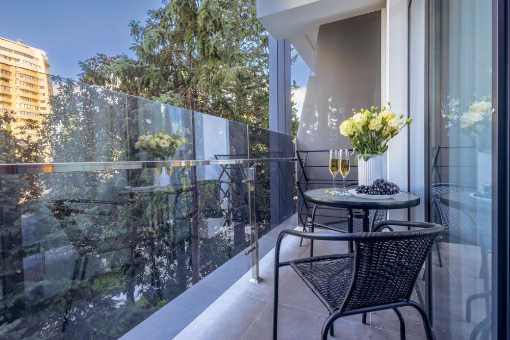 Апартаменты с качественным дизайнерским ремонтом оснащены спальным местом с высоким ортопедическим матрасом Аскона, так же дополнительное место – кресло-кровать (размеры 70х190), имеется постельное белье высокого уровня, мягкие подушки и мягкие как пух одеяла, шторы блэкаут, сейф, телевизор, чайная станция и мини-холодильник, WI-FI. В апартаментах большой санузел, оснащенный качественной и дорогой сантехникой, для удобства гостей имеется фен, халаты, тапочки и полотенца. На балконе, с потрясающим видом на зелень, установлена мебель для отдыха.