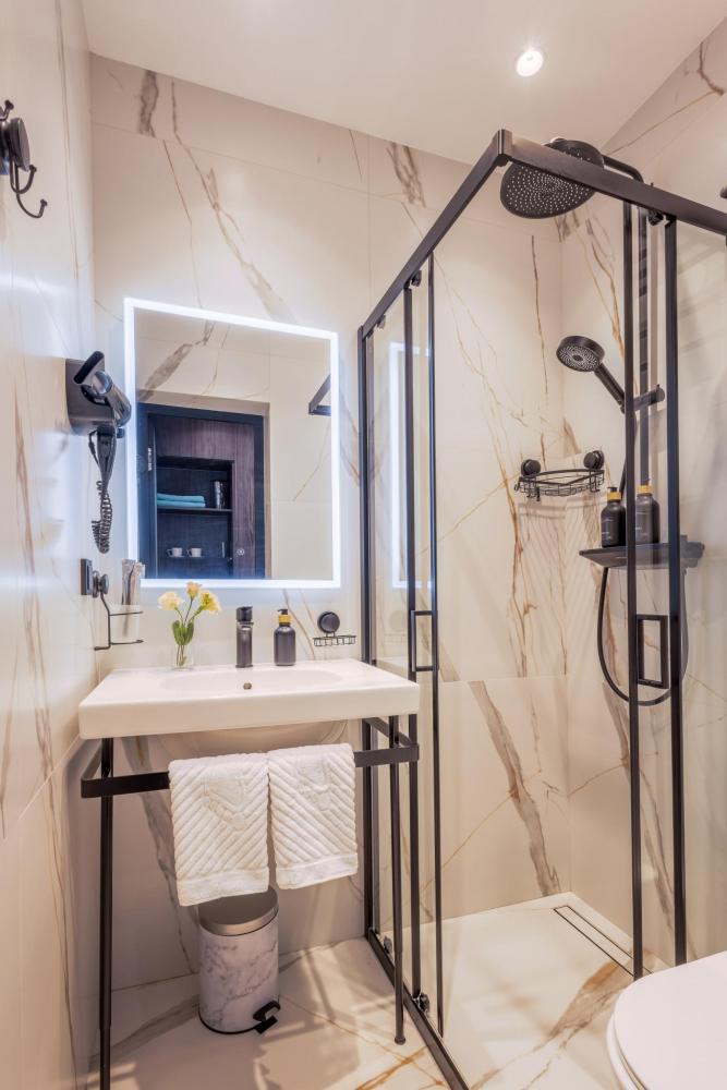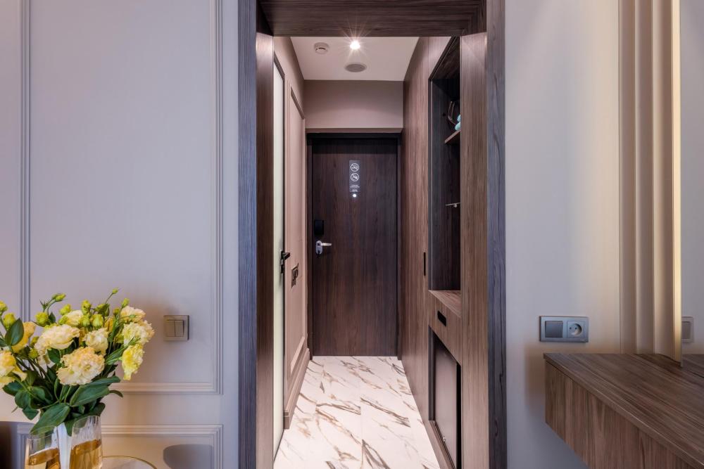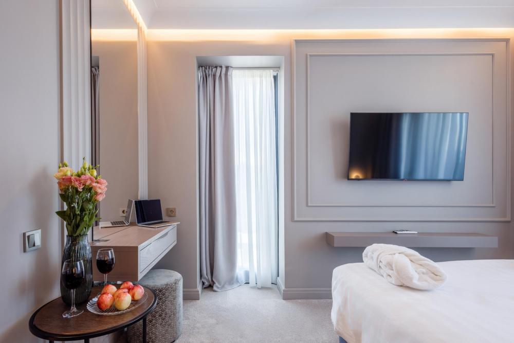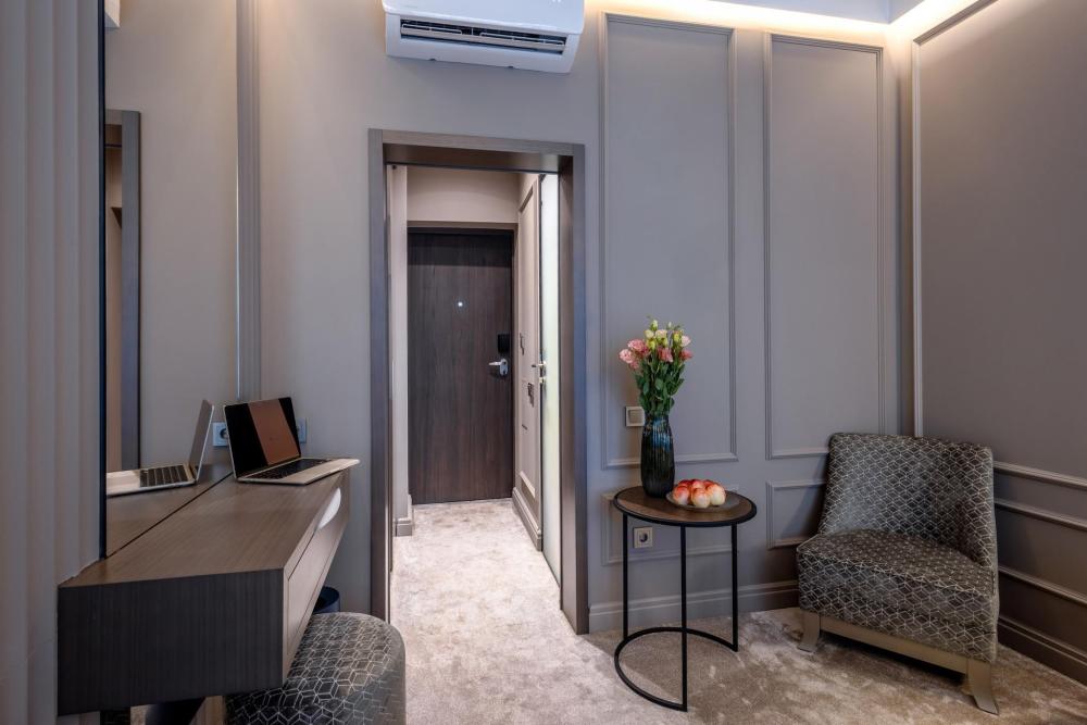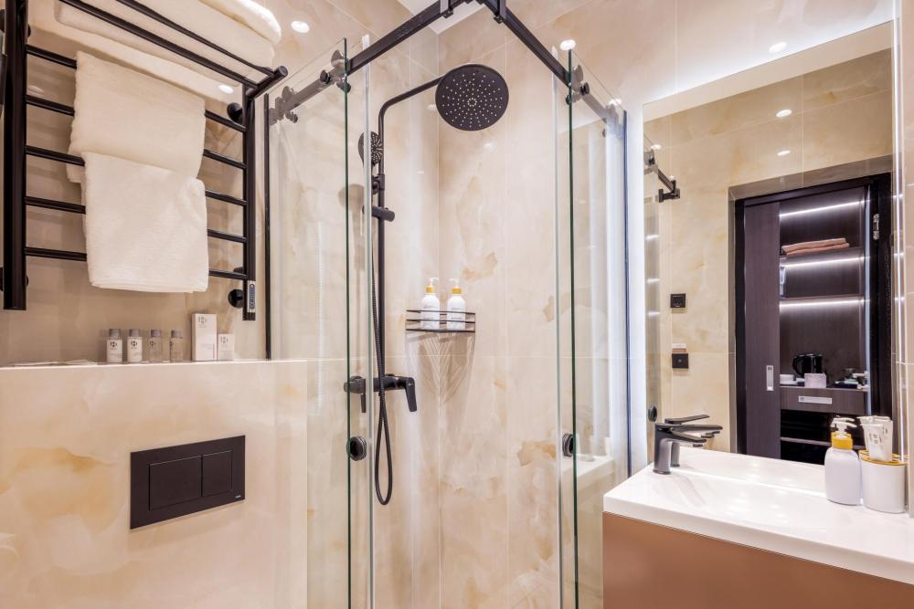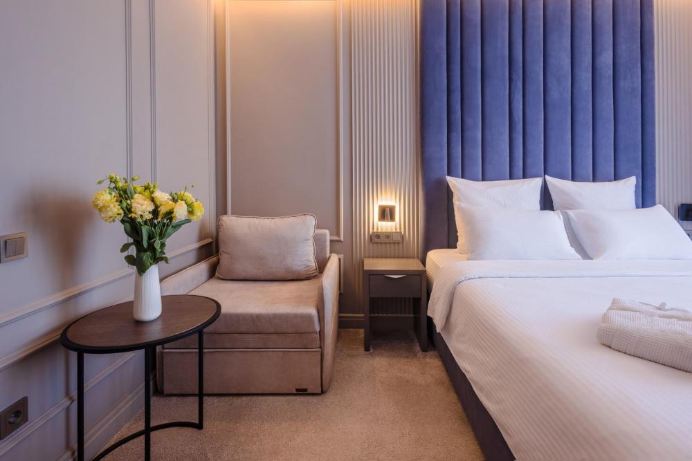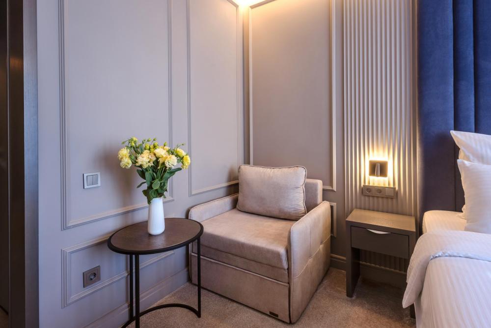 Апартаменты с качественным дизайнерским ремонтом оснащены спальным местом с высоким ортопедическим матрасом Аскона, так же дополнительное место – кресло-кровать (размеры 70х190), имеется постельное белье высокого уровня, мягкие подушки и мягкие как пух одеяла, шторы блэкаут, сейф, телевизор, чайная станция и мини-холодильник, WI-FI. В апартаментах большой санузел, оснащенный качественной и дорогой сантехникой, для удобства гостей имеется фен, халаты, тапочки и полотенца. На балконе, с потрясающим видом на зелень, установлена мебель для отдыха.