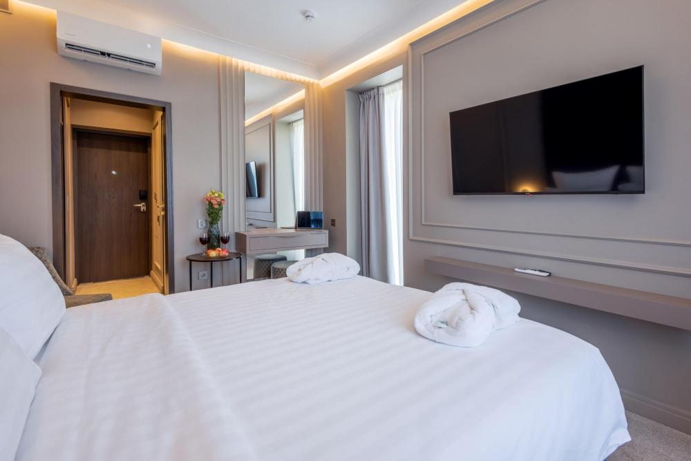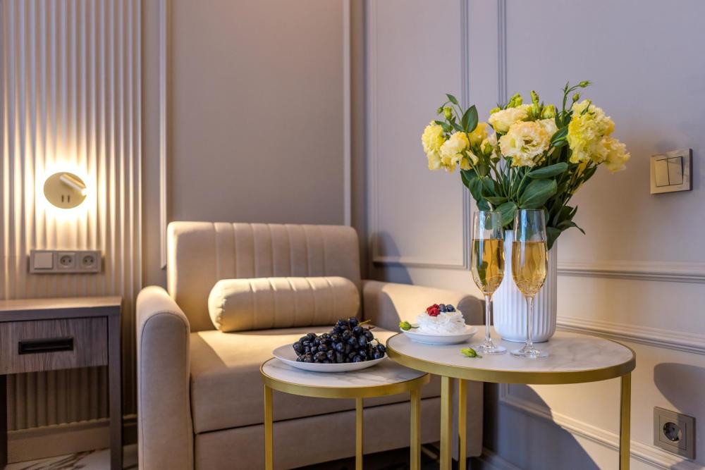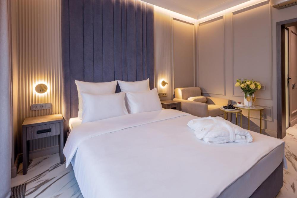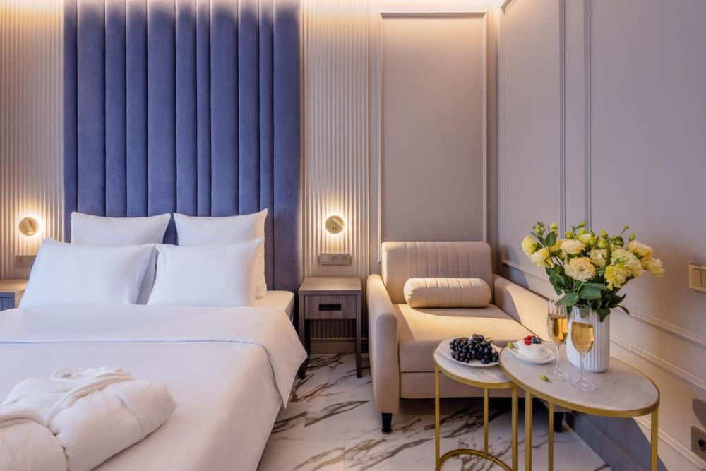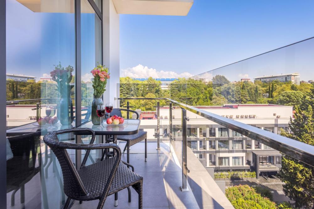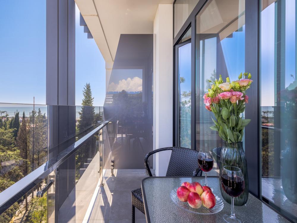 Апартаменты с качественным дизайнерским ремонтом оснащены спальным местом с высоким ортопедическим матрасом аскона, постельным бельём высокого уровня, ортопедическими подушками и мягким как пух одеялом, шторами блэкаут, wi-fi. Апартаменты для удобства гостей оснащены мини-холодильником, чайной станцией, феном, сейфом, посудой халатами и тапочками. На балконе с видом на море установлена мебель для отдыха.