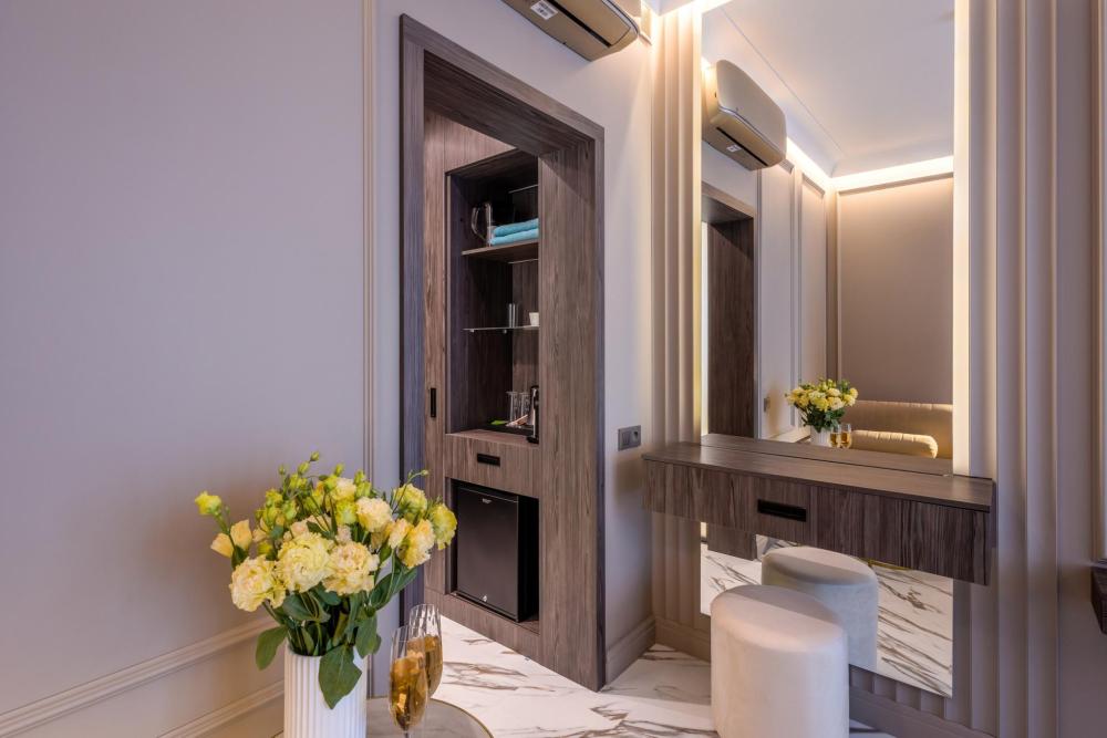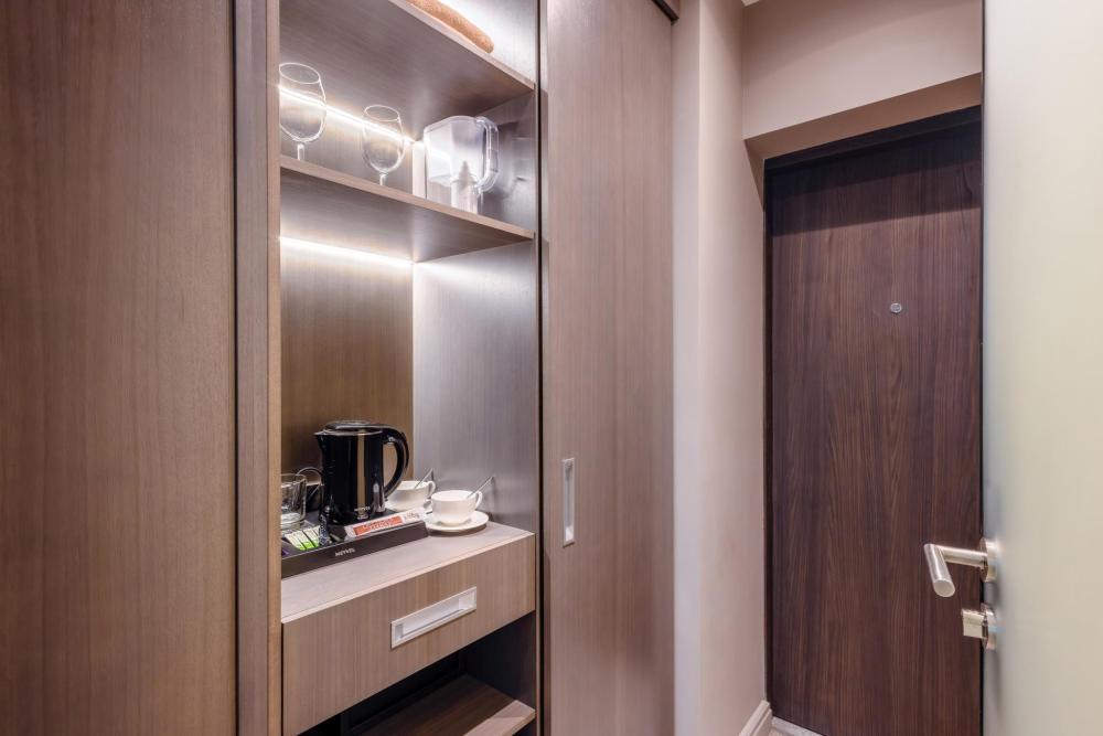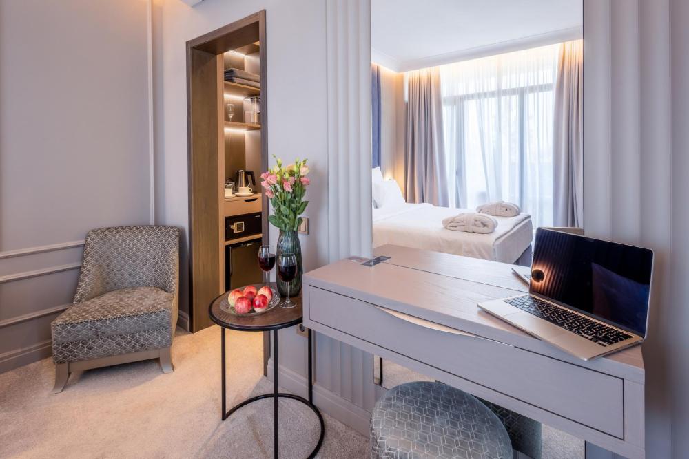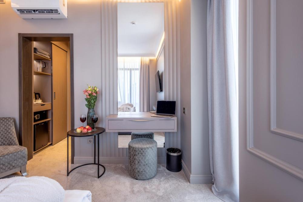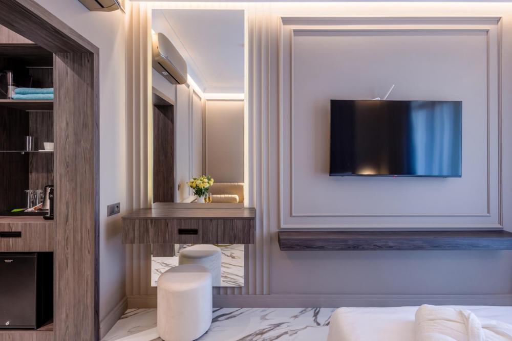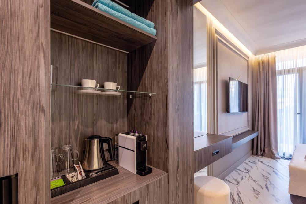Апартаменты с качественным дизайнерским ремонтом оснащены спальным местом с высоким ортопедическим матрасом аскона, постельным бельём высокого уровня, ортопедическими подушками и мягким как пух одеялом, шторами блэкаут, wi-fi. Апартаменты для удобства гостей оснащены мини-холодильником, чайной станцией, феном, сейфом, посудой халатами и тапочками. На балконе с видом на море установлена мебель для отдыха.