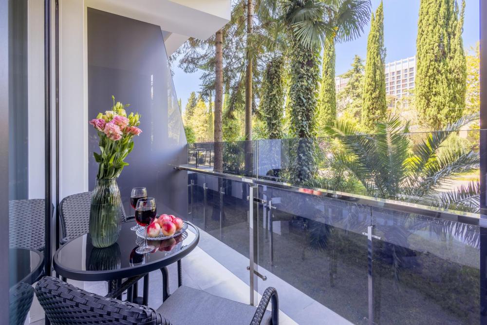 Апартаменты с качественным дизайнерским ремонтом оснащены спальным местом с высоким ортопедическим матрасом Аскона, постельным бельем высокого уровня, ортопедическими подушками и мягким как пух одеялом, шторами блэкаут, WI-FI. Апартаменты для удобства гостей оснащены мини-холодильником, чайной станцией, феном, сейфом, посудой халатами и тапочками. На балконе с видом на сад установлена мебель для отдыха.
