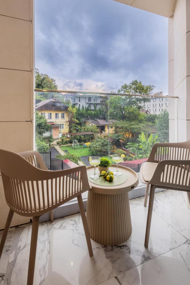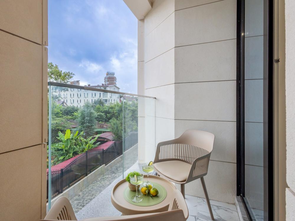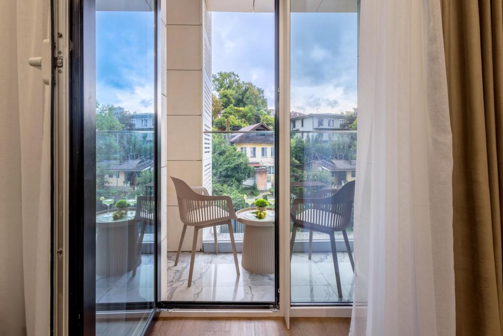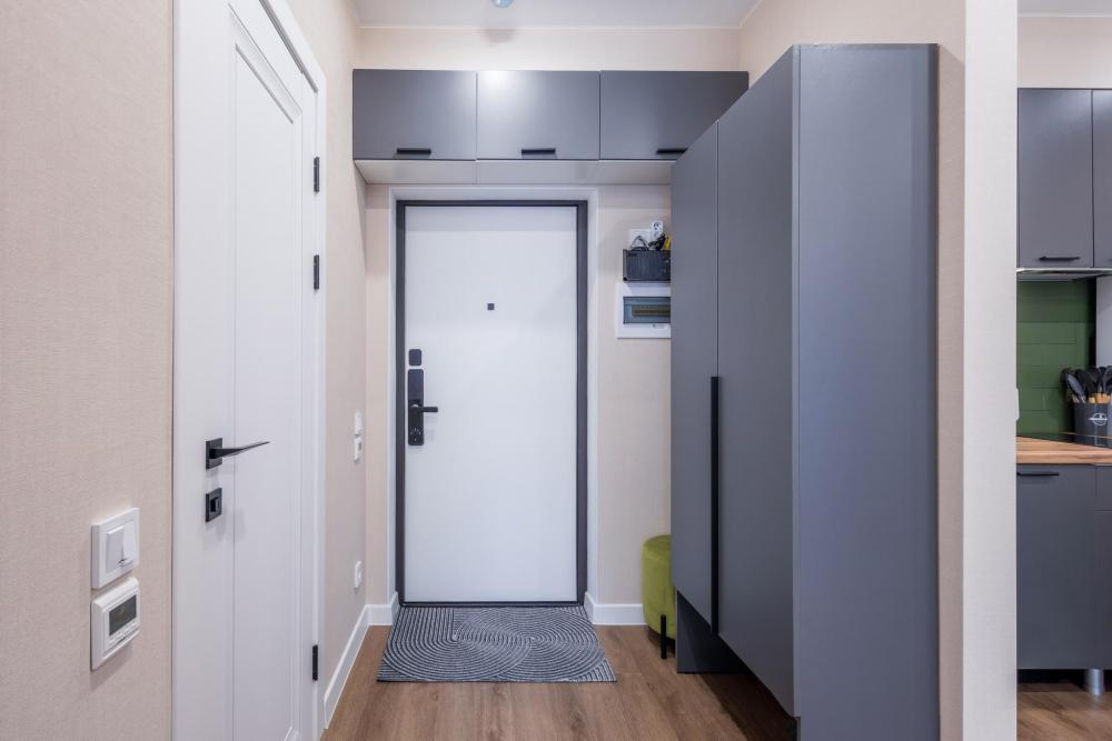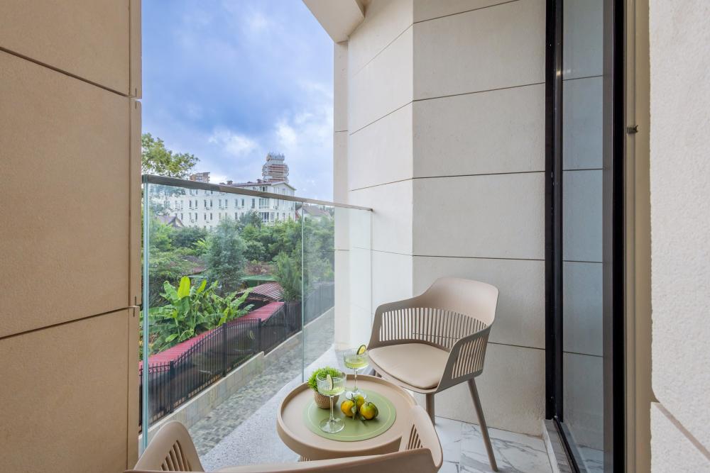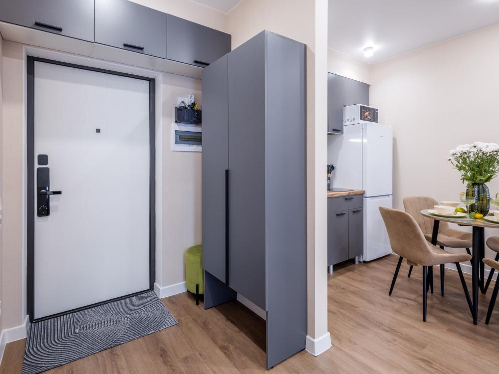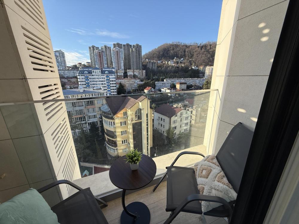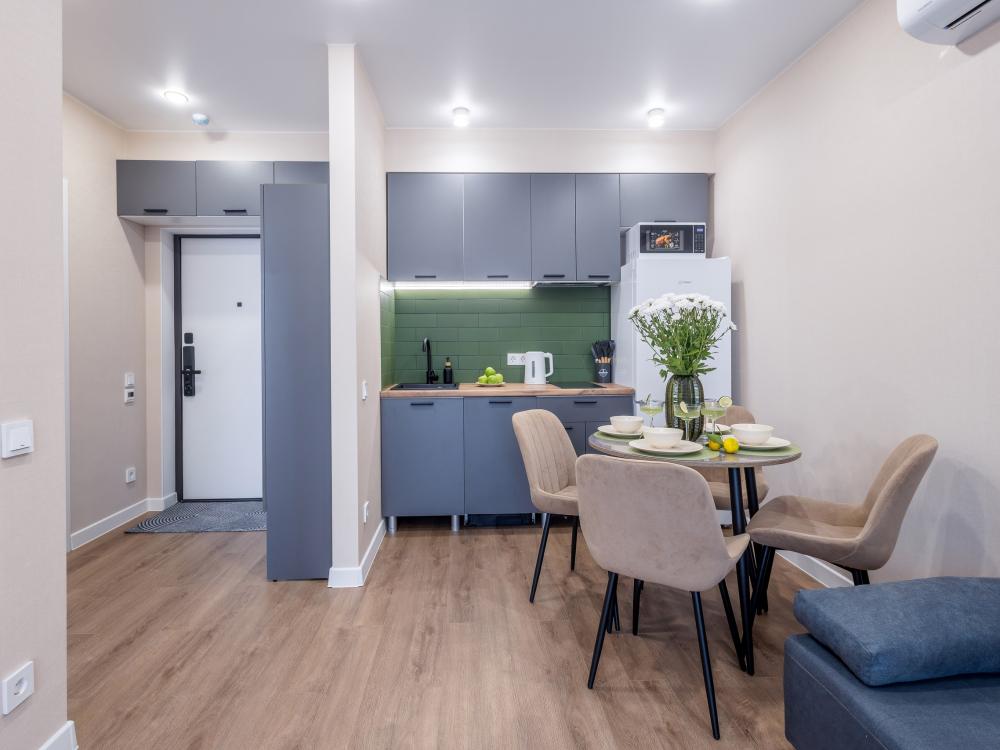 В квартире есть полноценный кухонный уголок с плитой, СВЧ, холодильником, посудой и чайником, двуспальная кровать с ортопедическим матрасом, телевизор с Wi-Fi, кондиционер и затемняющие шторы, утюг, гладильная доска и сушилка для белья, санузел с душем и стиральной машиной, а также балкон с мебелью и видом на улицу.