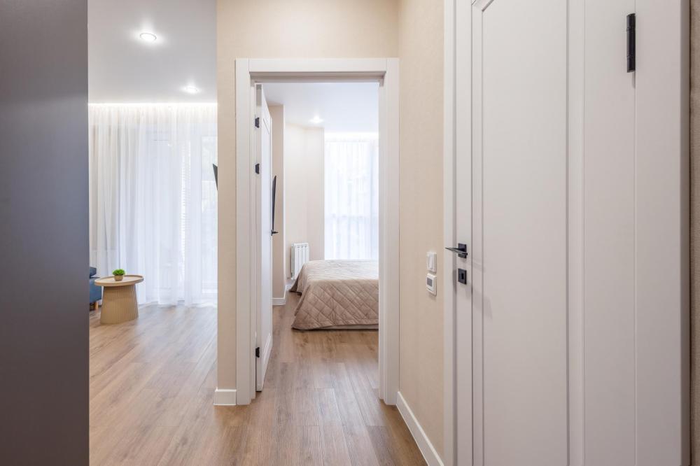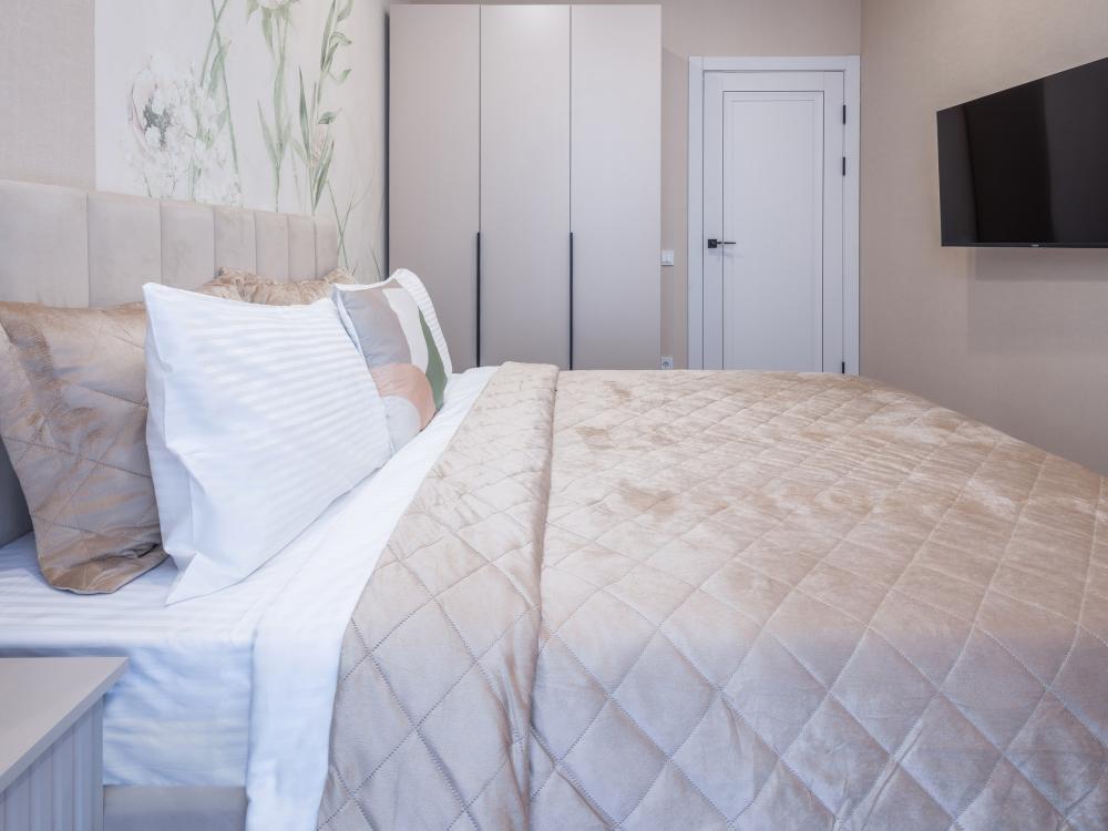 В квартире есть полноценная кухня с плитой, духовкой, СВЧ, холодильником, посудой и чайником, двуспальный раскладной диван и отдельная двуспальная кровать с ортопедическим матрасом, два телевизора с Wi-Fi, два кондиционера, затемняющие шторы, утюг, гладильная доска, сушилка для белья, санузел с душем, стиральной машиной и бойлером, а также балкон с мебелью и видом на детскую площадку.
