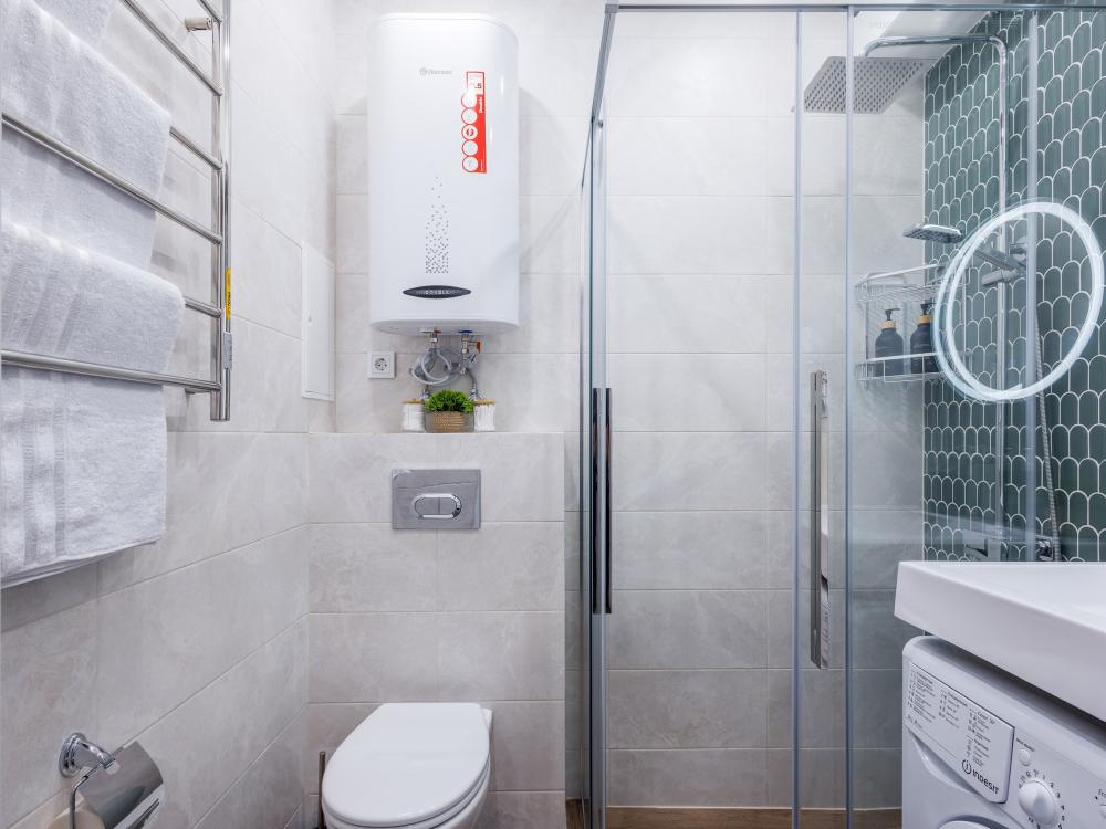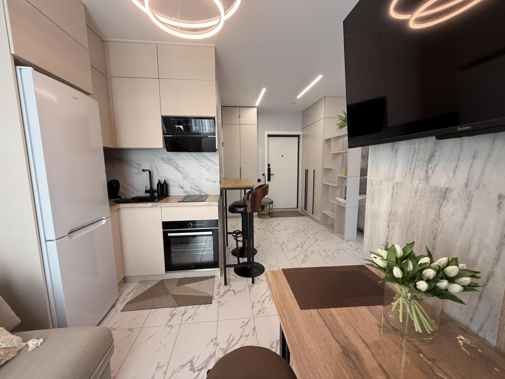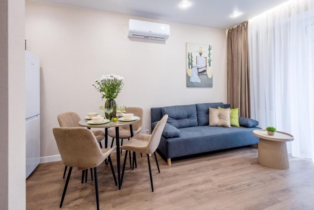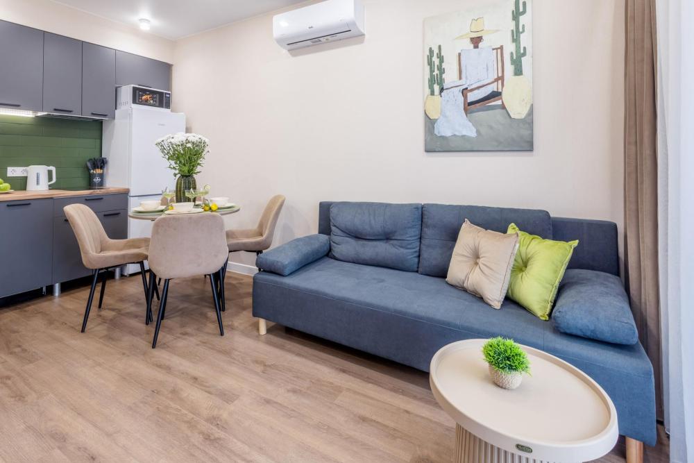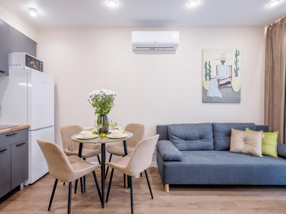 В квартире есть полноценный кухонный уголок с плитой, СВЧ, холодильником, посудой и чайником, двуспальная кровать с ортопедическим матрасом, диван с ортопедическим матрасом Ascona, телевизор, Wi-Fi, кондиционер, утюг, гладильная доска, сушилка для белья, санузел с душем и стиральной машиной, балкон с мебелью и видом на улицу.