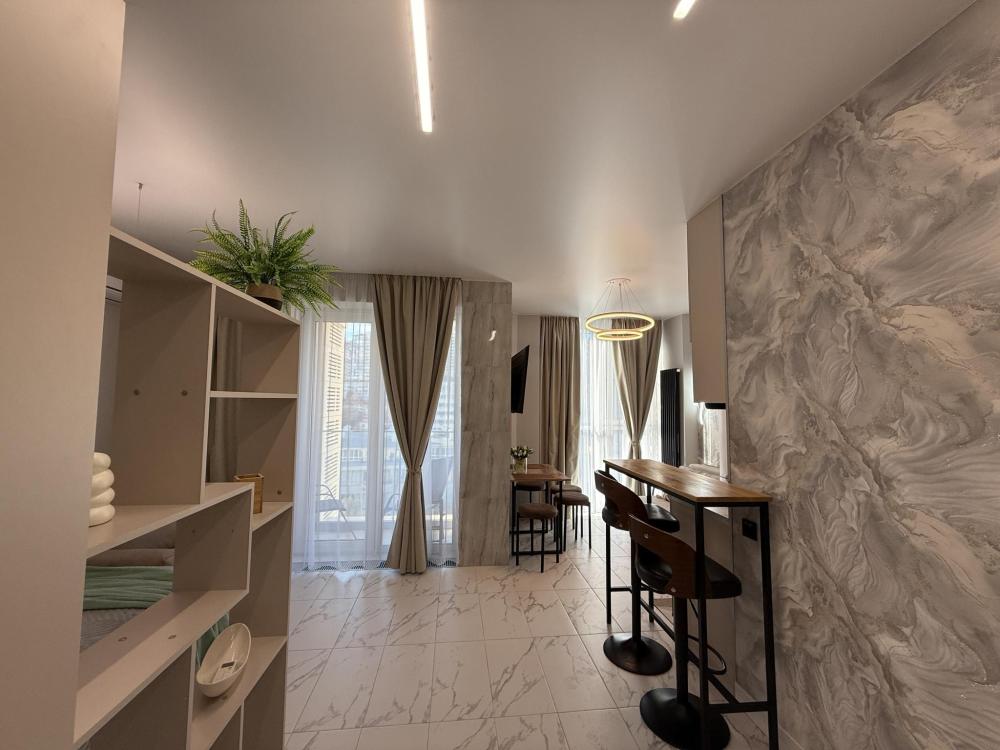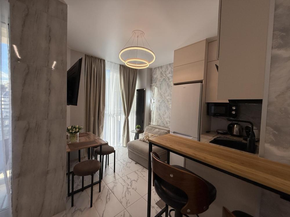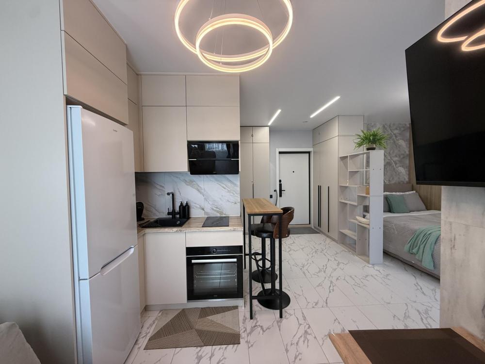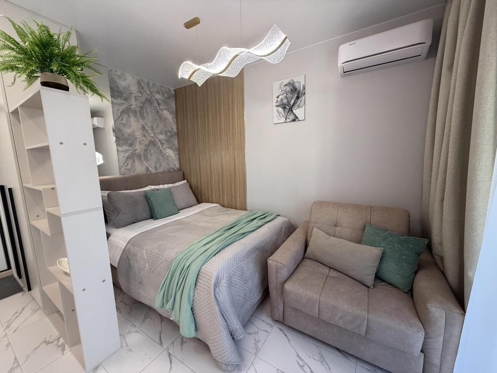 В квартире есть полноценный кухонный уголок с плитой, СВЧ, холодильником, посудой и чайником, двуспальная кровать с ортопедическим матрасом, диван с ортопедическим матрасом Ascona, телевизор, Wi-Fi, кондиционер, утюг, гладильная доска, сушилка для белья, санузел с душем и стиральной машиной, балкон с мебелью и видом на улицу.