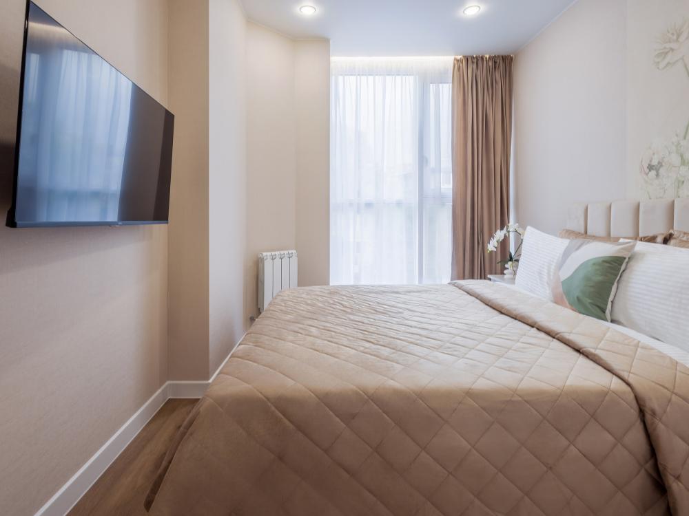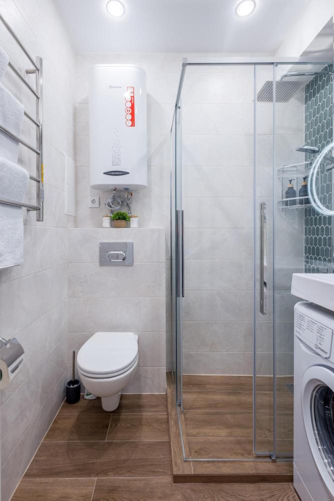 В квартире есть полноценный кухонный уголок с плитой, СВЧ, холодильником, посудомоечной машиной, посудой и чайником, двуспальная кровать с ортопедическим матрасом, двуспальный диван, два телевизора, Wi-Fi, кондиционер, затемняющие шторы, утюг, гладильная доска, сушилка для белья, санузел с душем, стиральной машиной и водонагревателем, а также балкон с мебелью и видом на улицу.