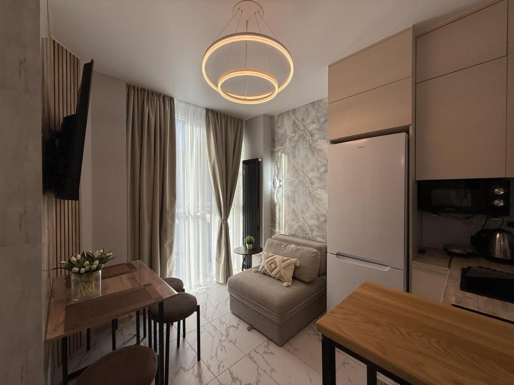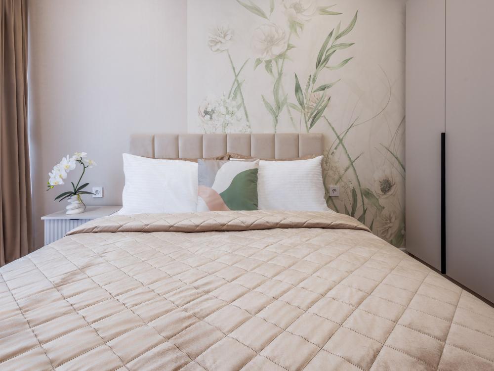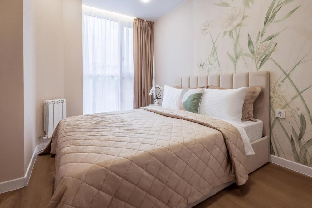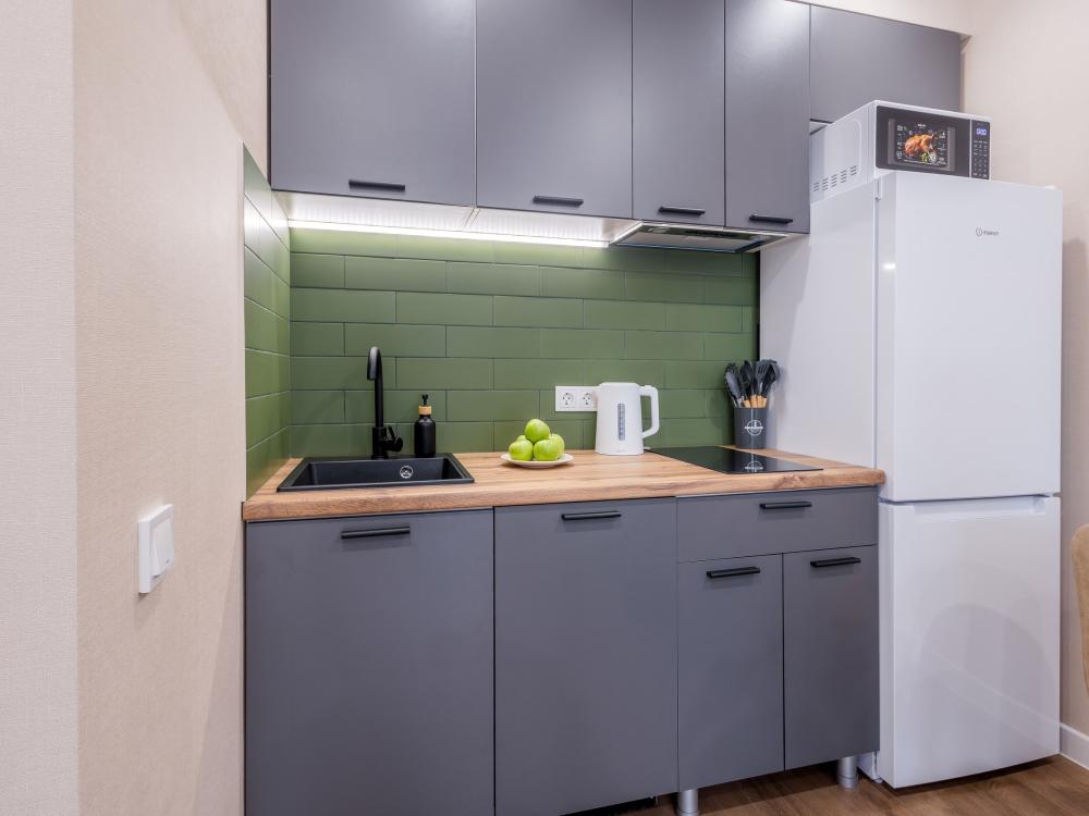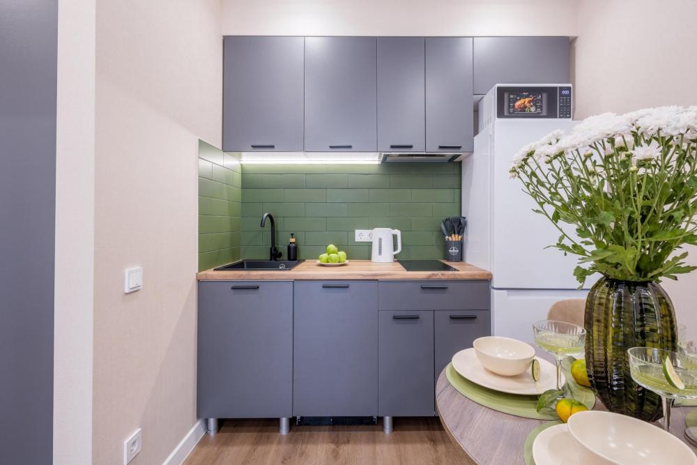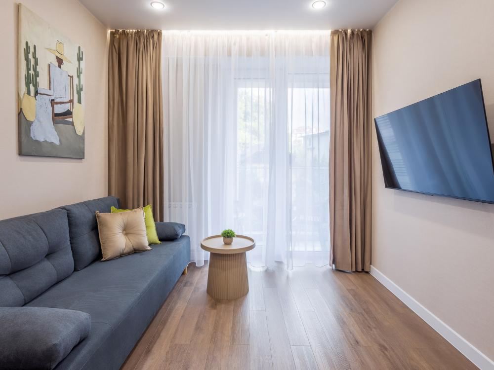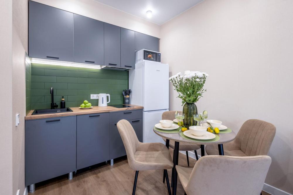 В квартире есть полноценная кухня с плитой, посудомоечной машиной, СВЧ, холодильником, посудой и чайником, двуспальный раскладной диван и отдельная двуспальная кровать с ортопедическим матрасом, один телевизор с Wi-Fi, один кондиционер, затемняющие шторы, утюг, гладильная доска, сушилка для белья, санузел с душем, а также балкон с мебелью и видом на зелень.