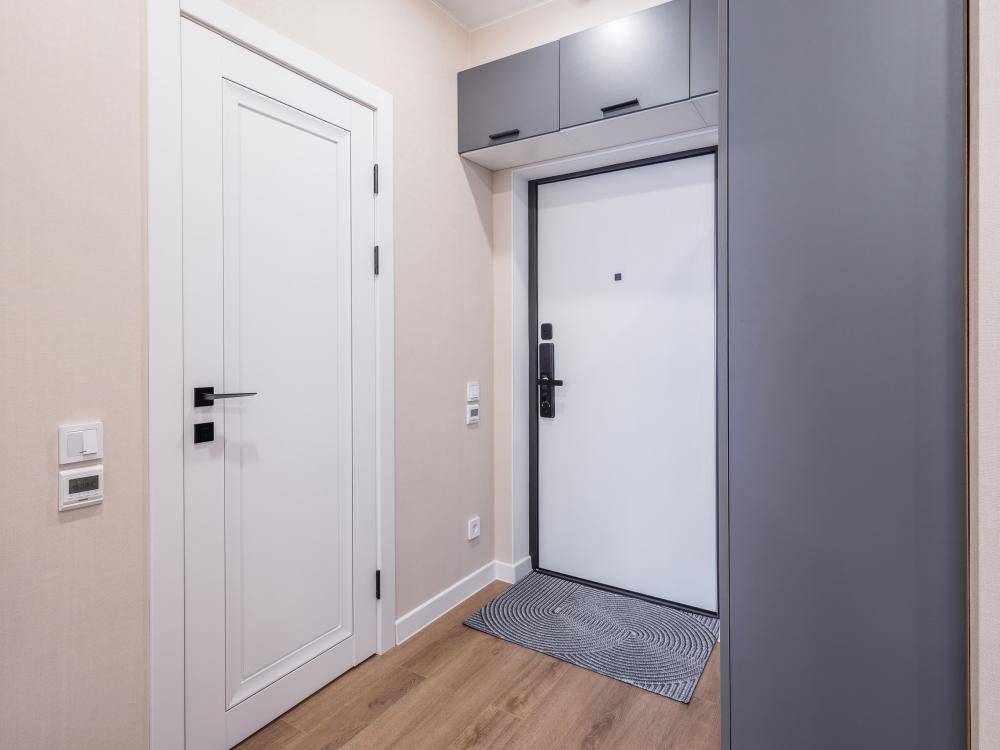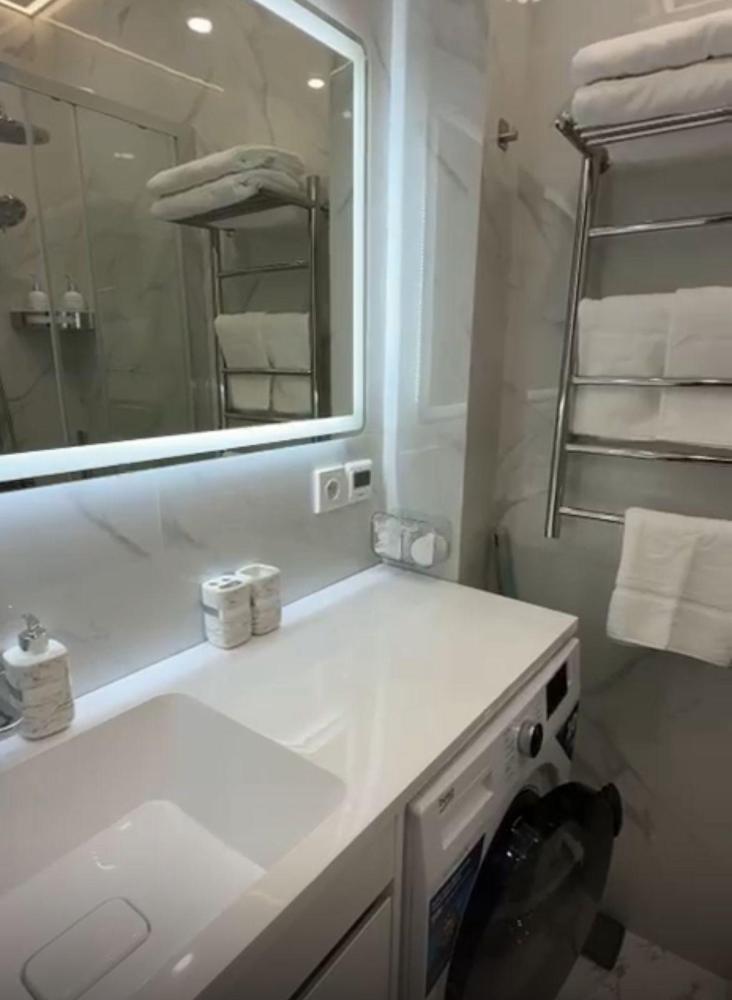 В квартире есть полноценный кухонный уголок с плитой, СВЧ, холодильником, посудой и чайником, двуспальная кровать с ортопедическим матрасом, телевизор с функцией Алисой, Wi-Fi, кондиционер, затемняющие шторы, утюг, гладильная доска, сушилка для белья, санузел с душем и стиральной машиной, балкон с мебелью и видом на улицу.