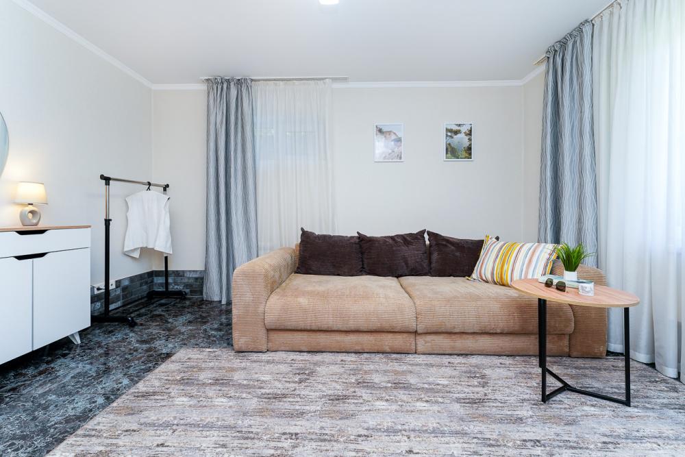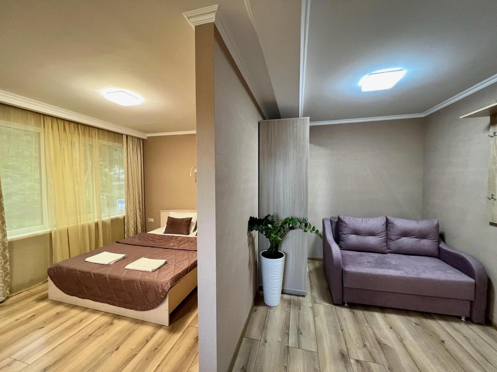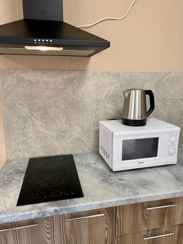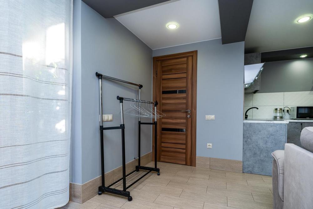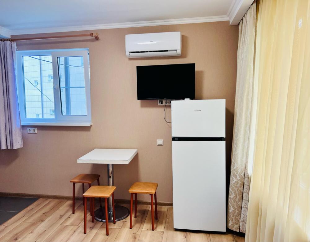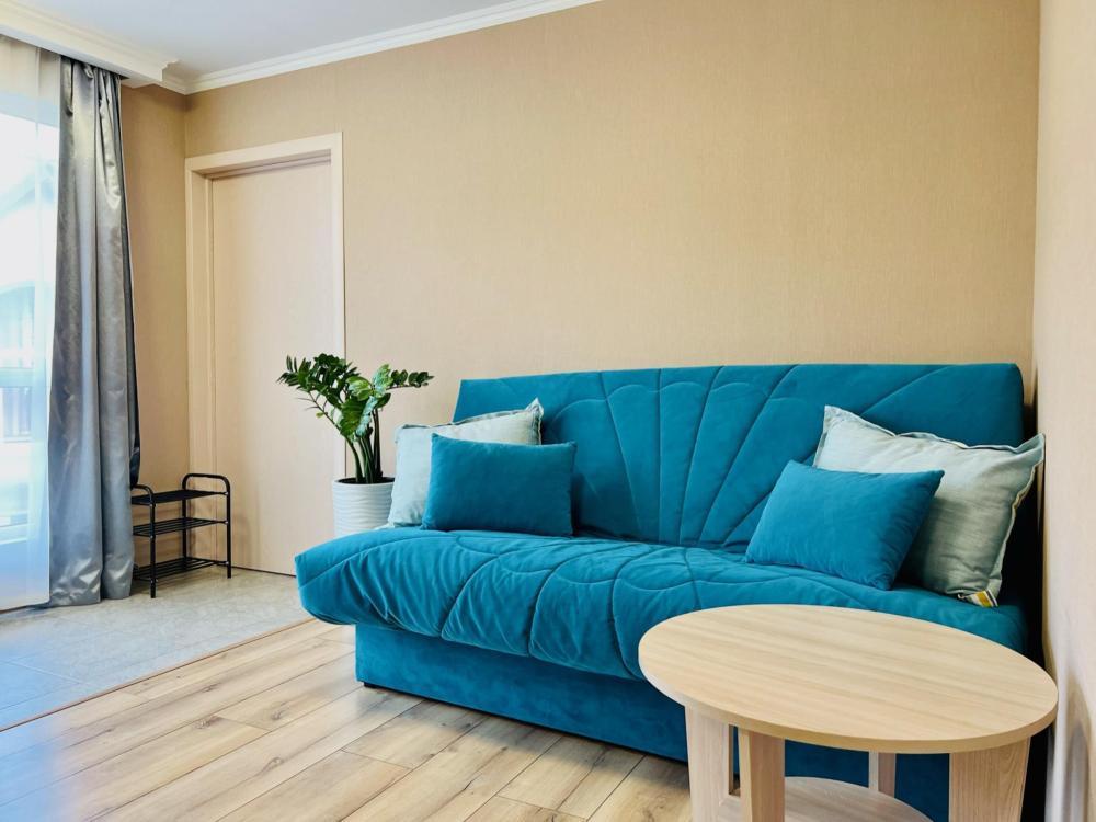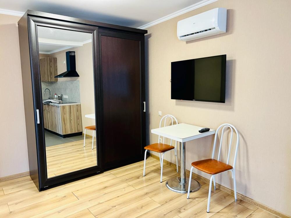 Апартаменты студия Квартира полностью укомплектована всем необходимым для комфортного пребывания: двуспальная кровать, двуспальный раскладной диван, шкаф для одежды. Выделенная обеденная зона и оборудованная кухня: холодильник, встраиваемая варочная панель, вытяжка, микроволновая печь, чайник, посуда, столовые приборы. Электроника и оборудование: смарт-телевизор (275 бесплатных тв-каналов), быстрый стабильный WI-FI, сплит-система, стиральная машина, фен, утюг, гладильная доска, сушилка для белья. Совмещенный сан-узел: душ, туалет, гигиенический душ.