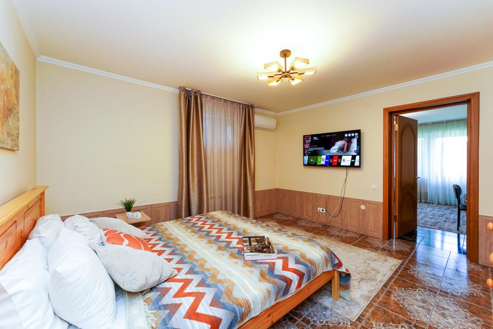 Дизайнерская квартира с 2 отдельными спальными и кабинетом. Персональный дворик с зоной отдыха и мангальной зоной. Квартира полностью укомплектована всем необходимым для комфортного пребывания: двуспальная кровать, двуспальный раскладной диван, гардеробная для одежды и вещей. Выделенная обеденная зона (барная стойка) и оборудованная кухня: холодильник, встраиваемая варочная панель, встраиваемый духовой шкаф, встраиваемая посудомоечная машина, вытяжка, микроволновая печь, чайник, посуда, столовые приборы. Электроника и оборудование: 2 смарт-телевизора, быстрый стабильный WI-FI, 2 сплит-системы, стиральная машина, фен, утюг, гладильная доска, сушилка для белья. Раздельный сан-узел: ванна, туалет, гигиенический душ.