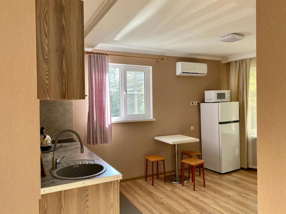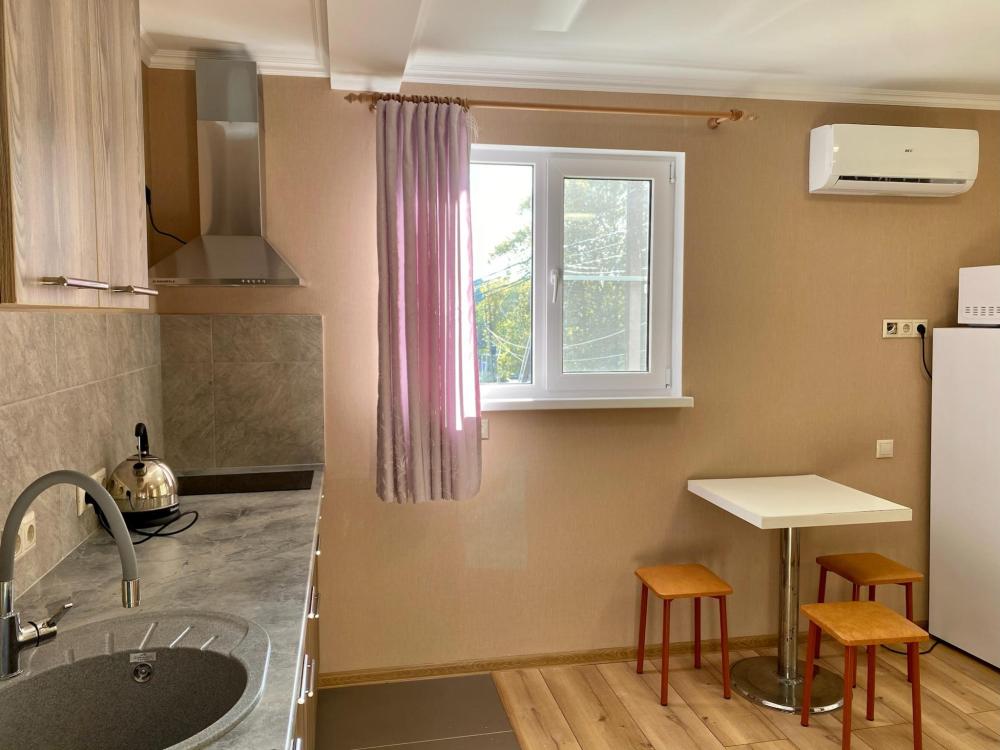 Дизайнерская студия с витражными окнами и видом на фруктовый сад. Квартира полностью укомплектована всем необходимым для комфортного пребывания: двуспальная кровать, двуспальный раскладной диван, комод для одежды. Выделенная обеденная зона и оборудованная кухня: холодильник, встраиваемая варочная панель, вытяжка, микроволновая печь, чайник, посуда, столовые приборы. Электроника и оборудование: смарт-телевизор (275 бесплатных тв-каналов), быстрый стабильный WI-FI, сплит-система, стиральная машина, фен, утюг, гладильная доска, сушилка для белья. Совмещенный сан-узел: душ, туалет, гигиенический душ.