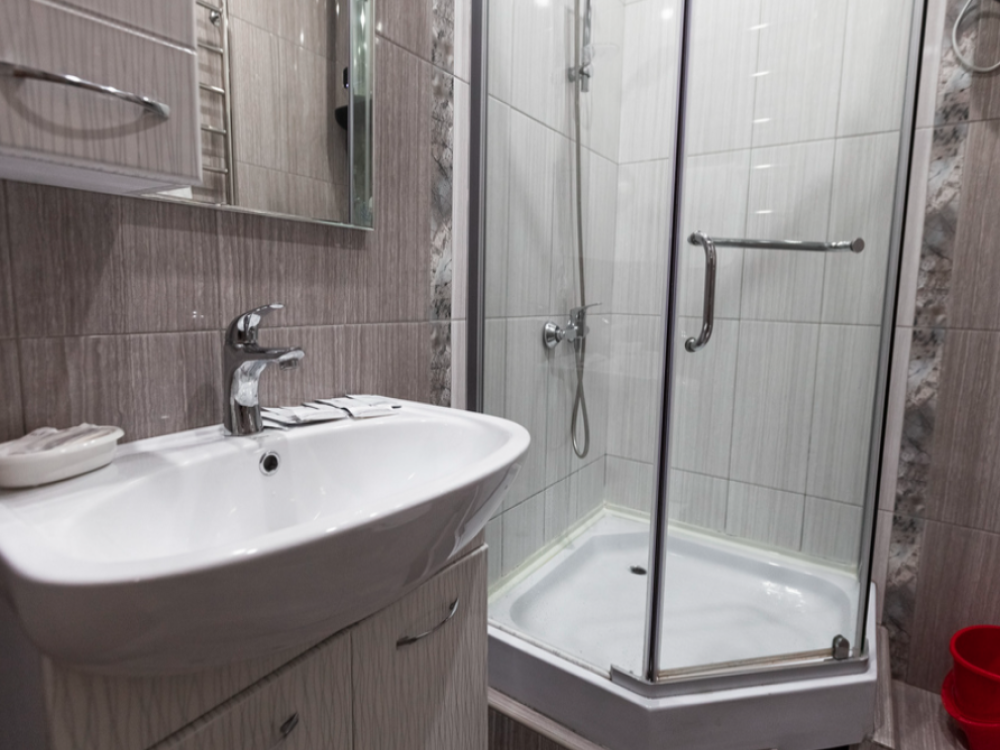 Кухня оснащена всем необходимым - плита, холодильник, эл.чайник, микроволновая печь. Посуда и кухонная утварь ?Совмещённый санузел с душевой кабиной, раковиной, зеркалом, стиральной машиной, феном. ? Телевизор Кондиционер
