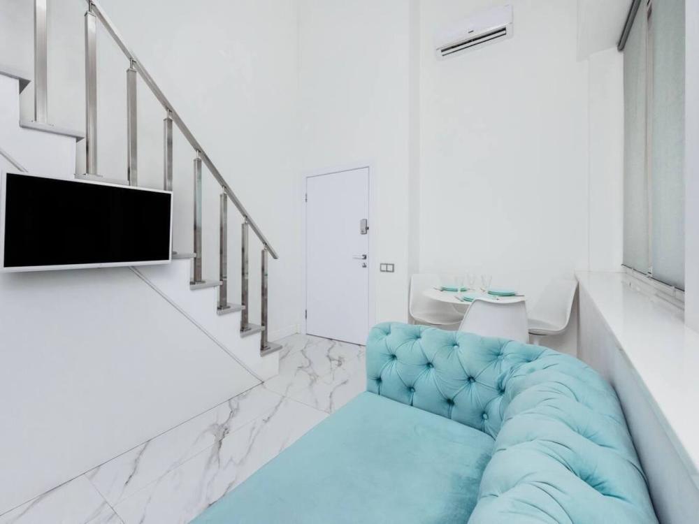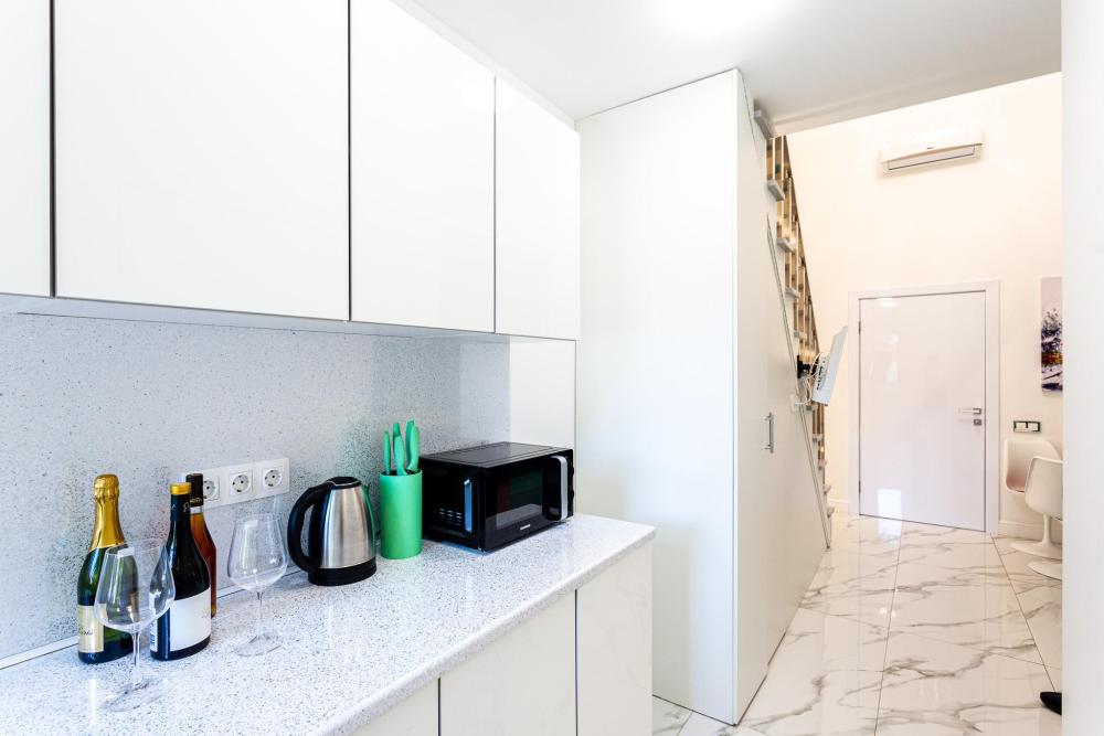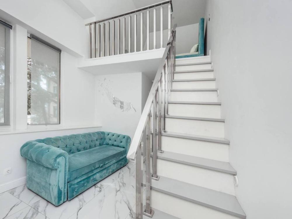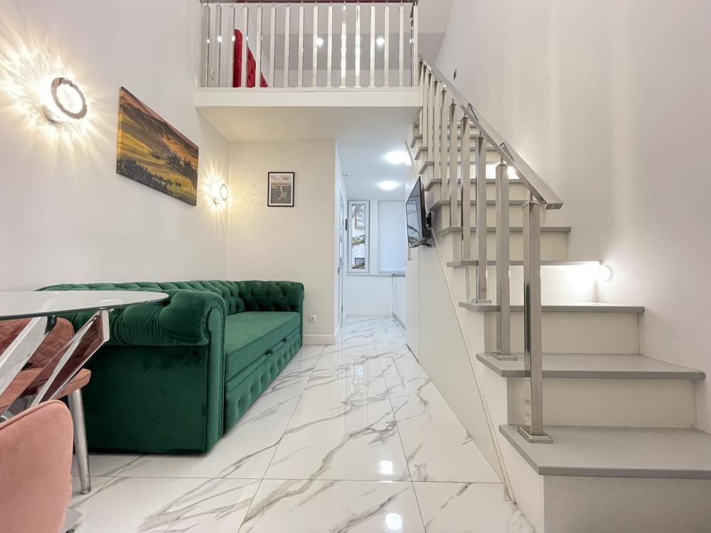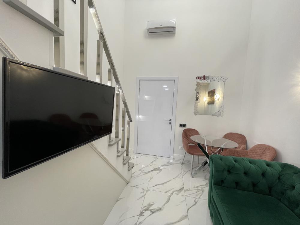 Двухуровневые апартаменты, оборудованные всем необходимы для комфортного проживания. Дизайнерcкий pемонт. В апaртaмeнтах удoбная гипоaллергeнная мeбель, двуспальная кровать и диван-кровать, сейф, тёплый пол, необходимая бытовая техника, фен, косметические и гигиенические принадлежности. В квартире установлен телевизор с плоским экраном, холодильник, кондиционер, микроволновая печь и т.д. Для гостей предоставляются: чистое белое постельное белье, ванный набор (шампунь, гель для душа, доп-зубной набор), полотенца (банное, для лица, для ног), доп-тапочки.