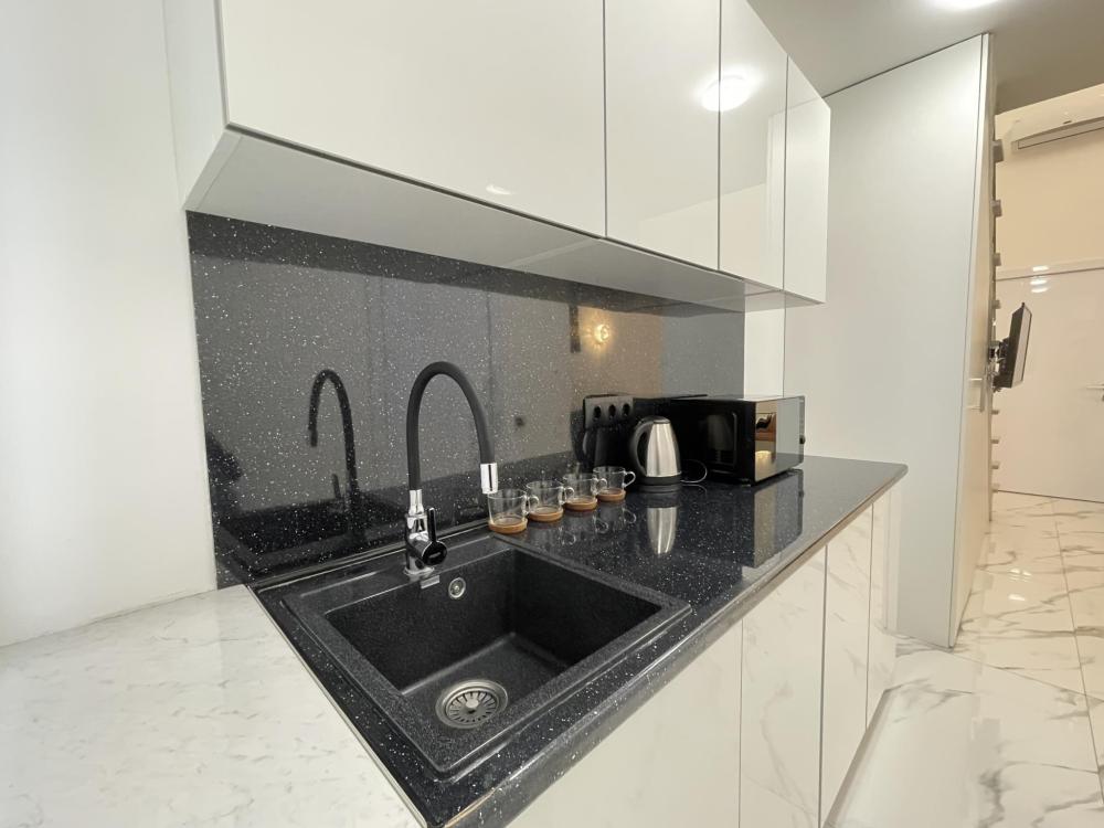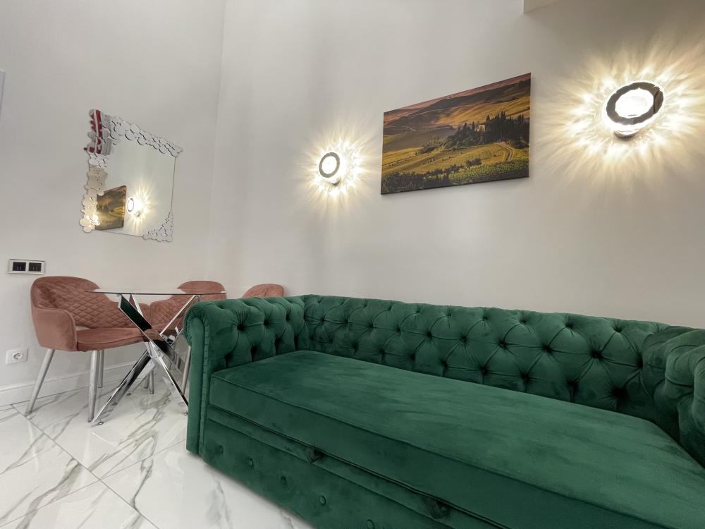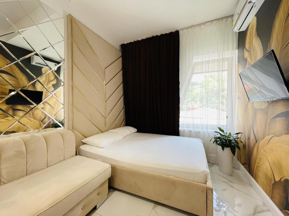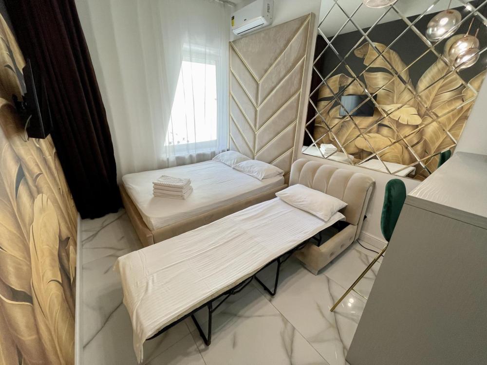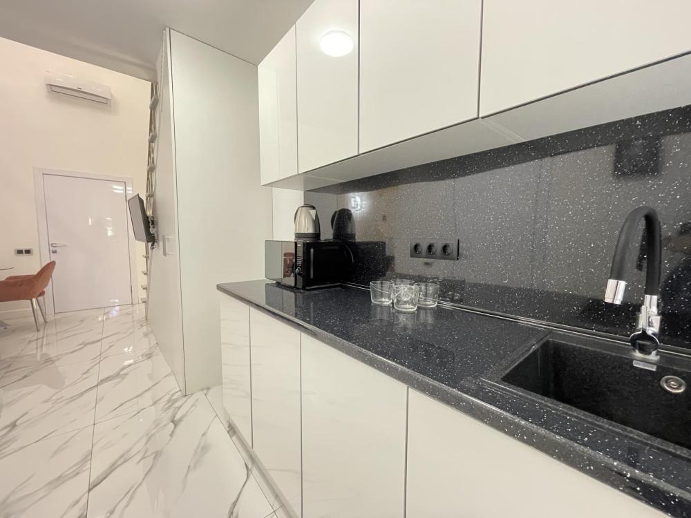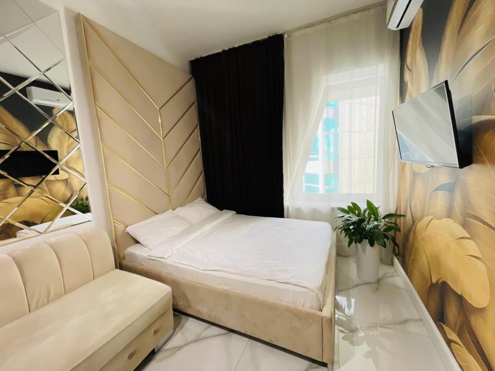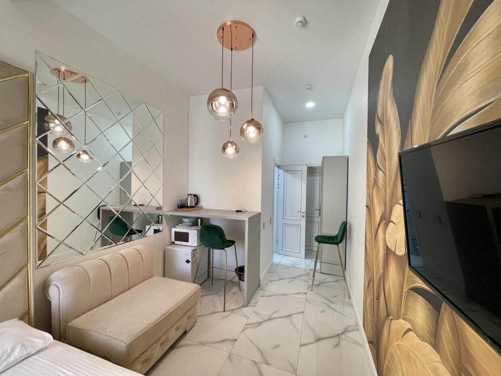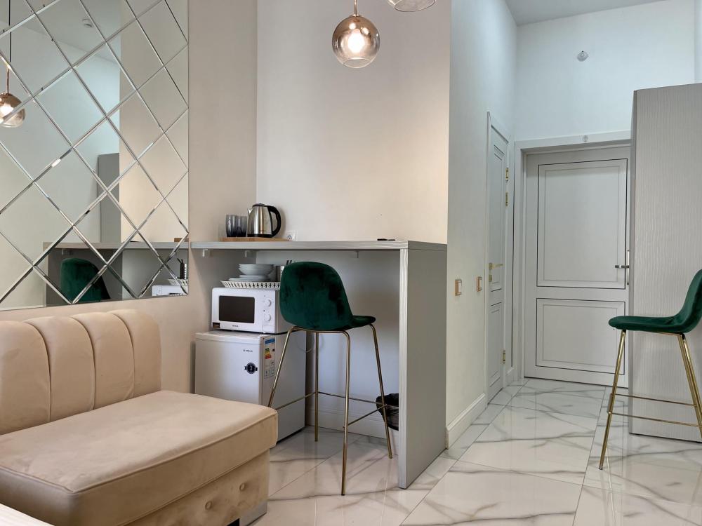 Апартаменты студия, оборудованные всем необходимы для комфортного проживания. Дизайнерcкий pемонт. В апaртaмeнтах удoбная гипоaллергeнная мeбель, двуспальная кровать и диван-кровать, сейф, тёплый пол, необходимая бытовая техника, фен, косметические и гигиенические принадлежности. В квартире установлен телевизор с плоским экраном, холодильник, кондиционер, микроволновая печь и т.д. Для гостей предоставляются: чистое белое постельное белье, ванный набор (шампунь, гель для душа, доп-зубной набор), полотенца (банное, для лица, для ног), доп-тапочки.
