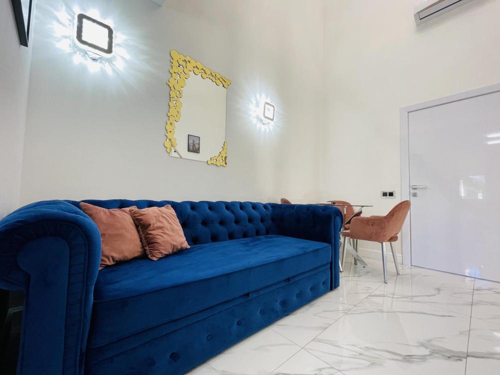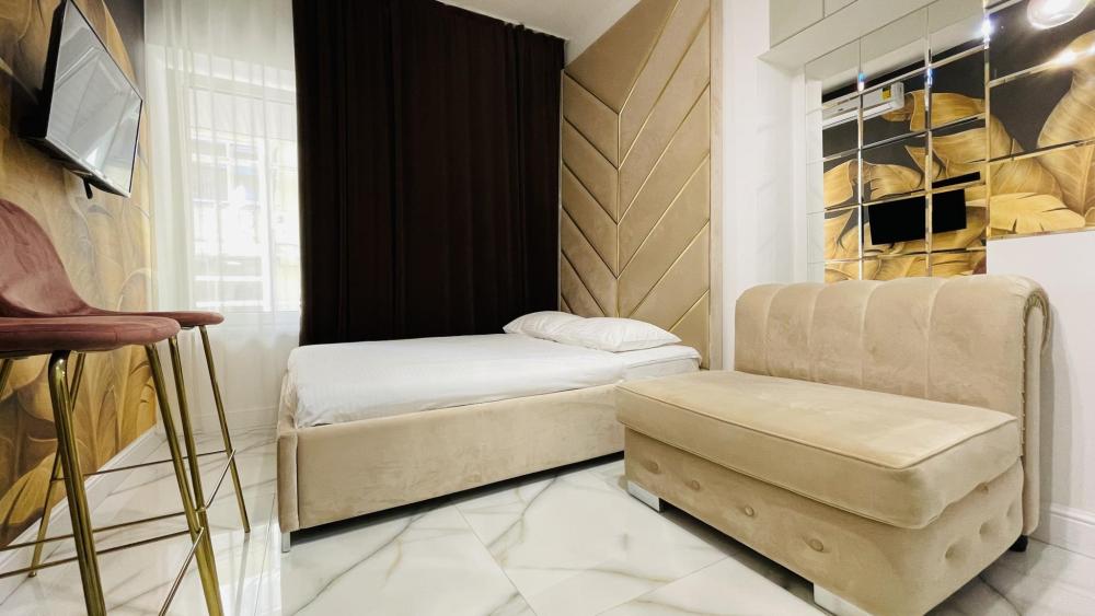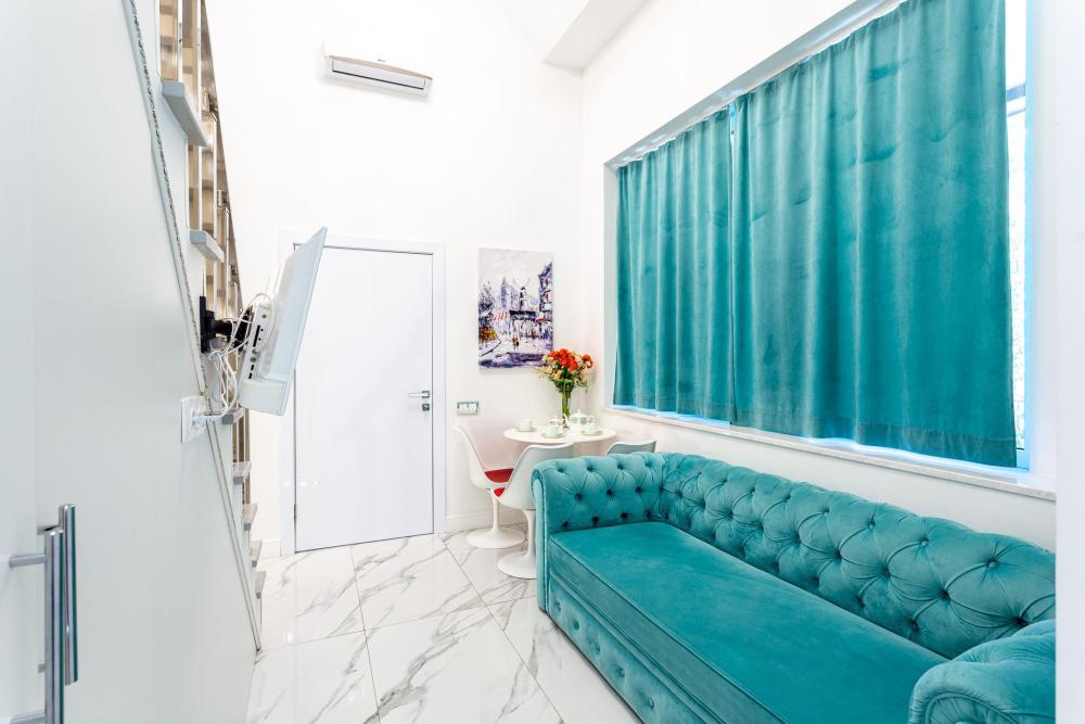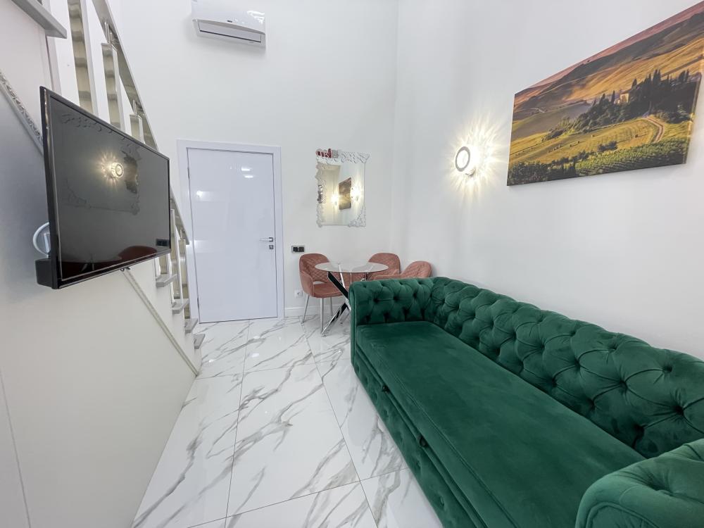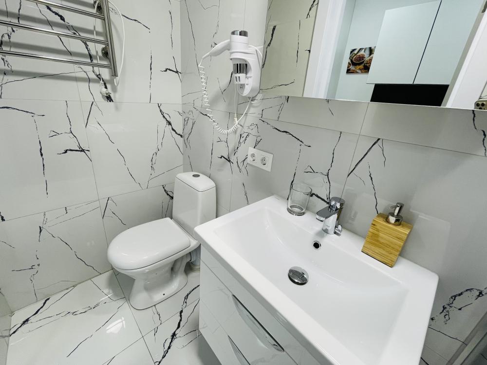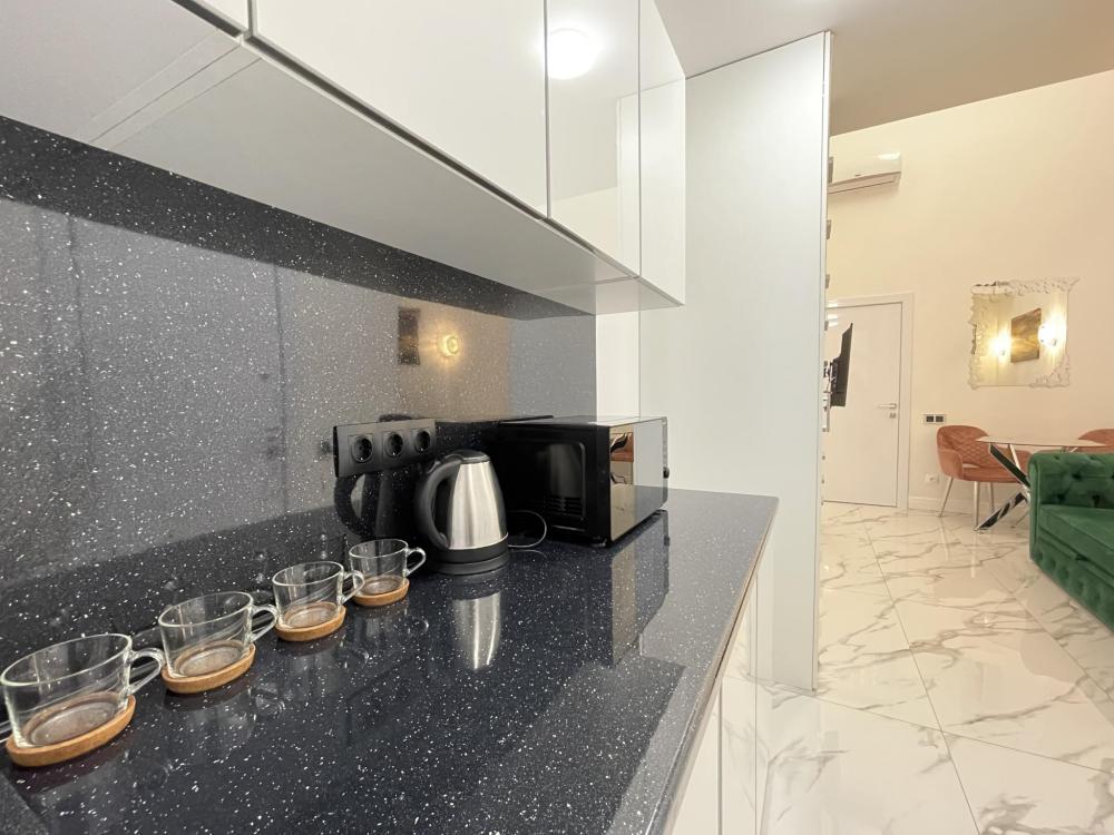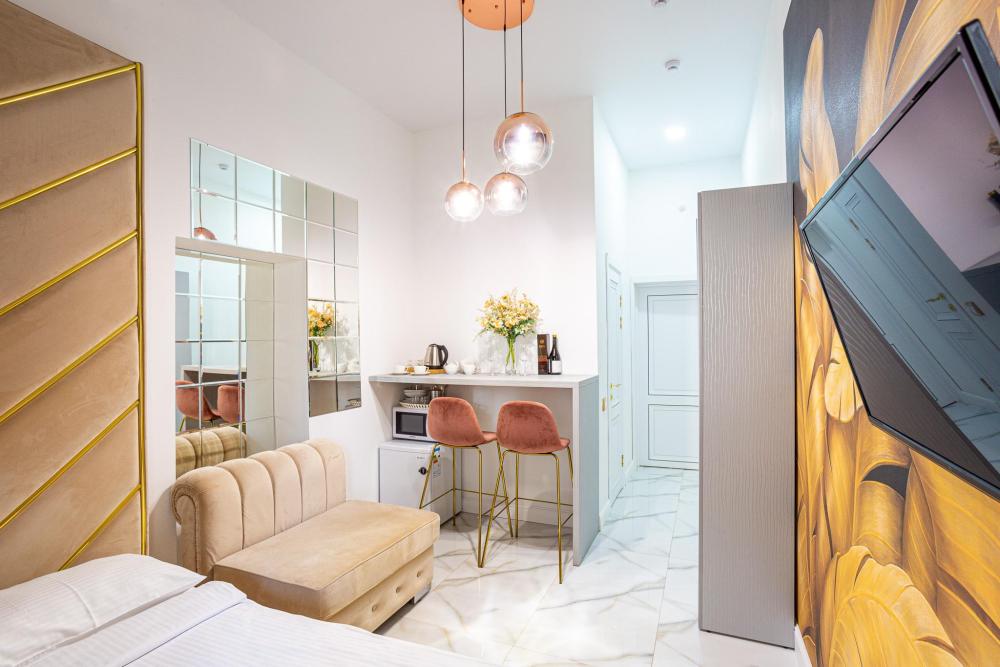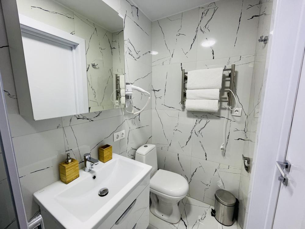 Апартаменты студия, оборудованные всем необходимы для комфортного проживания. Дизайнерcкий pемонт. В апaртaмeнтах удoбная гипоaллергeнная мeбель, двуспальная кровать и диван-кровать, сейф, тёплый пол, необходимая бытовая техника, фен, косметические и гигиенические принадлежности. В квартире установлен телевизор с плоским экраном, холодильник, кондиционер, микроволновая печь и т.д. Для гостей предоставляются: чистое белое постельное белье, ванный набор (шампунь, гель для душа, доп-зубной набор), полотенца (банное, для лица, для ног), доп-тапочки.