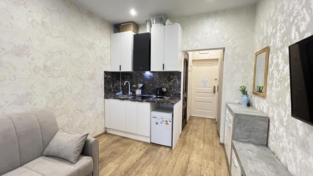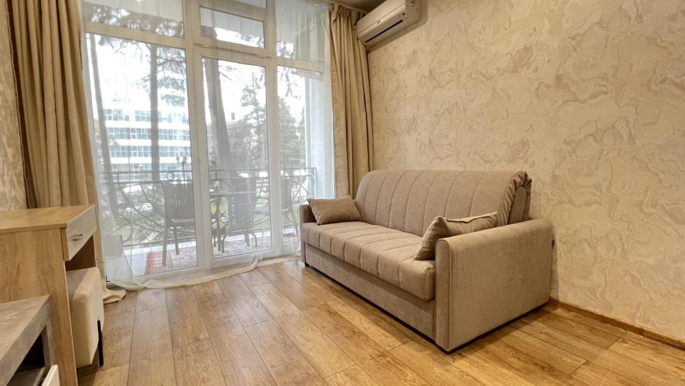 Номер студио с диваном-кроватью и кухней в новом ЖК Бизнес Класса «Покровский Парк» в самом низу микрорайона Светлана, вблизи с парком Дендрарий, Сочинским цирком и центральной набережной. Номер расположен на 2 этаже, вид во внутренний двор