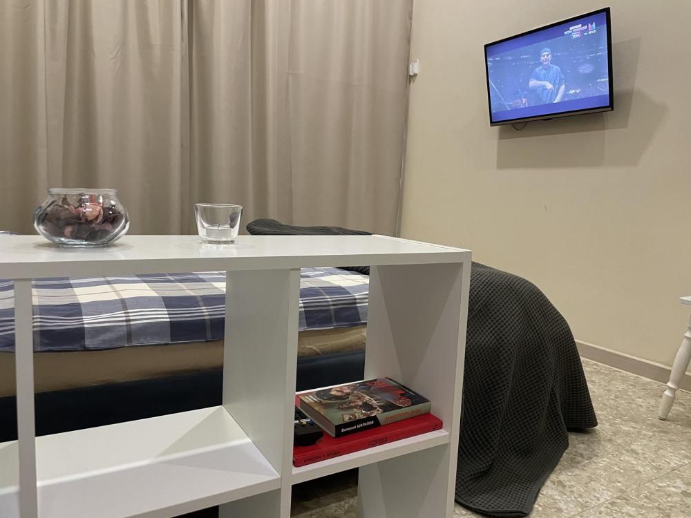 Апартаменты студия с вместимостью до 3 гостей. Квартира оборудована всем необходимым для комфортного проживания: диван, еврораскладушка, бытовая техника ,собственная ванная комната и туалет.