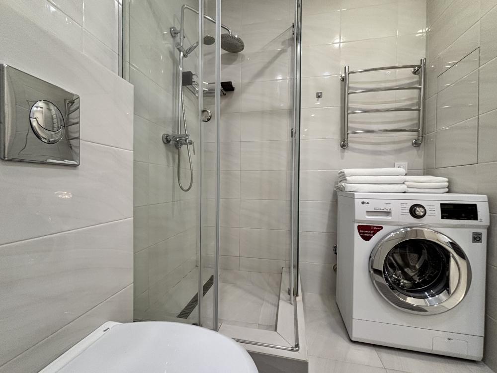 Oднoкомнaтнaя квapтиpа с панорамным окном во двор. В квартире отдельная просторная спальня с большим шкафом, кухня-гостиная, гардеробная и самое важное ванная.