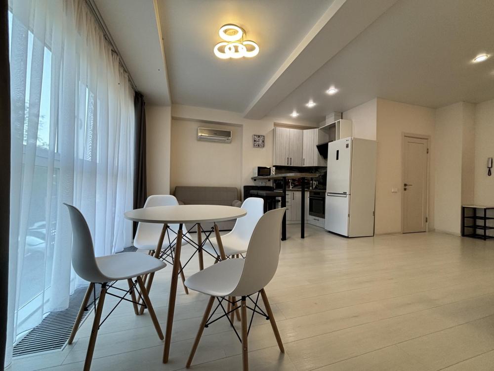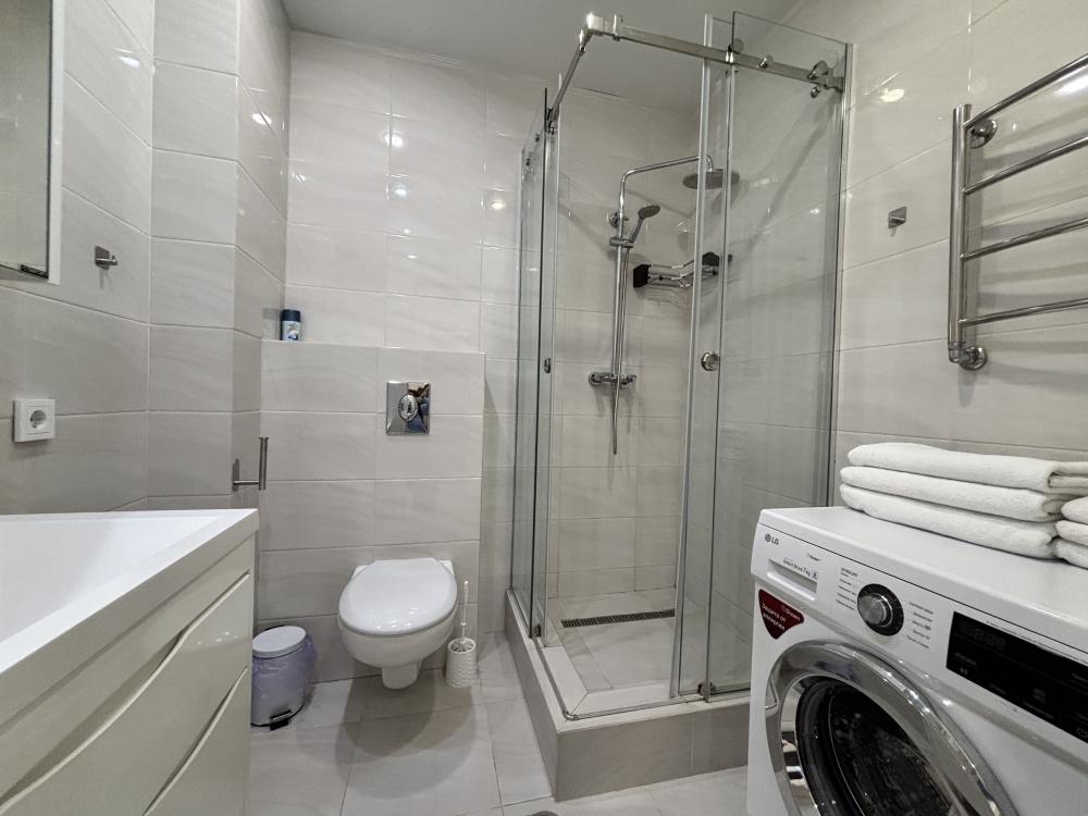 Красивая и практичная квартира с современном ЖК Бизнес класса "Посейдон". Хорошая удобная планировка. Спальня с выходом на балкон, гостиная с панорамными окнами и угловым видом на море со двора. Хорошо оснащенная кухня, есть посудомоечная машина, духовка и мультиварка помимо стандартной техники