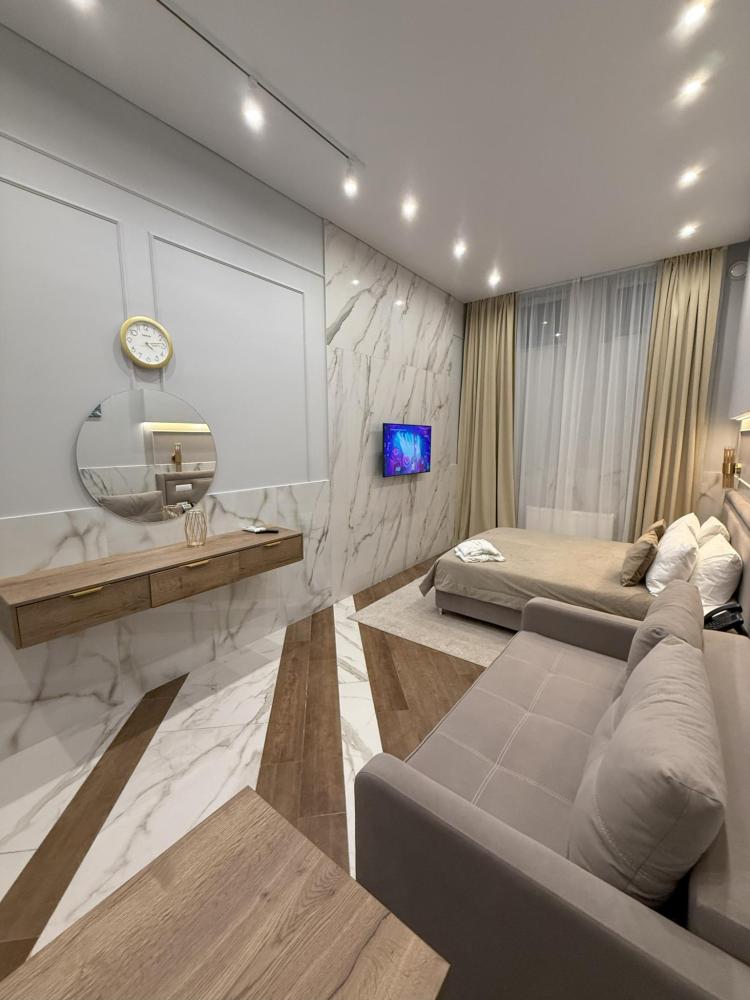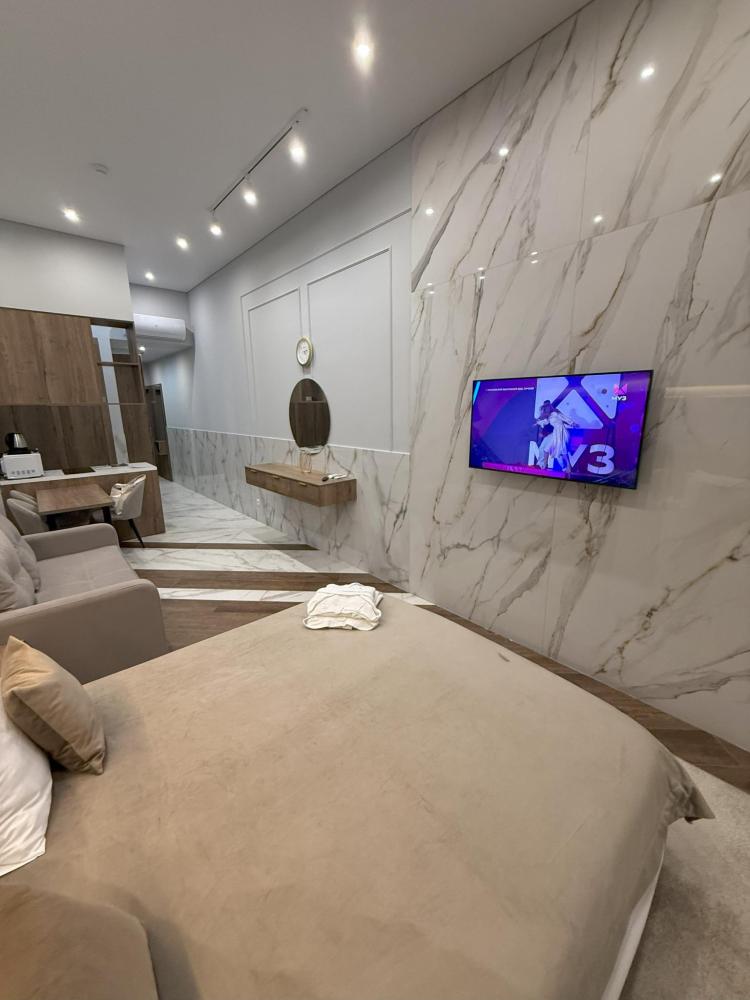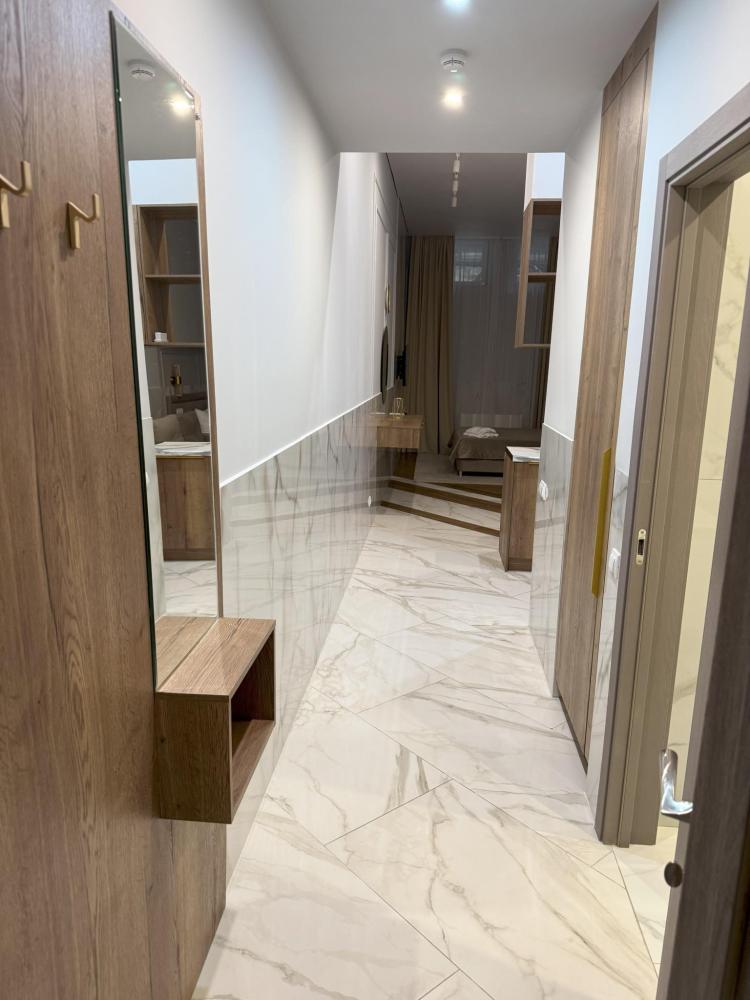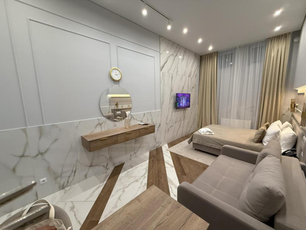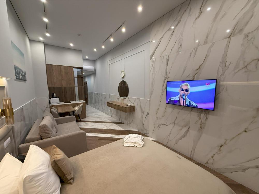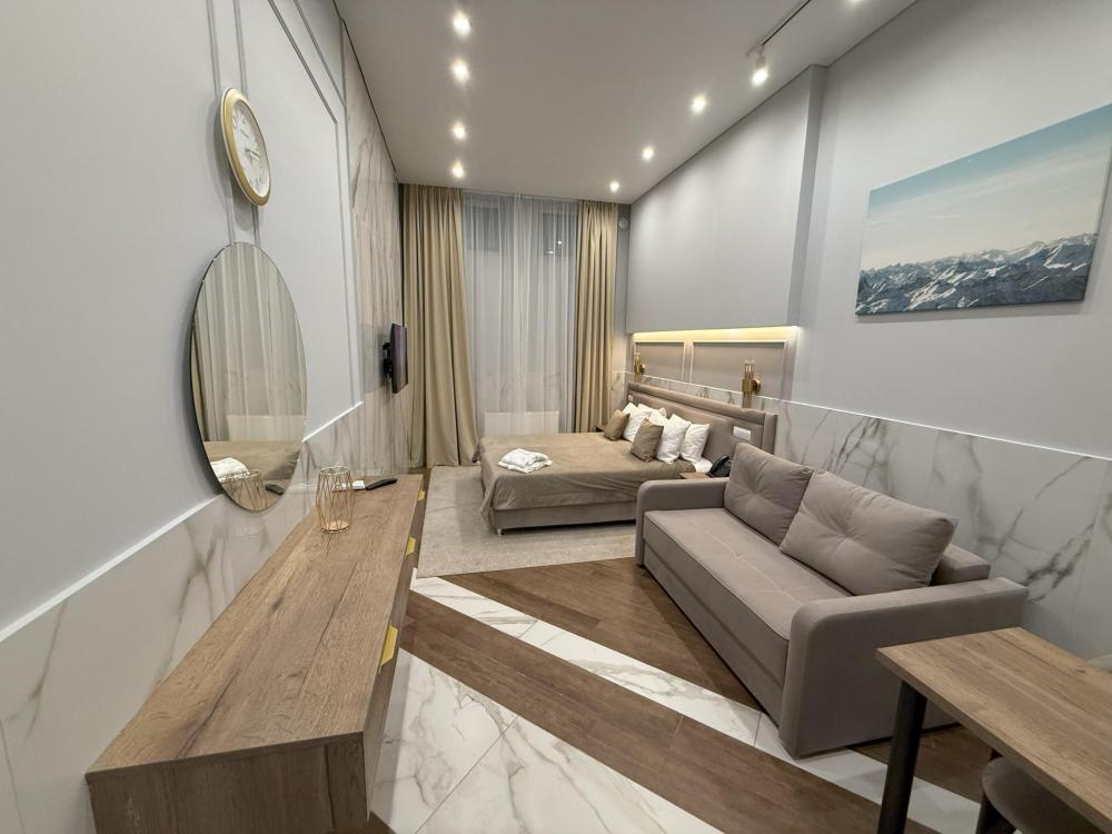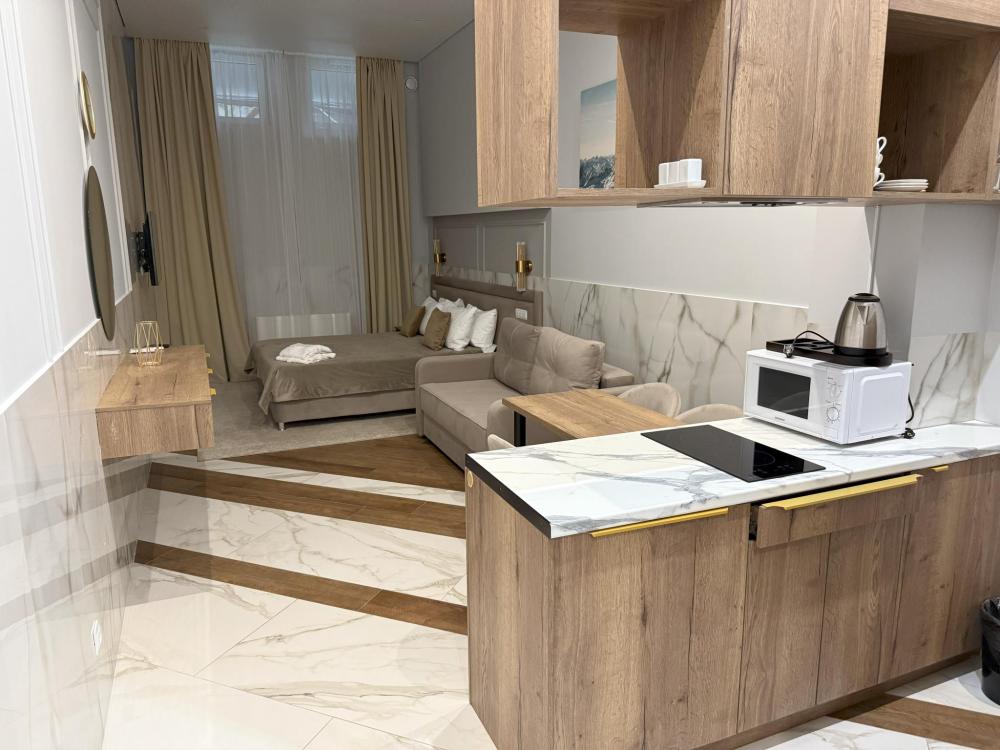 Апартаменты укомплектованы всем необходимым для комфортного проживания: - Апартаменты расположены на нулевом этаже, где имеется окно под потолком. - Двуспальная кровать 160×200 с ортопедическим матрасом, качественное постельное бельё, вместительный шкаф для одежды, кондиционер, Smart-TV - Кухонная зона: холодильник, микроволновая печь, электрический чайник, варочная панель, необходимая посуда и кухонные принадлежности - Ванная комната: санузел с душем, фен, чистые полотенца, халат, косметические принадлежности (шампунь, гель для душа, жидкое мыло) - Также в вашем распоряжении: утюг и гладильная доска ⚠ Важно знать: Апартаменты не предоставляют гостиничные услуги (уборка, смена белья, рум-сервис, трансфер)