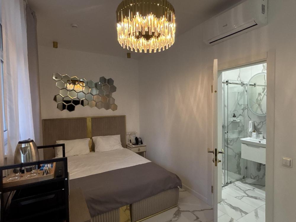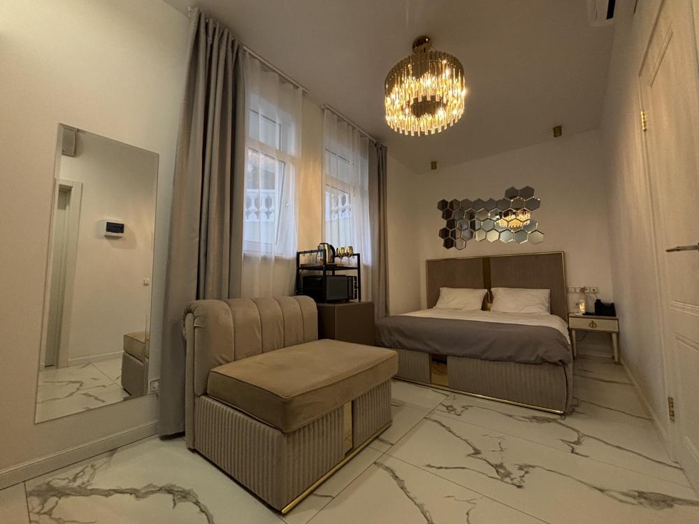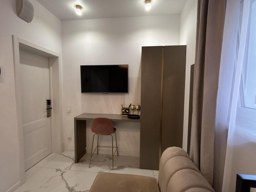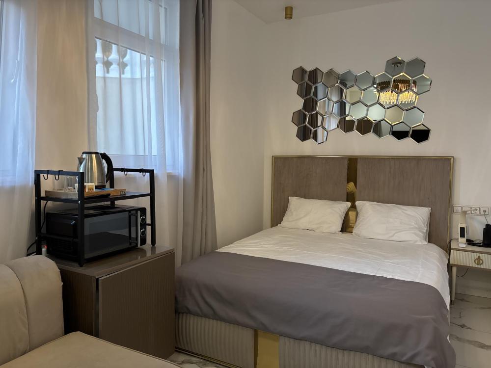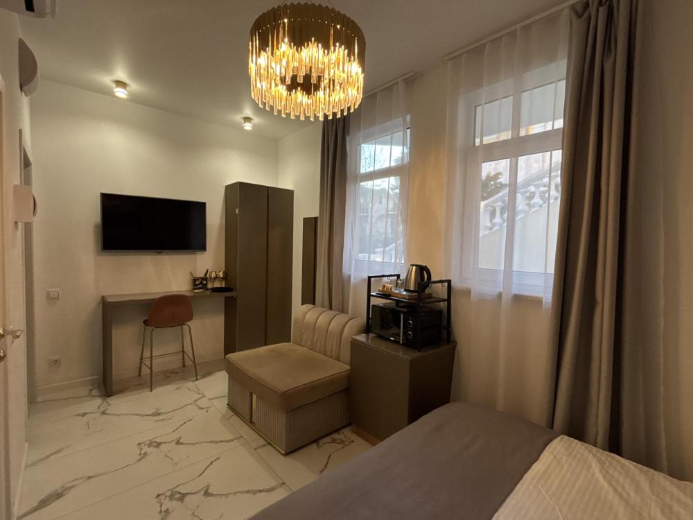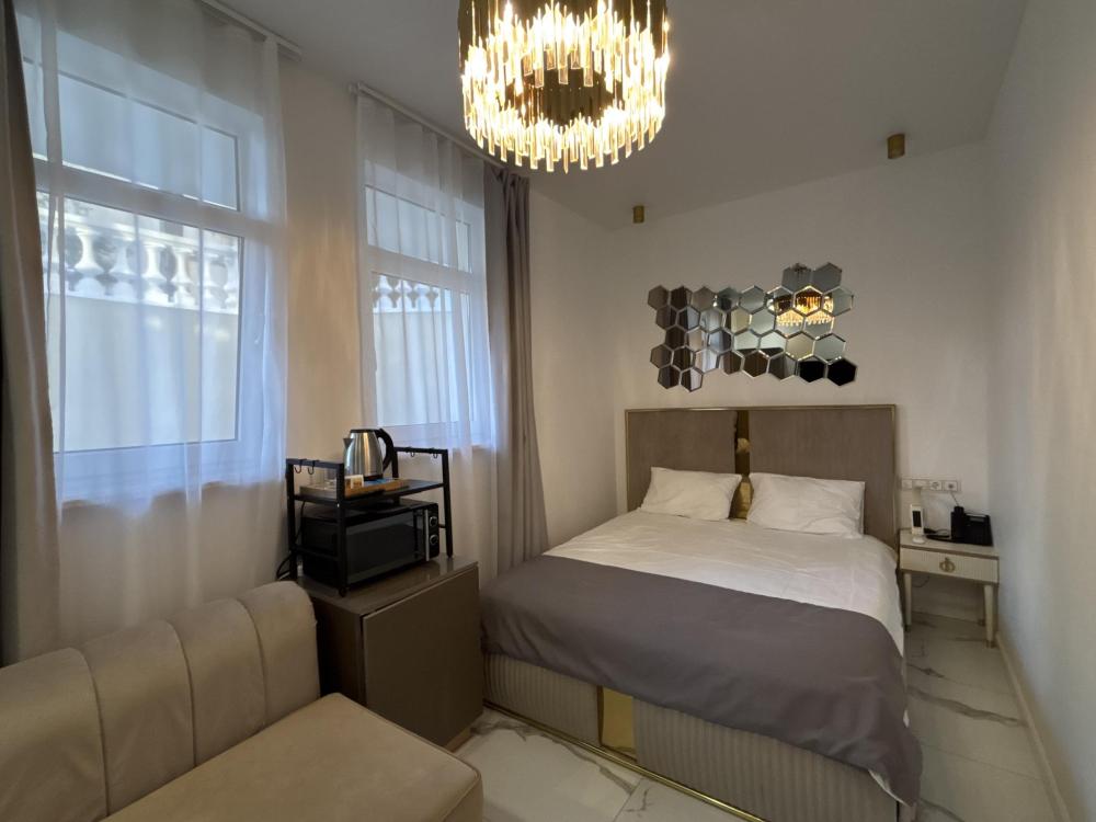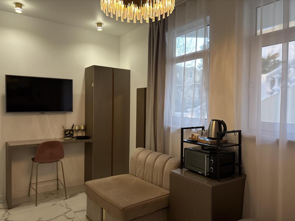 Апартаменты рассчитаны на 2 гостей. Вас ждет двуспальная кровать King Size ортопедическим матрасом. Есть небольшой холодильник, микроволновая печь, электрический чайник, необходимая посуда, для тех. А также есть возможность заказать обслуживание в номер или посетить прекрасные рестораны и кафе, расположенные на терри тории отеля. Номер оборудован гладильными принадлежностями. Отличный телевизор, скоростной Wi-Fi позволят вам и отдохнуть, и поработать при необходимости. Ванная комната оснащена душевой кабиной, снабжена всеми необходимыми косметическими средствами. Возможно бесконтактное заселение.