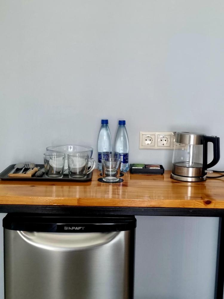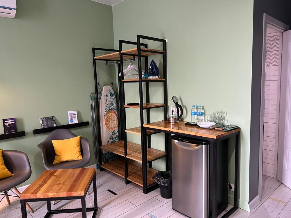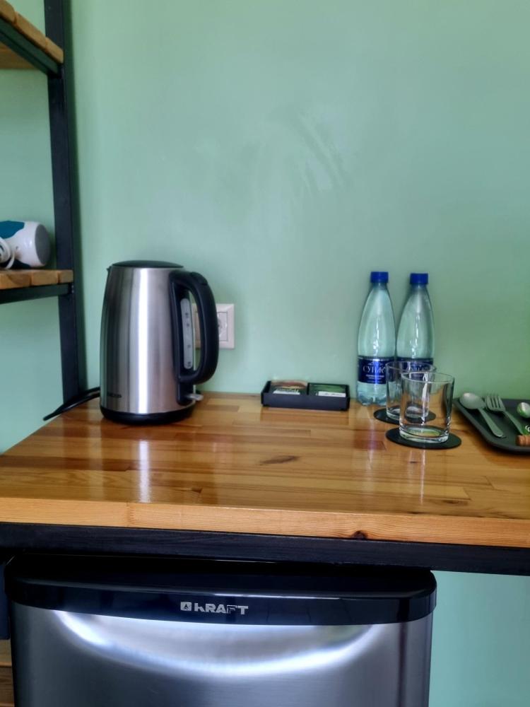 Комфортабельная квартира-студия площадью 25 м2 в 20 минутах от моря неспешным шагом. Теплые полы (в холодное время), точечное освещение, своя мини-кухня с холодильником, совмещенный санузел с душевой кабиной. Шторы блэкаут. Двуспальная кровать ручной работы с ортопедическим матрасом. Вместительный зеркальный шкаф. Обеденный гарнитур. Своя терраса со столиком. Для удобства есть дополнительное скрытое место под телевизором (полноценная кровать с матрасом). Индивидуальный вход в студию. В номере есть всё для комфортного проживания: Холодильник, кондиционер, чайник, набор посуды, стол, приветственный чайный набор. Набор полотенец, индивидуальный душевой набор (мыло, зубной набор, шампунь, гель для душа). В номере фен, утюг, сушилка для белья, гладильная доска, жк-телевизор с wi-fi.