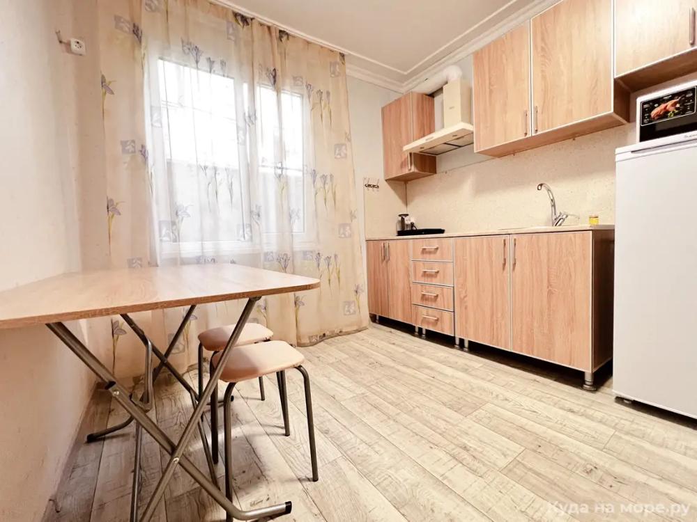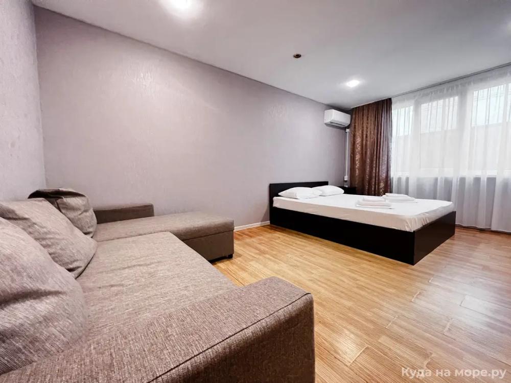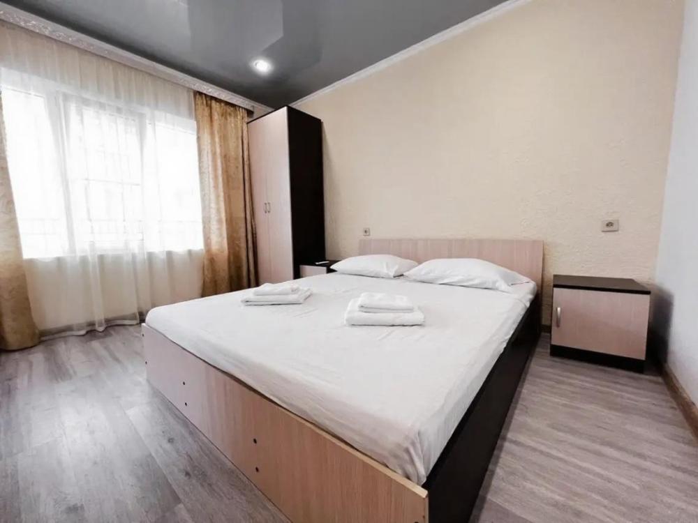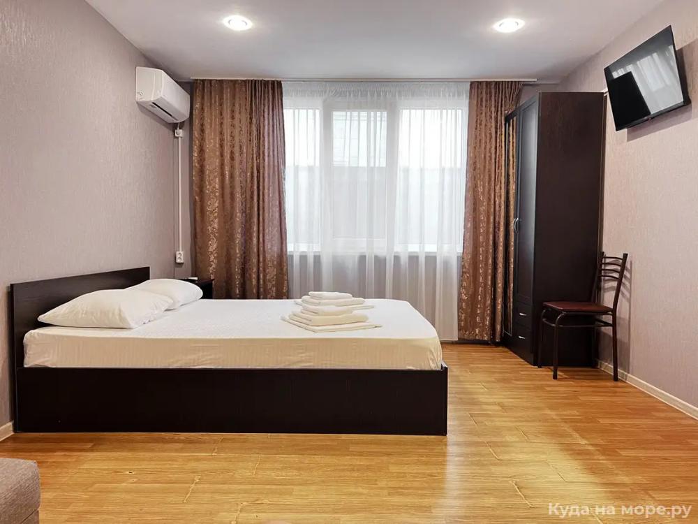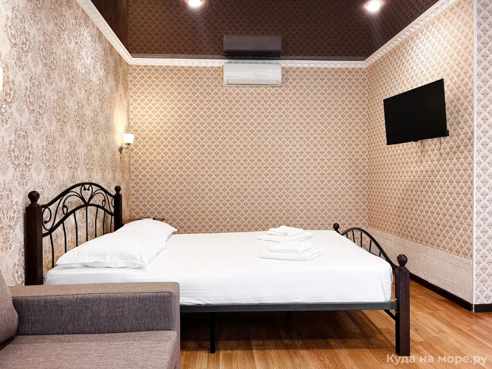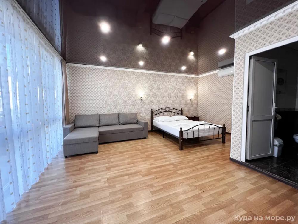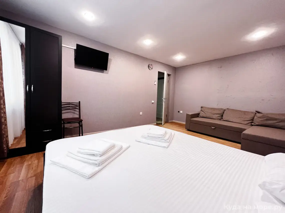 Четырехместный номер с двуспальной и двухместным диваном. Санузел, туалетные принадлежности в номере. Кондиционер, холодильник, ЖК телевизор, шкаф, тумбы.