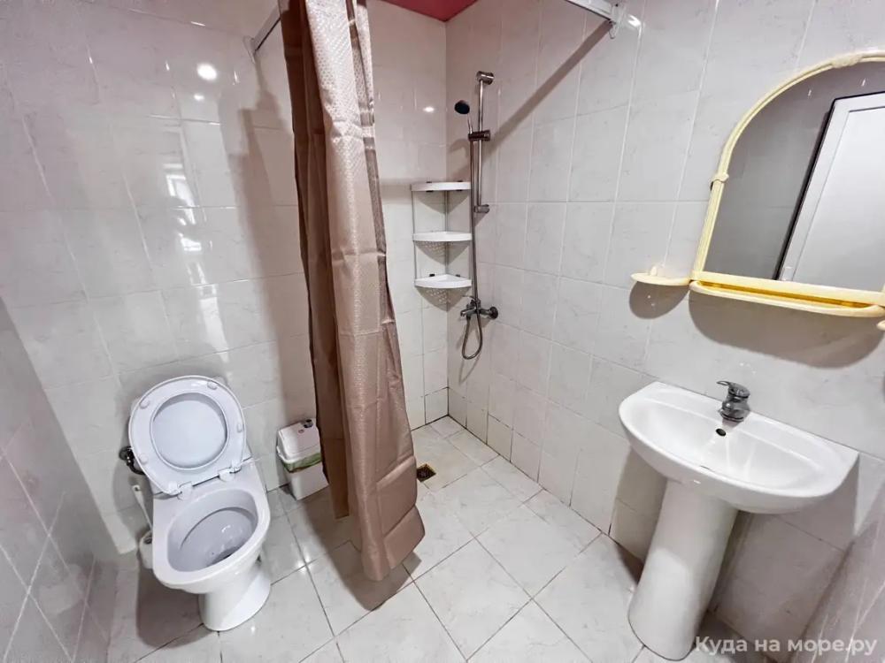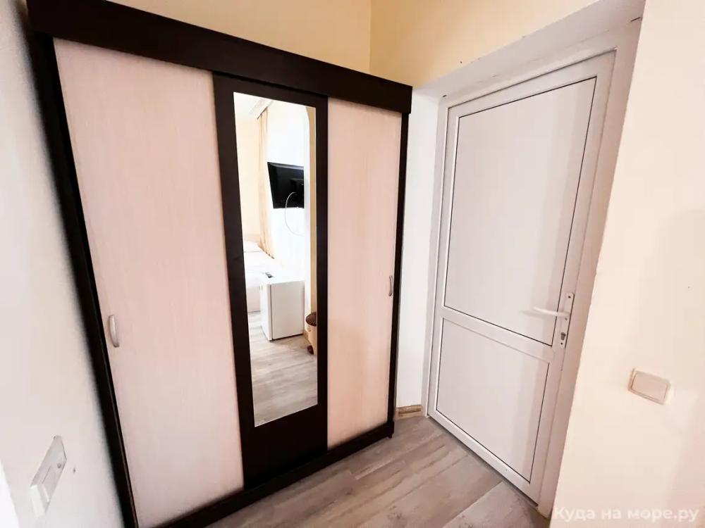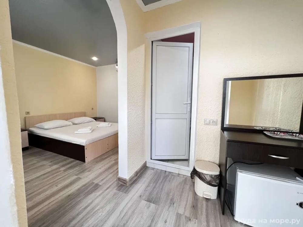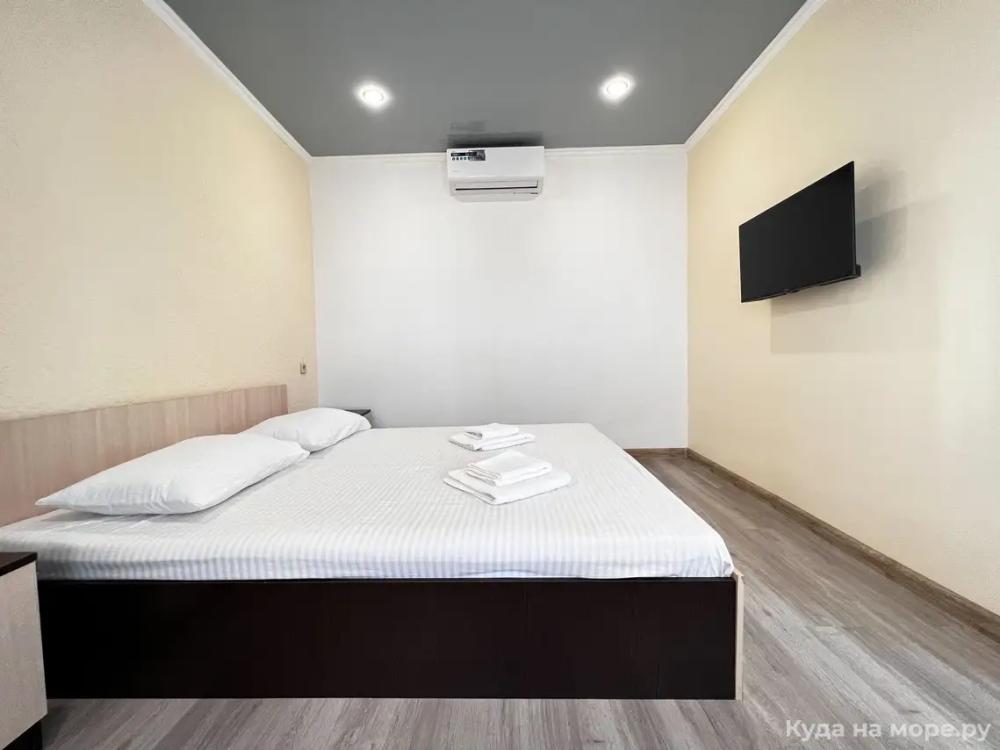 Пятиместный номер с двуспальной кроватью, раскладным диваном и двухярусной кроватью. Санузел, туалетные принадлежности в номере. Кондиционер, холодильник, ЖК телевизор, шкаф, тумбы.