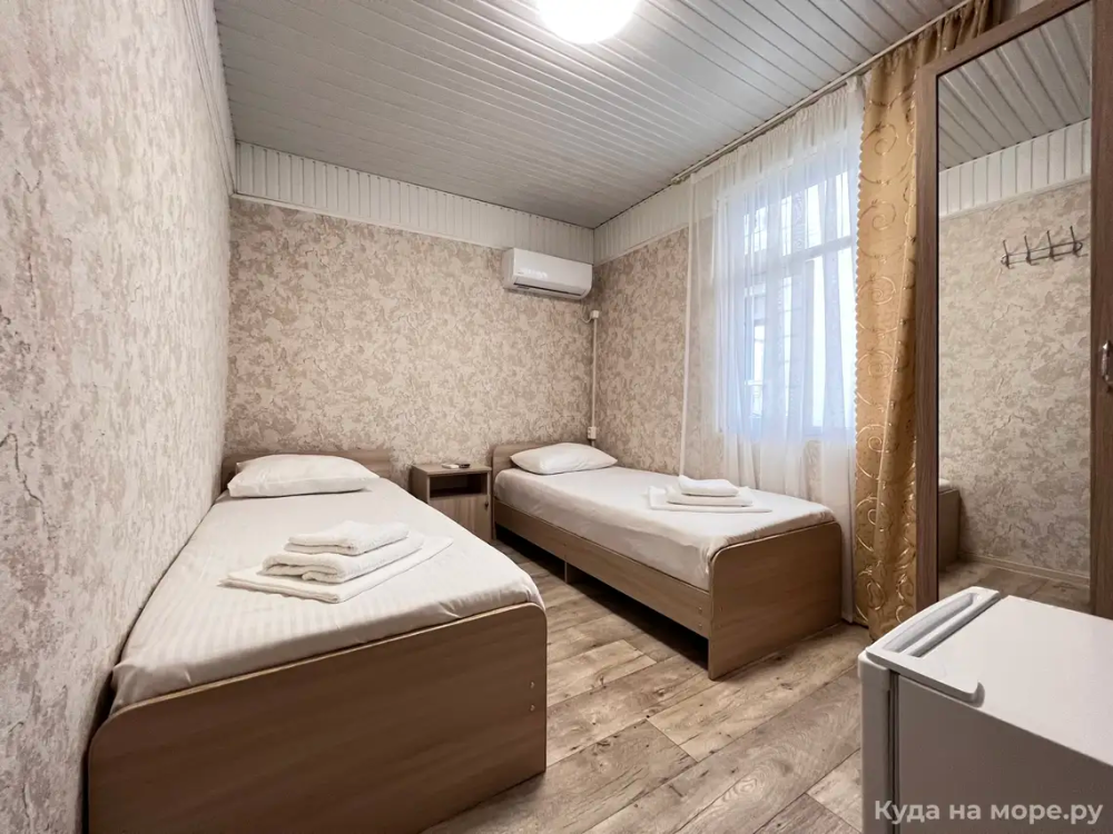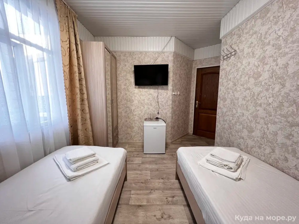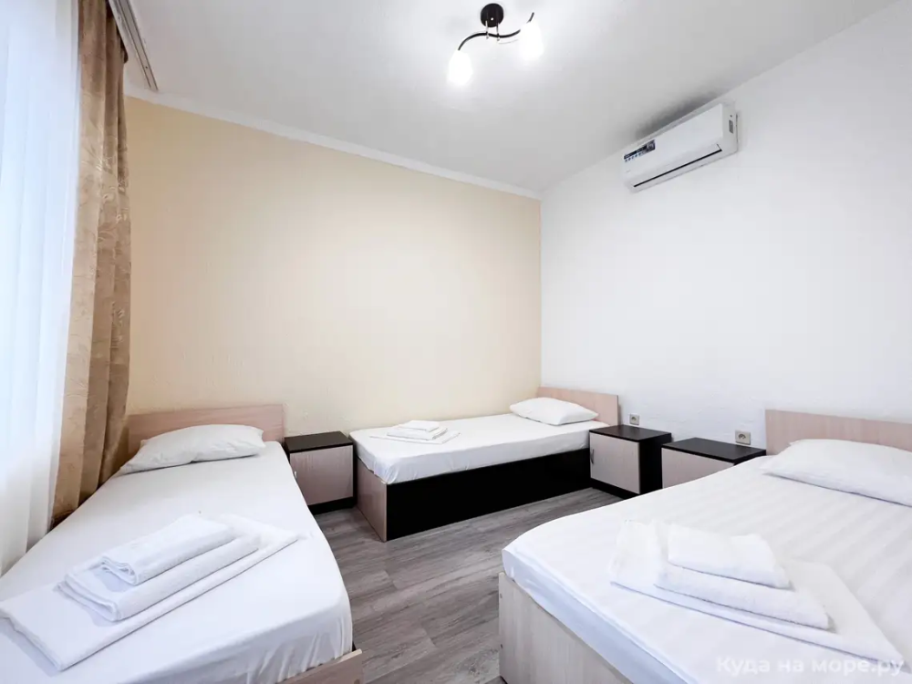 Трехместный номер с двуспальной и одной односпальной кроватью. Санузел, туалетные принадлежности в номере. Кондиционер, холодильник, ЖК телевизор, шкаф, тумбы.