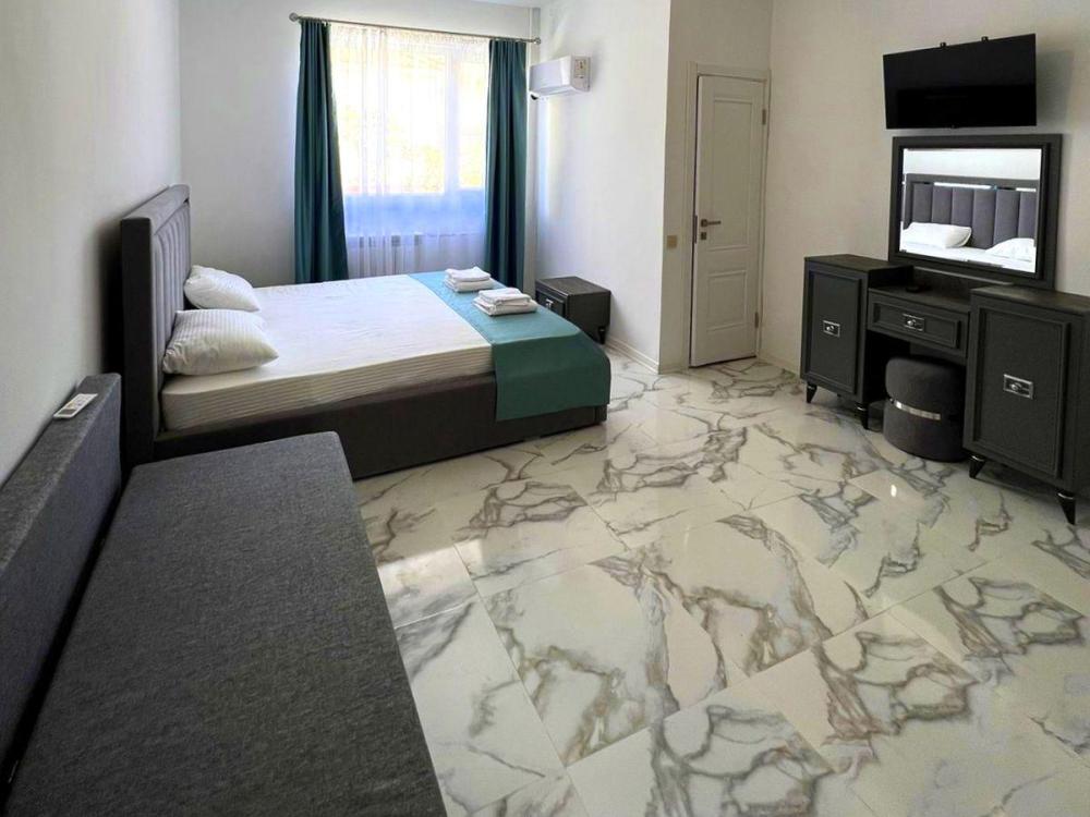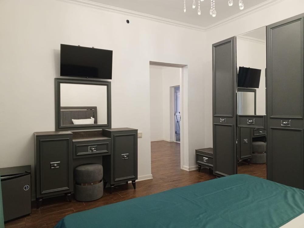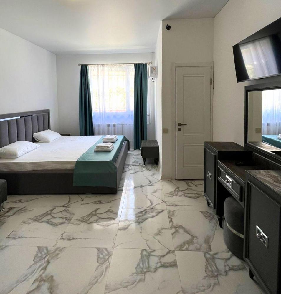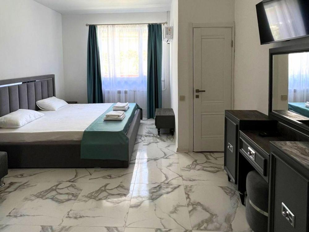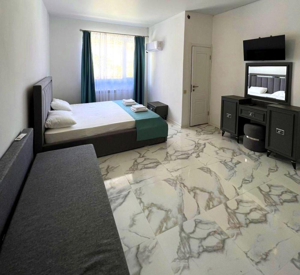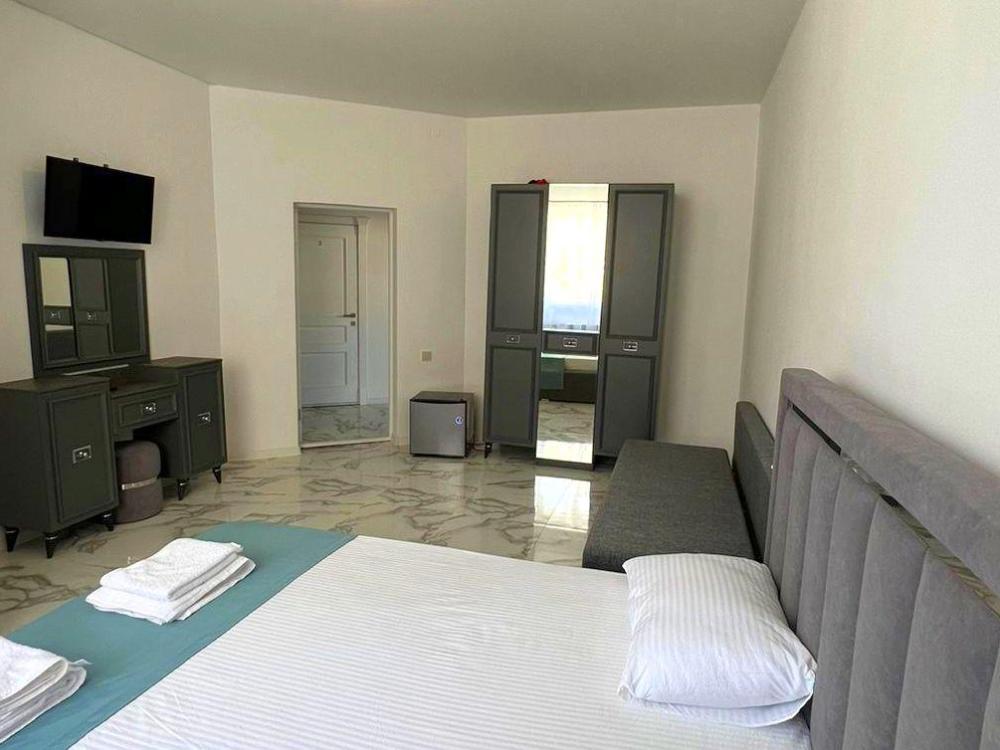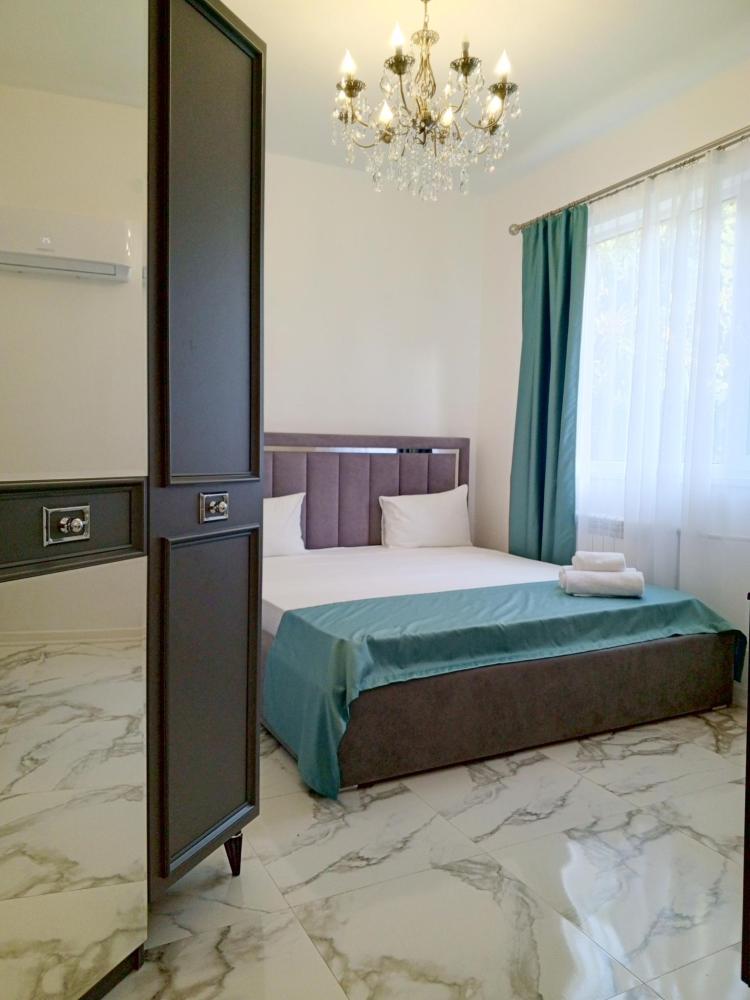 Четырехместная комната стандарт семейная с одной двуспальной кроватью и двуспальным диваном с балконом, площадью 35 кв.м. Оснащение: двухспальная кровать, диван, холодильник, телевизор, кондиционер, чайник, балкон, собственный санузел, фен. Комнаты данной категории расположены на 2-м этаже. В общем доступе утюг, гладильная доска сушилки для одежды, микроволновая печь. Уборка и смена белья, полотенец производится на 5-ый день проживания.