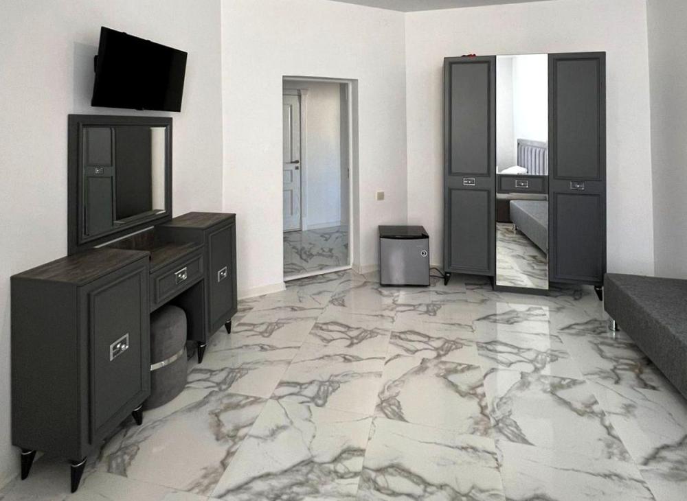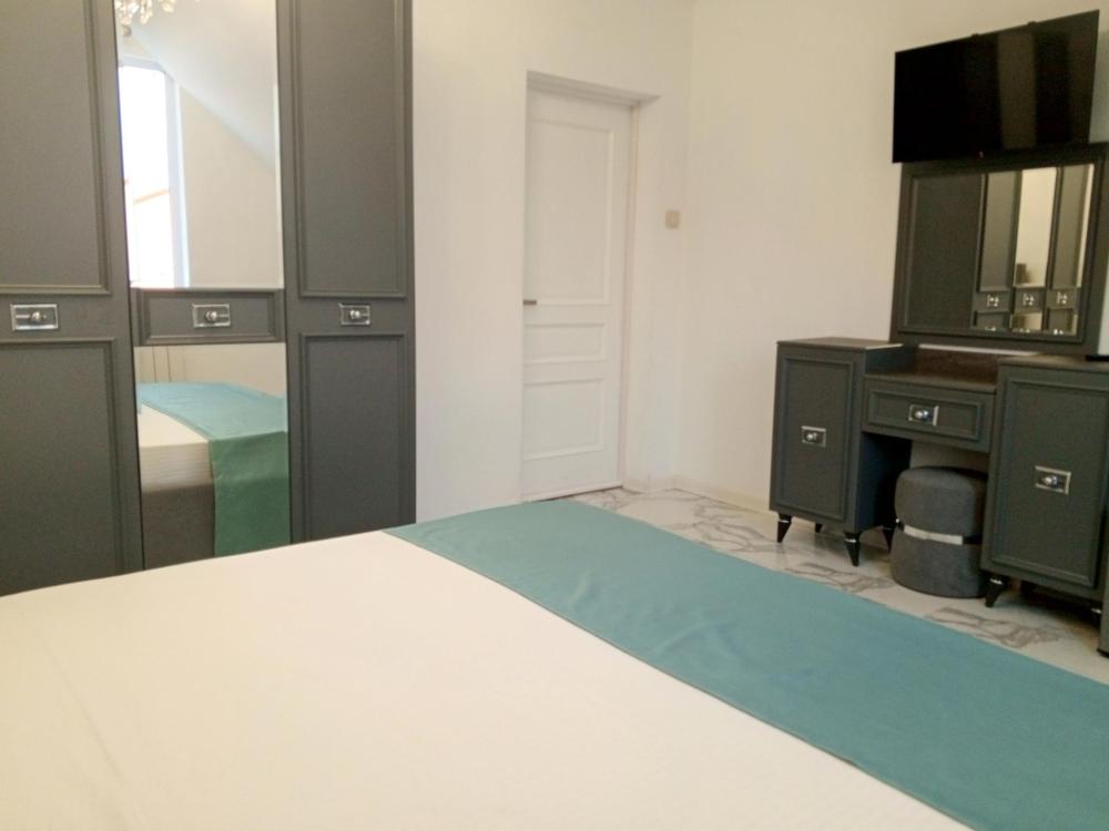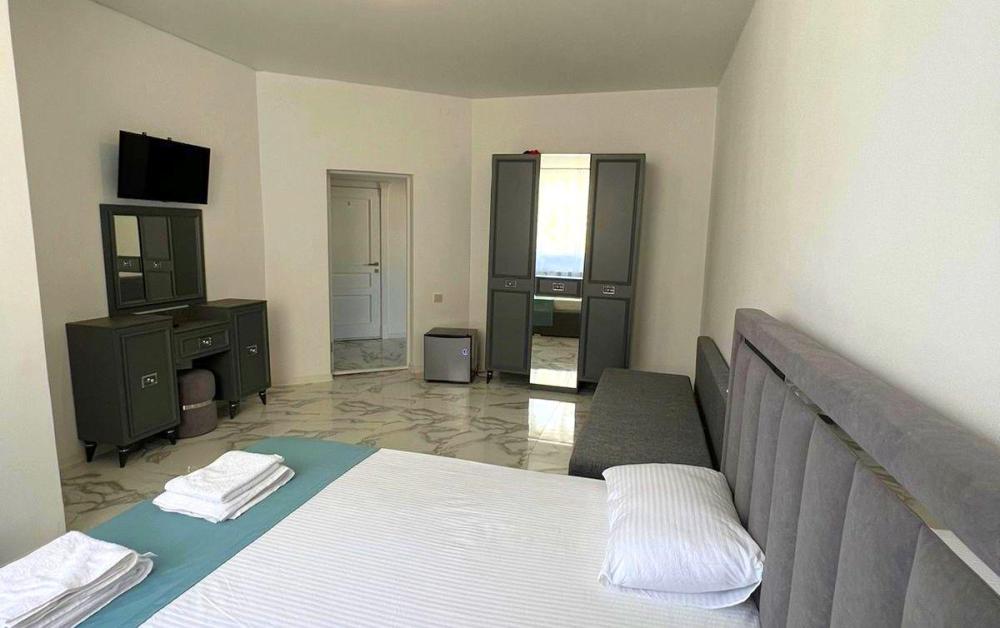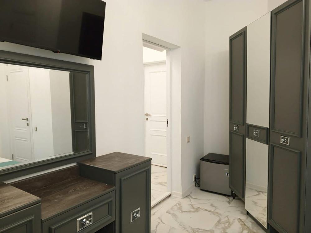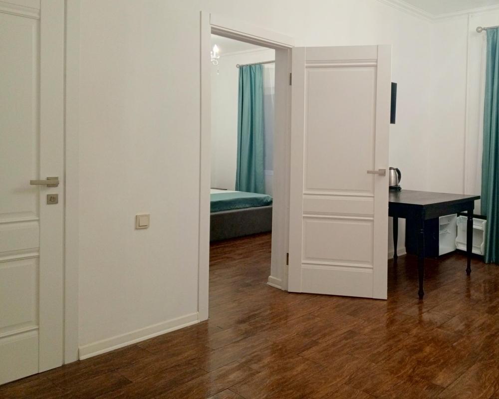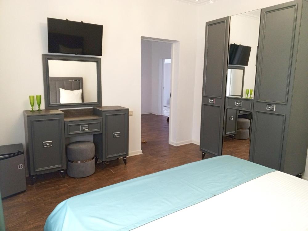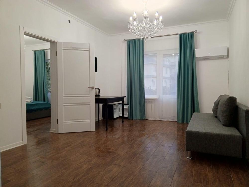 Четырехместная комната стандарт семейная с одной двуспальной кроватью и двуспальным диваном с балконом, площадью 35 кв.м. Оснащение: двухспальная кровать, диван, холодильник, телевизор, кондиционер, чайник, балкон, собственный санузел, фен. Комнаты данной категории расположены на 2-м этаже. В общем доступе утюг, гладильная доска сушилки для одежды, микроволновая печь. Уборка и смена белья, полотенец производится на 5-ый день проживания.