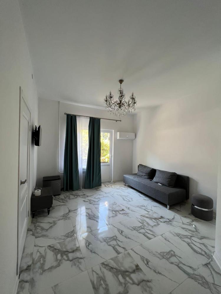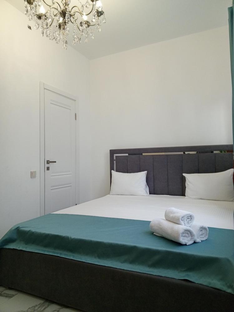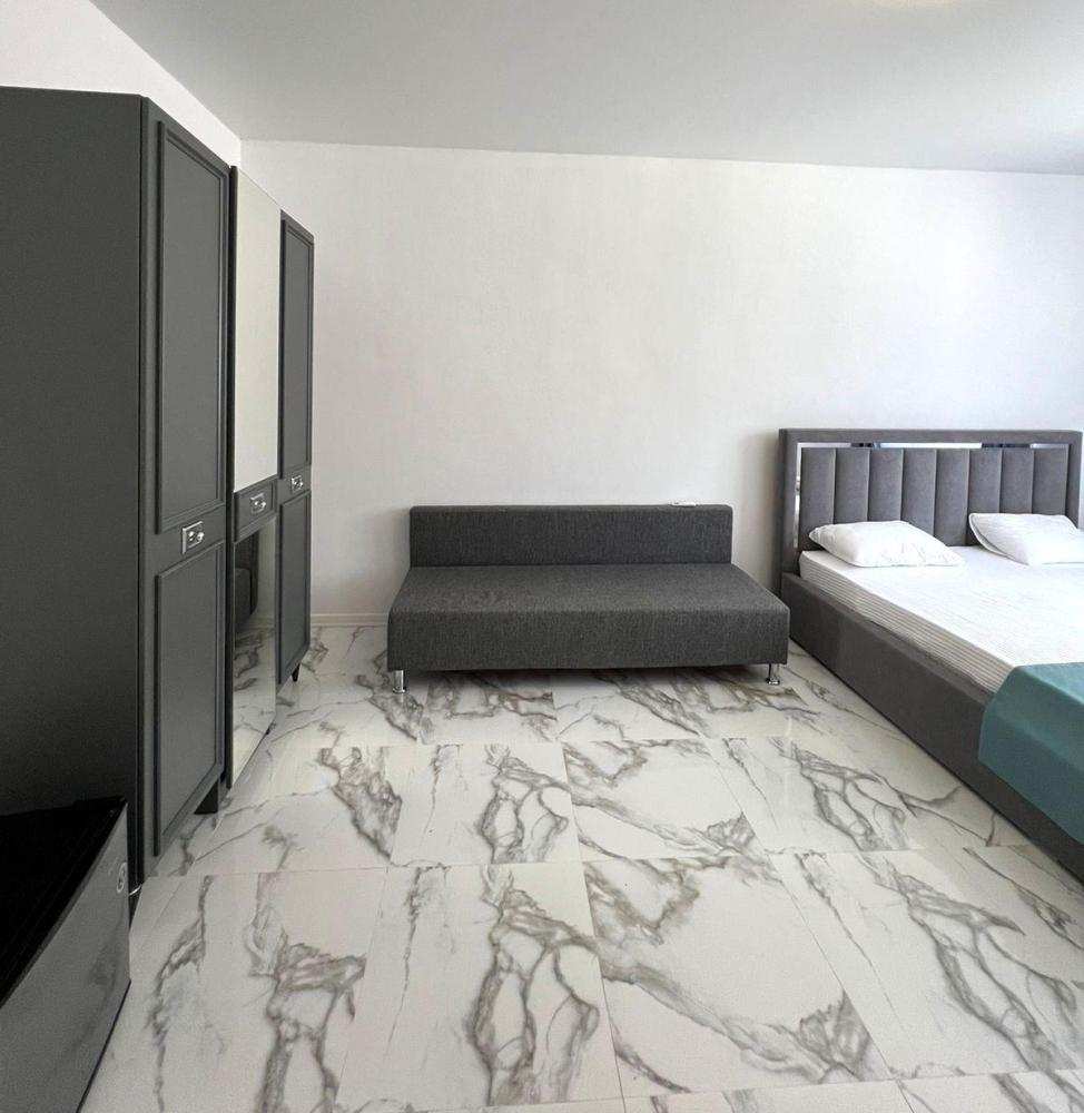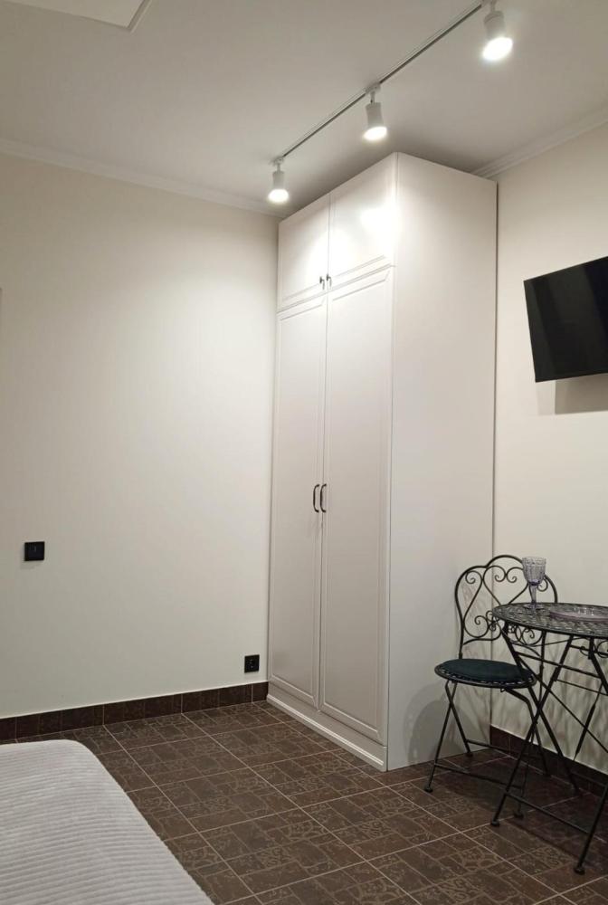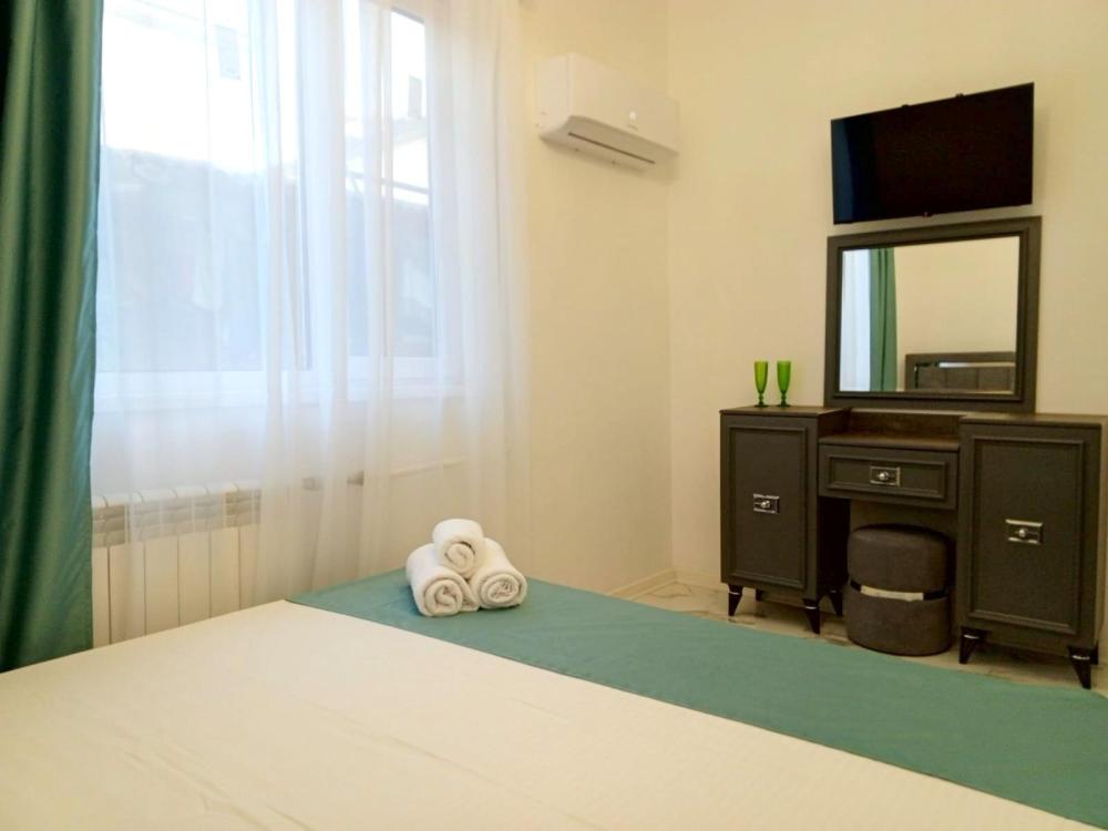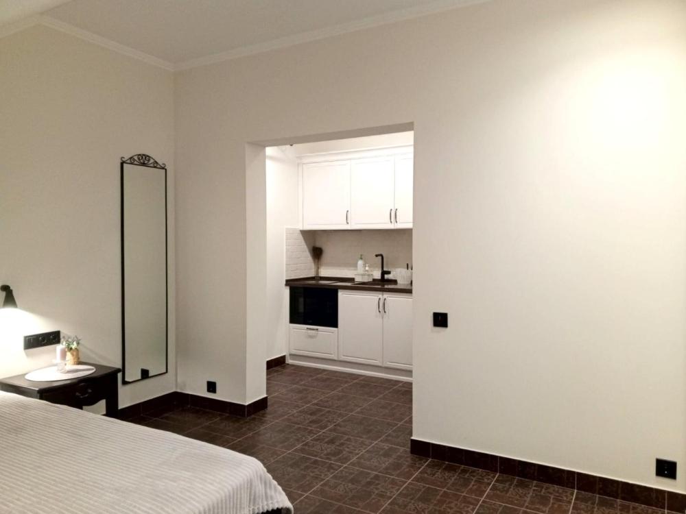 Апартаменты студия с балконом и кухней в номере с одной двуспальной кроватью и односпальной кроватью, площадью 22 кв.м. Оснащение: максимальное количество гостей - 3, собственный санузел, кухонный гарнитур, варочная панель, микроволновая печь, фен, холодильник, телевизор, кондиционер, чайник. Апартаменты данной категории расположены на 4 этаже. В общем доступе утюг, гладильная доска, сушилки для одежды,микроволновая печь. Уборка в номере и смена белья, полотенец производится на 5-ый день проживания.