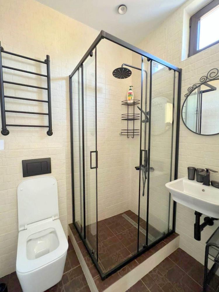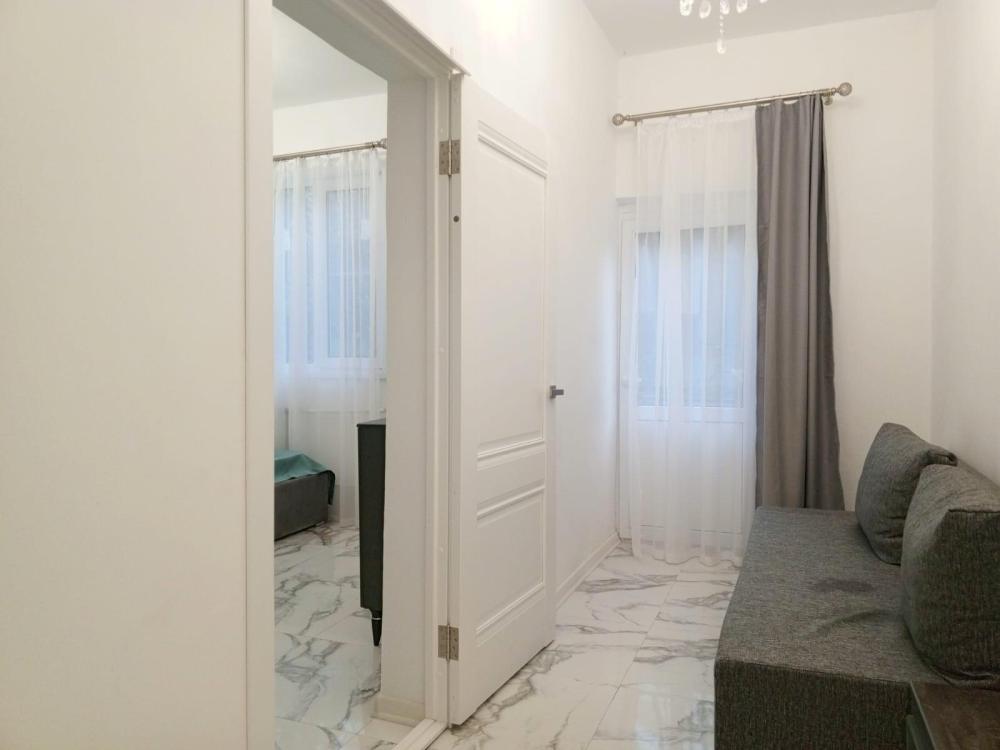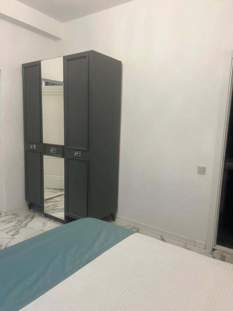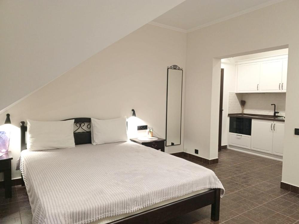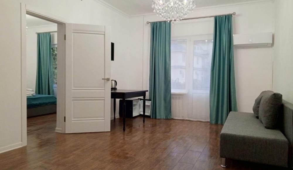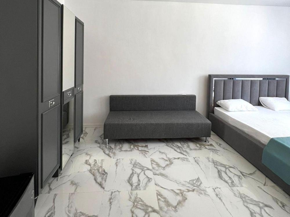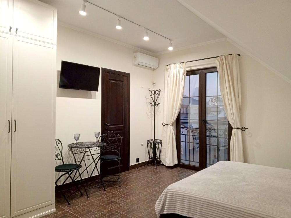 Апартаменты студия с балконом и кухней в номере с одной двуспальной кроватью и односпальной кроватью, площадью 22 кв.м. Оснащение: максимальное количество гостей - 3, собственный санузел, кухонный гарнитур, варочная панель, микроволновая печь, фен, холодильник, телевизор, кондиционер, чайник. Апартаменты данной категории расположены на 4 этаже. В общем доступе утюг, гладильная доска, сушилки для одежды,микроволновая печь. Уборка в номере и смена белья, полотенец производится на 5-ый день проживания.