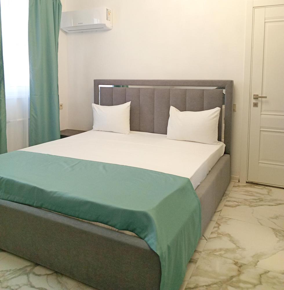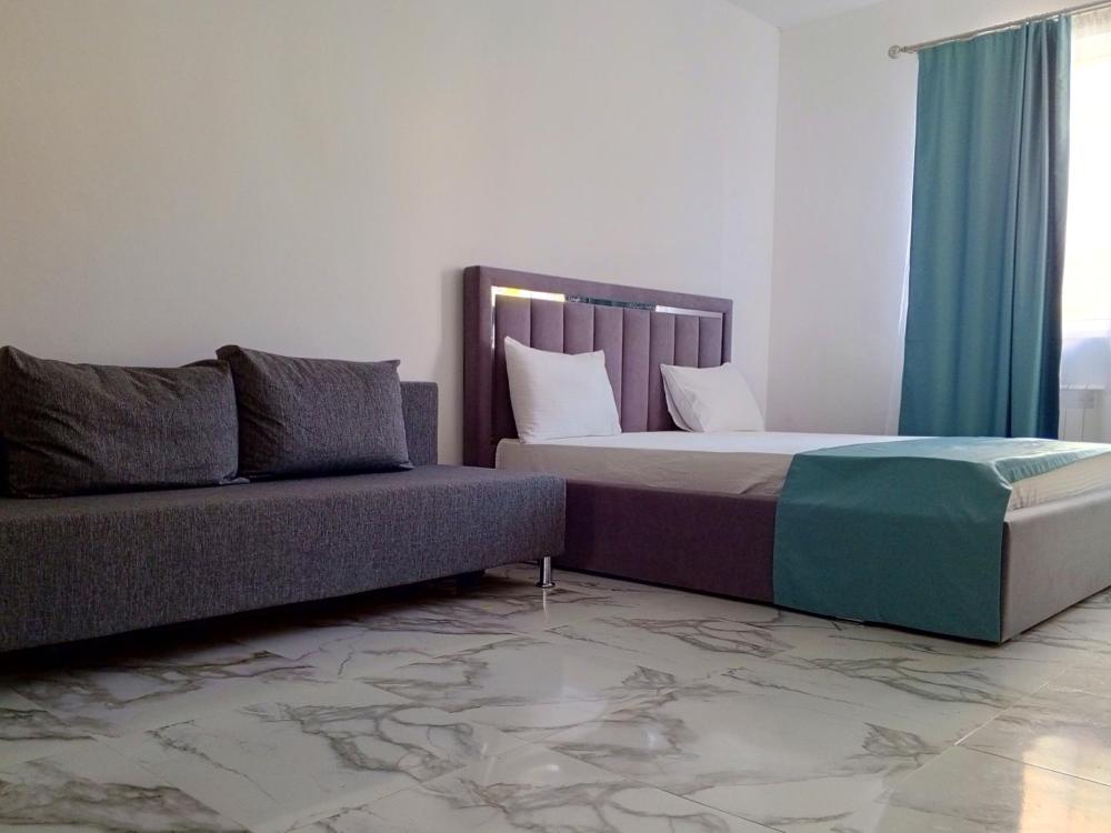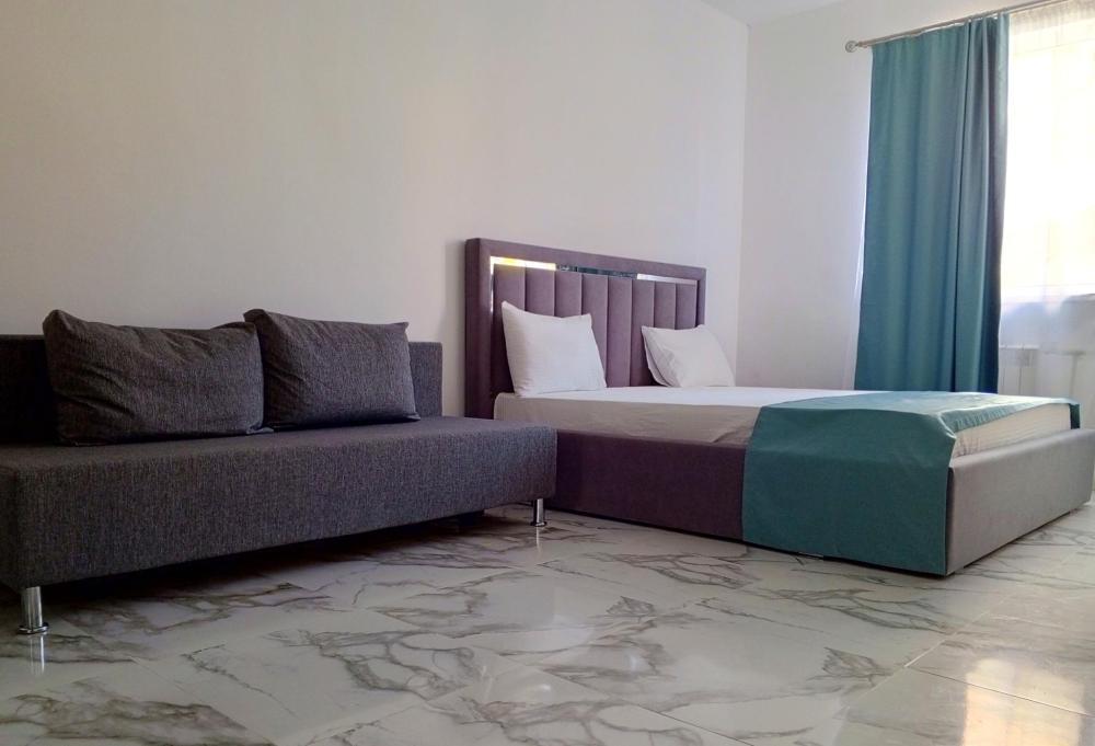 Четырехместная комната стандарт с одной двуспальной кроватью и двуспальным диваном без балкона, площадью 20 кв.м. Оснащение: двухспальная кровать, диван, холодильник, телевизор, кондиционер, чайник, собственный санузел, фен. В общем доступе утюг, гладильная доска сушилки для одежды, микроволновая печь. Уборка и смена белья, полотенец производится на 5-ый день проживания.