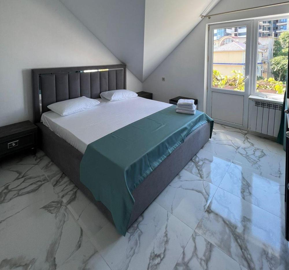 Четырехместная комната стандарт с одной двуспальной кроватью и двуспальным диваном с балконом, площадью 18 кв.м. Оснащение: двухспальная кровать, диван, холодильник, телевизор, кондиционер, чайник, балкон, собственный санузел, фен. Комнаты данной категории расположены на 2 и 3 этаже. В общем доступе утюг, гладильная доска сушилки для одежды, микроволновая печь. Уборка и смена белья, полотенец производится на 5-ый день проживания.