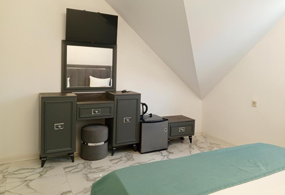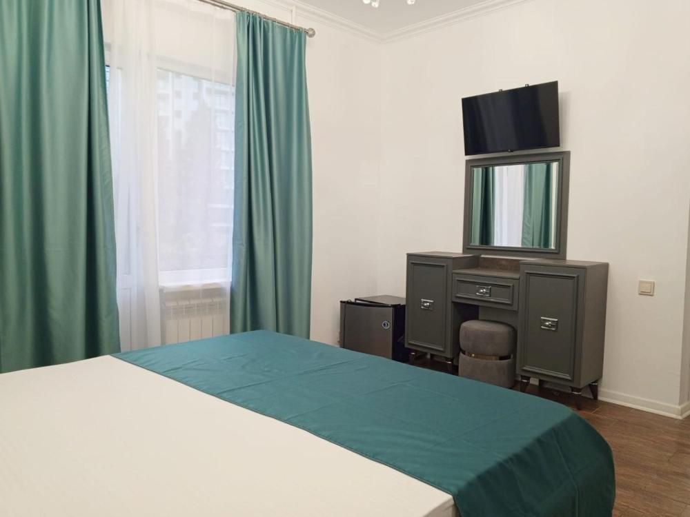 Двухместная комната стандарт с одной двуспальной кроватью без балкона, площадью 13 кв.м. Оснащение: двухспальная кровать, холодильник, телевизор, кондиционер, чайник, собственный санузел, фен. Комнаты данной категории расположены на 3 и 4 этаже. В общем доступе утюг, гладильная доска сушилки для одежды, микроволновая печь. Уборка и смена белья, полотенец производится на 5-ый день проживания.