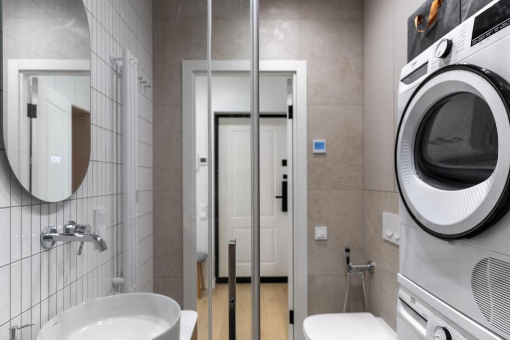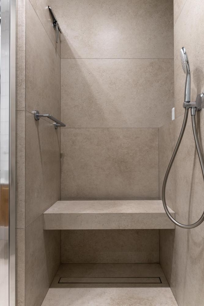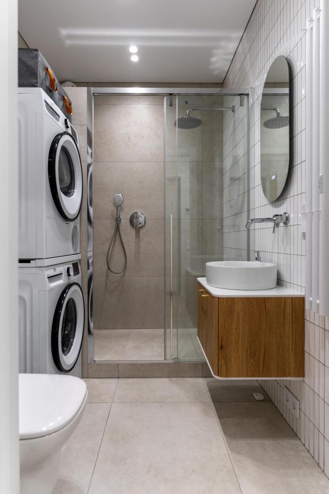 Просторная душевая кабина со скамьей позволит Вам комфортно принять душ, как тропический, так и обычный. Ванная комната оснащена также полноразмерной стиральной и сушильной машиной. Установлен проточный водонагреватель на случай отключения воды, а также электрический полотенцесушитель.
