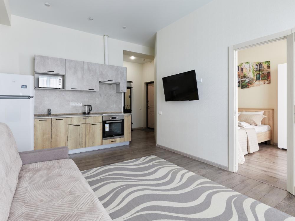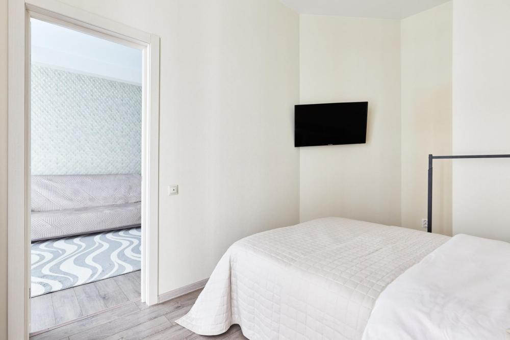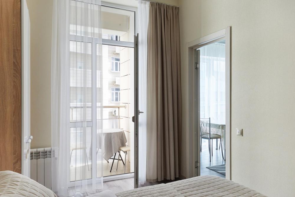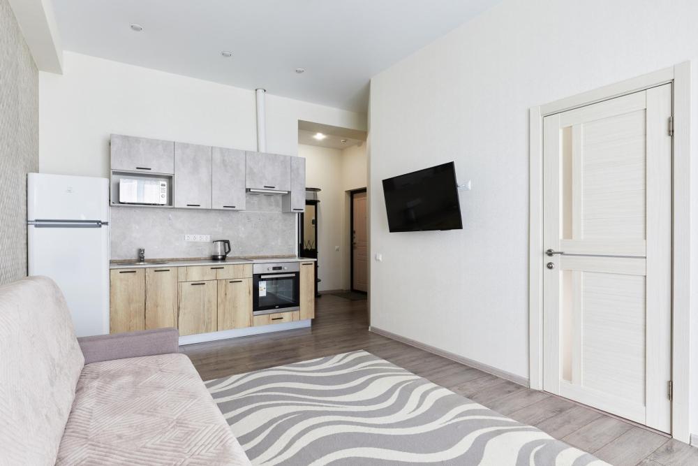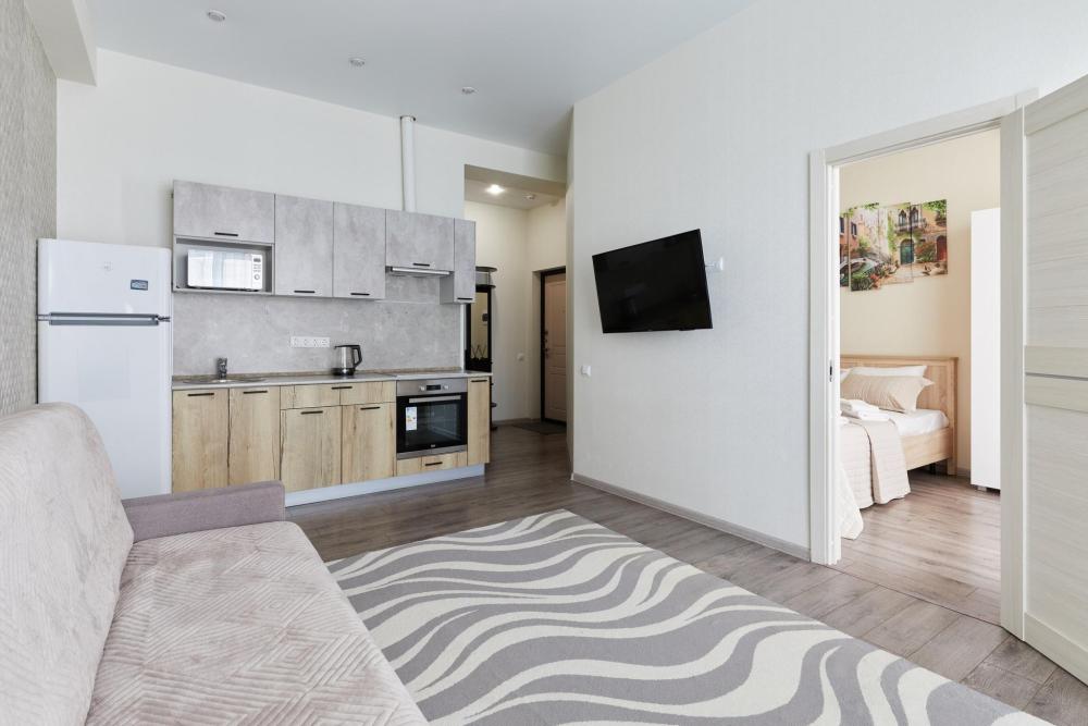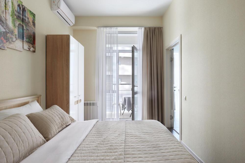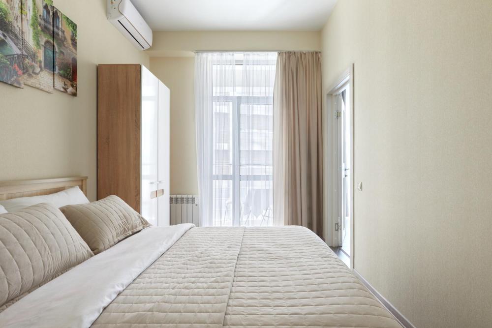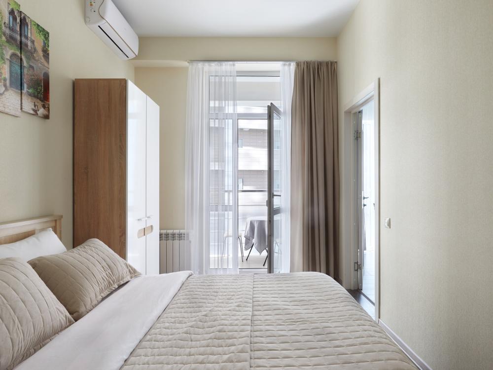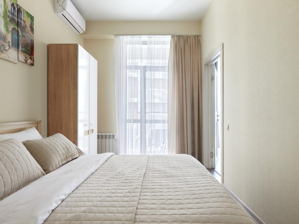 В квартире отдельная изолированная спальня с выходом на балкон и гостиная с зоной кухни. Для сна имеются двуспальная кровать (ширина 1,4м) и раскладной двуспальный диван. Имеется дополнительное спальное место - раскладушка. В зоне кухни электрическая варочная панель, духовой шкаф, микроволновая печь, чайник, холодильник и вся необходимая посуда. А также для вашего удобства кондиционер, стиральная машина, фен, утюг, гладильная доска, в ванной комнате тропический душ , 2 телевизора со SMART TV, WiFi. С балкона открывается боковой вид на море.