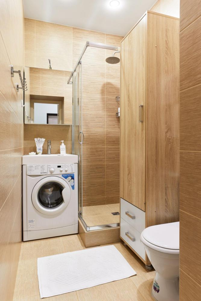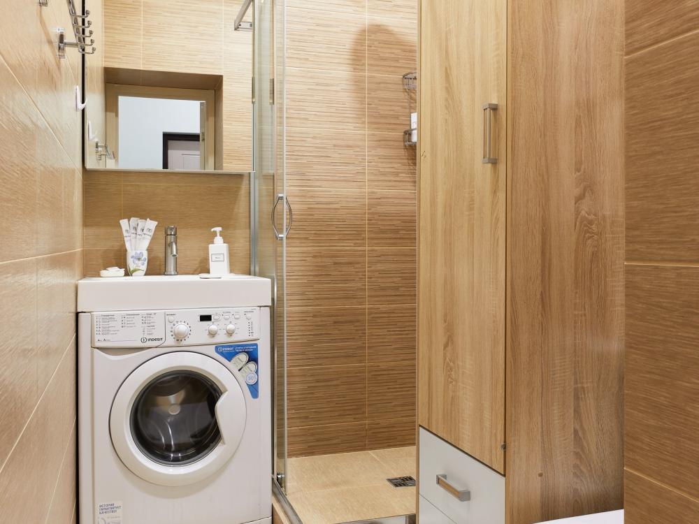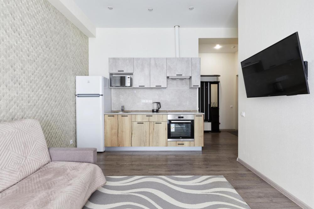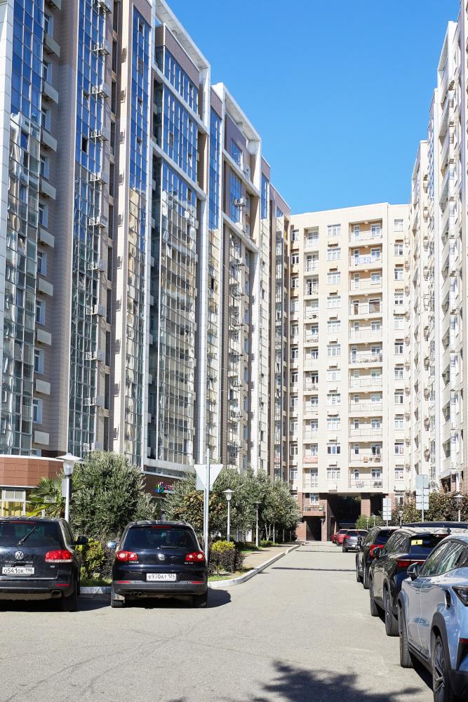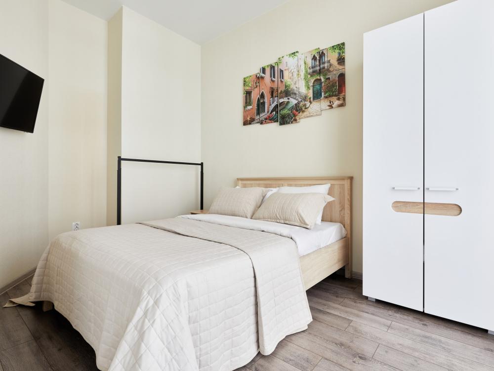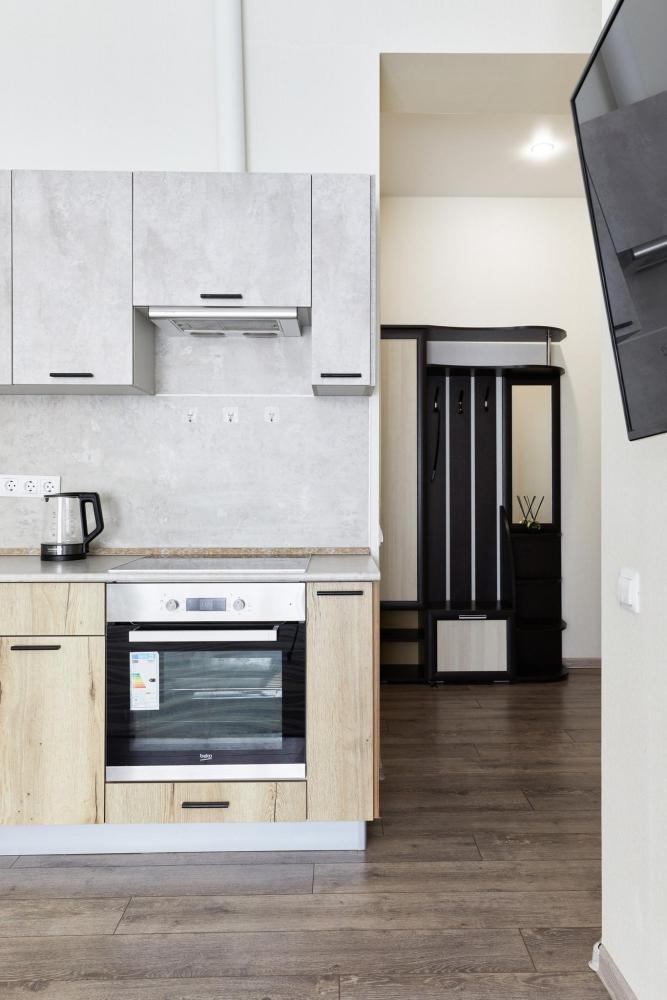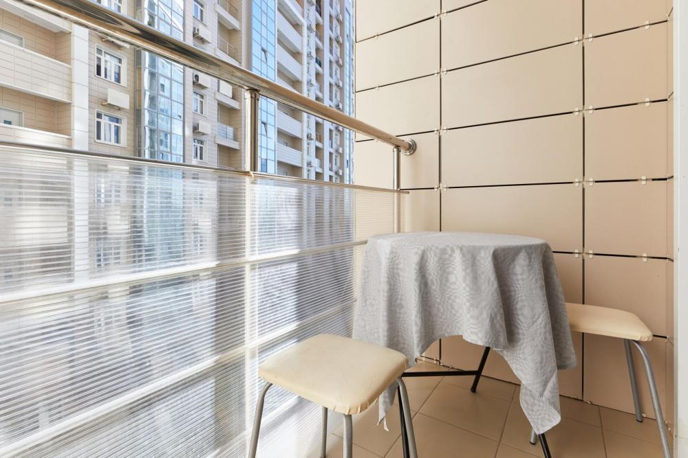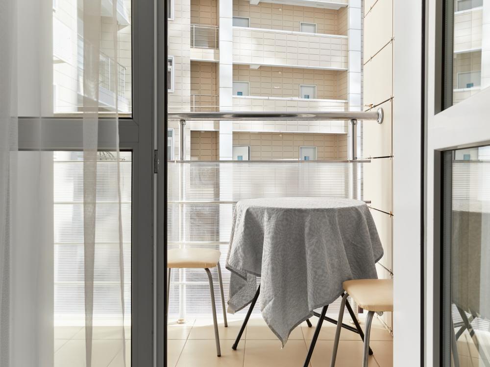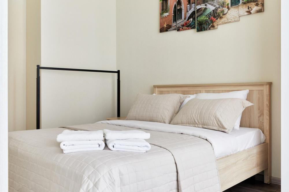 В квартире отдельная изолированная спальня с выходом на балкон и гостиная с зоной кухни. Для сна имеются двуспальная кровать (ширина 1,4м) и раскладной двуспальный диван. Имеется дополнительное спальное место - раскладушка. В зоне кухни электрическая варочная панель, духовой шкаф, микроволновая печь, чайник, холодильник и вся необходимая посуда. А также для вашего удобства кондиционер, стиральная машина, фен, утюг, гладильная доска, в ванной комнате тропический душ , 2 телевизора со SMART TV, WiFi. С балкона открывается боковой вид на море.